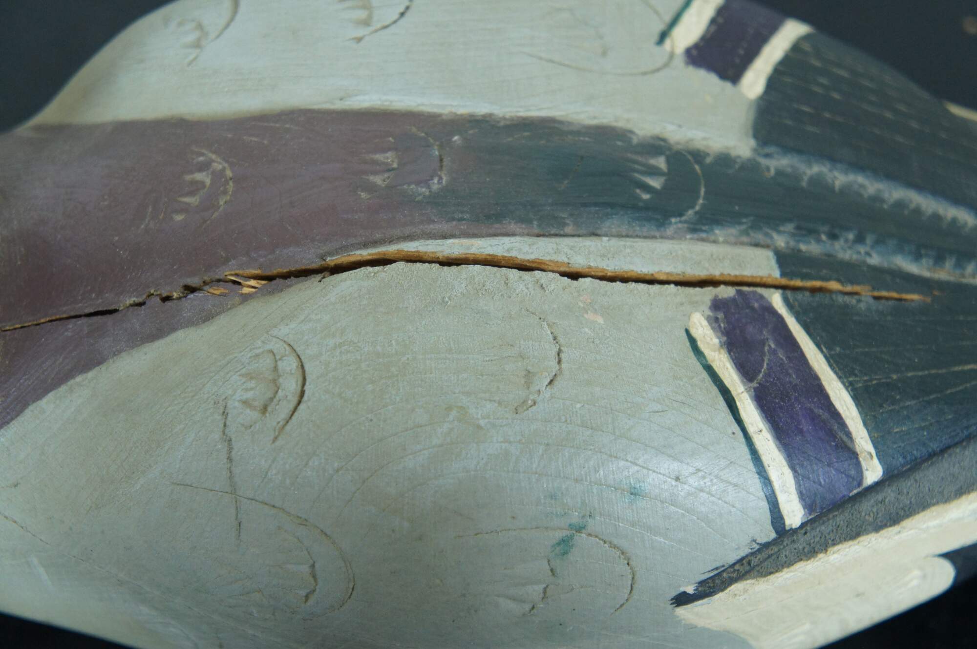 Vintage hand carved and painted wooden mallard duck decoy with amber glass eyes and a flat base.