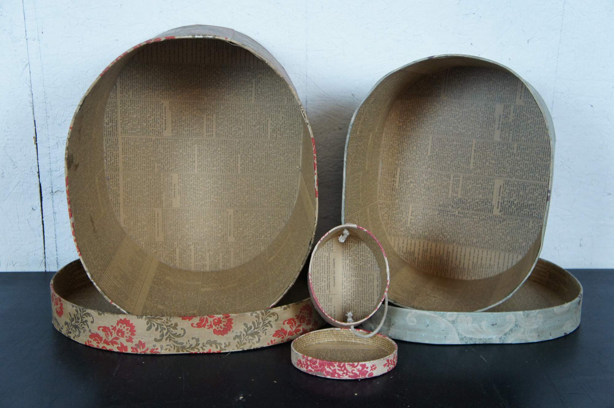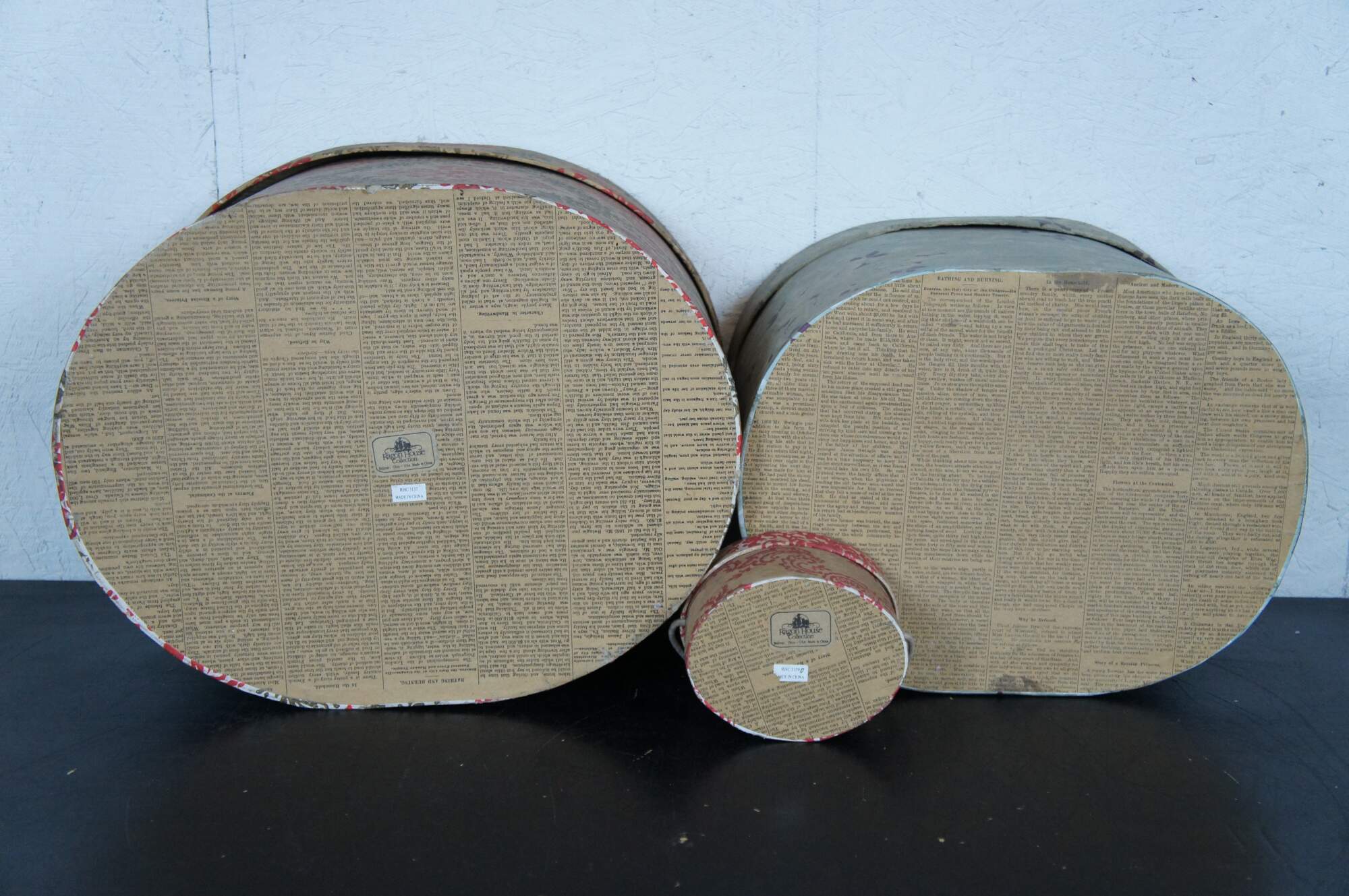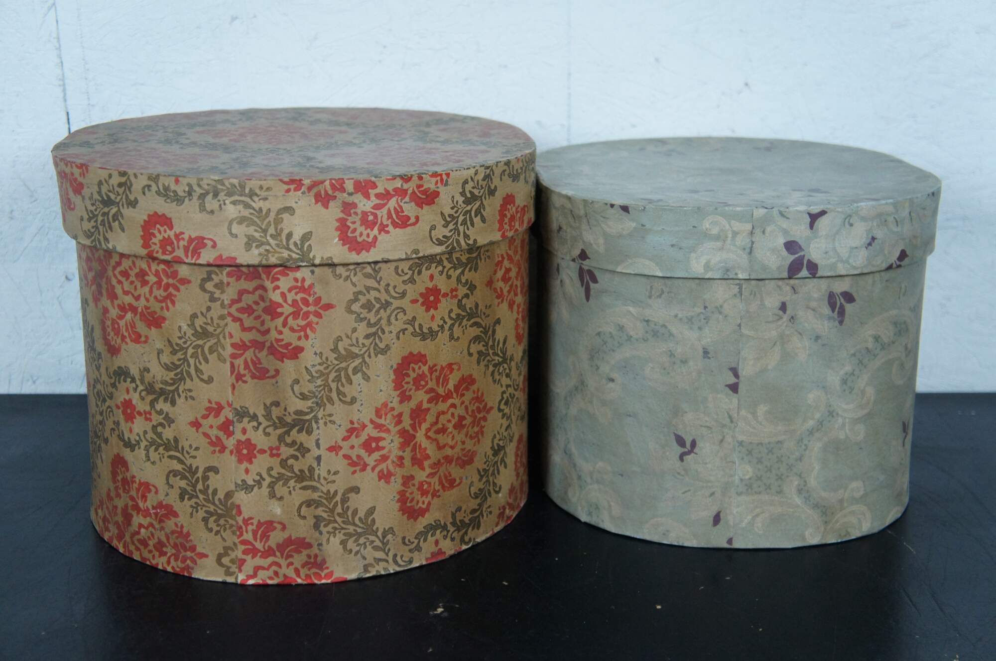Lot of eight folk art style band boxes crafted of paper and other materials. Set includes three antiqued paper mache boxes by Ragon House Collection, a Bath box by Olde Memories, a rectangular Christmas themed box, one paper mache Halloween box, a round red felt covered box, and one black satin covered box with a sequin jack-o-lantern face on the lid.
