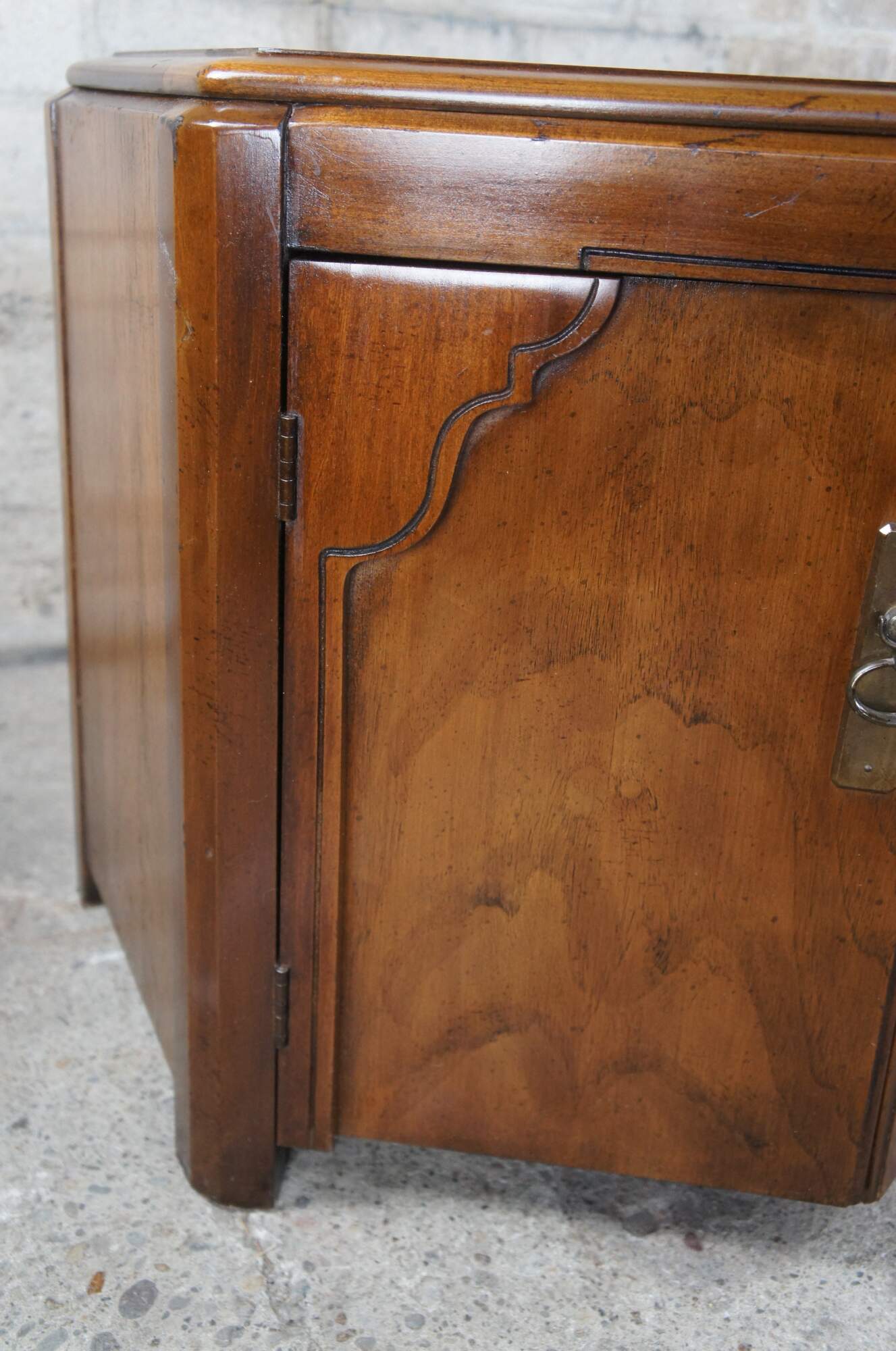 Lane Furniture Mid Century Walnut Chinoiserie Hexagon Drum Tables Side Cabinets