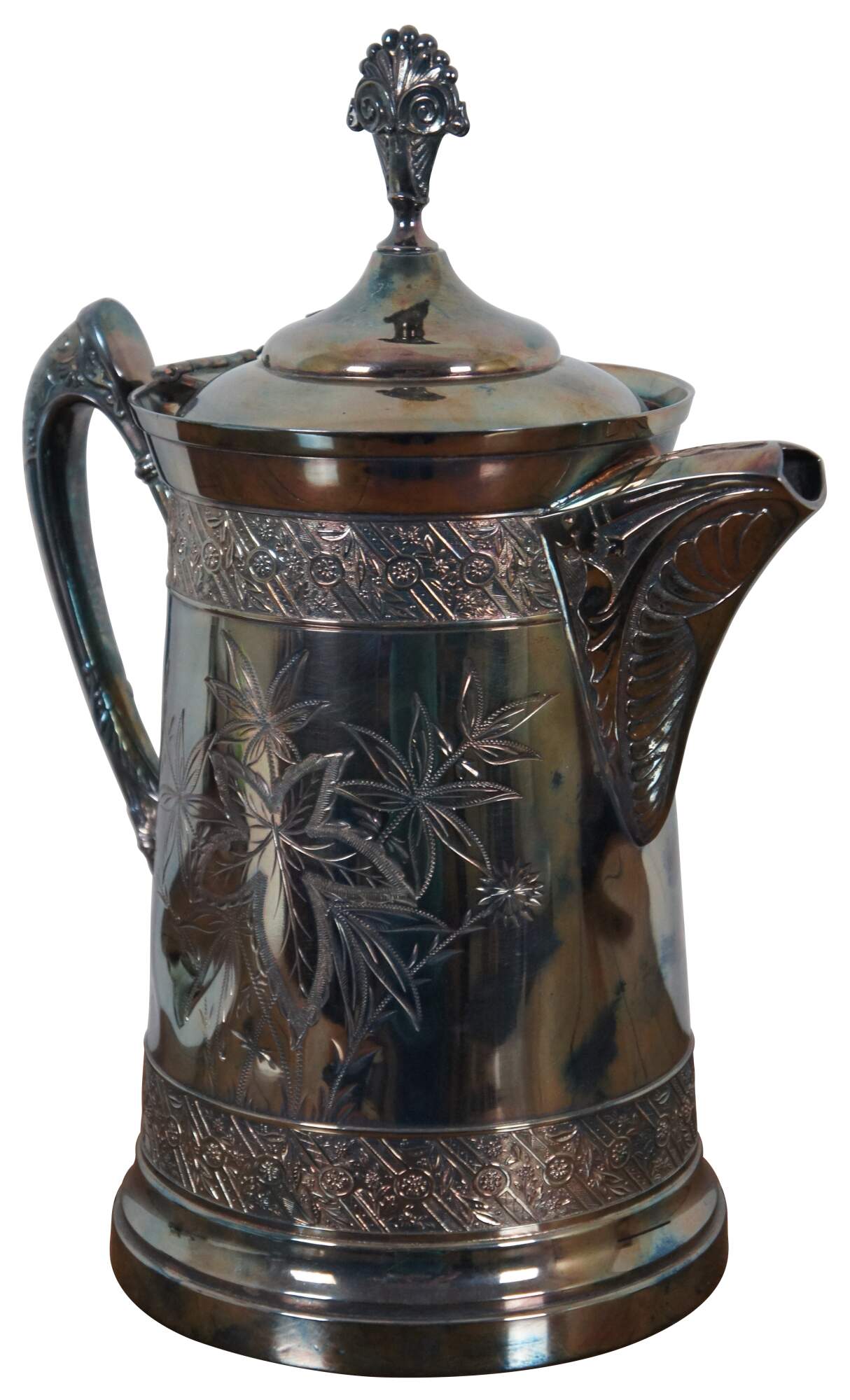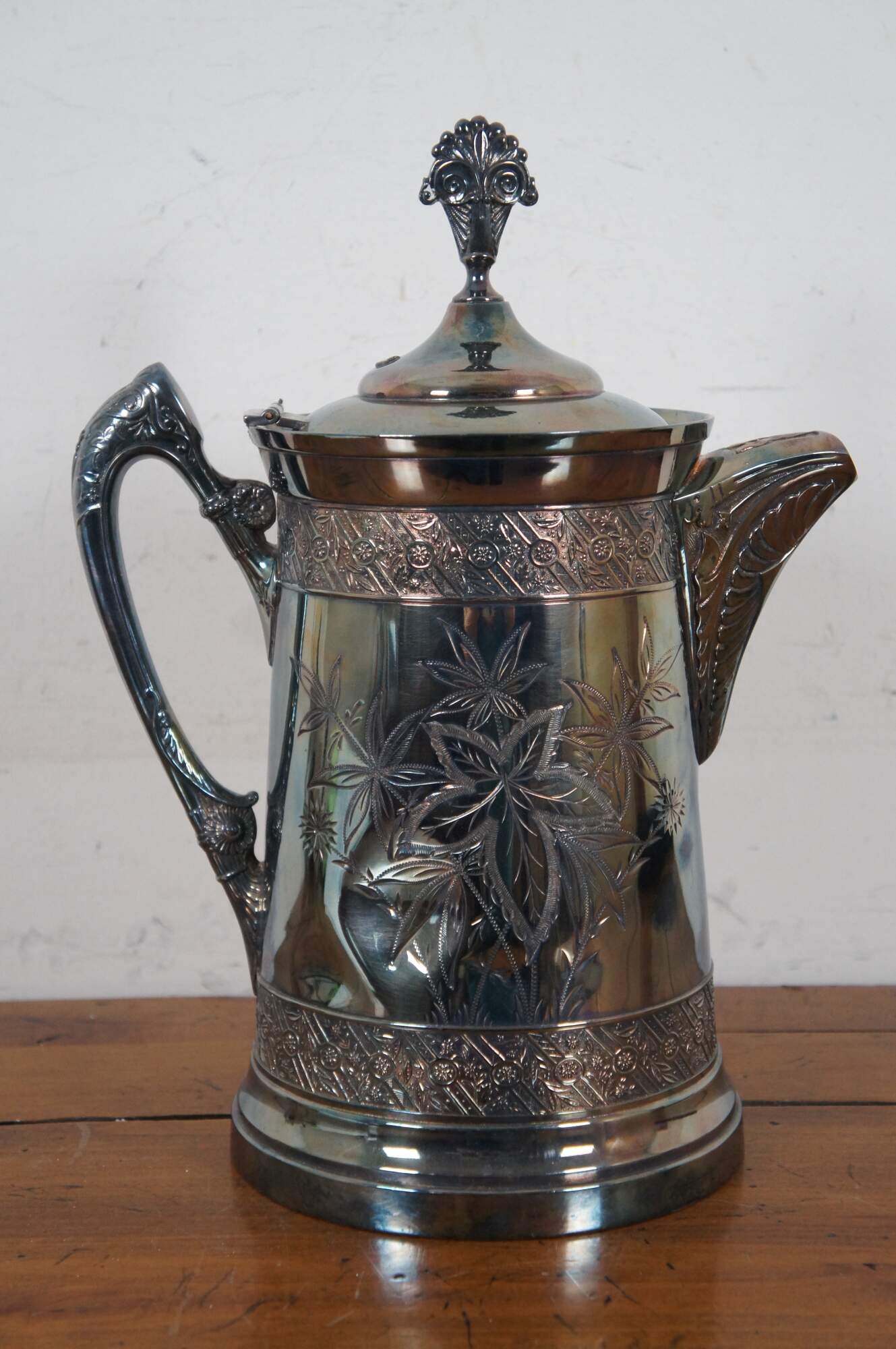 Antique Victorian quadruple silver plate water pitcher by Rogers Manufacturing Company featuring ornate detail with etched floral design.