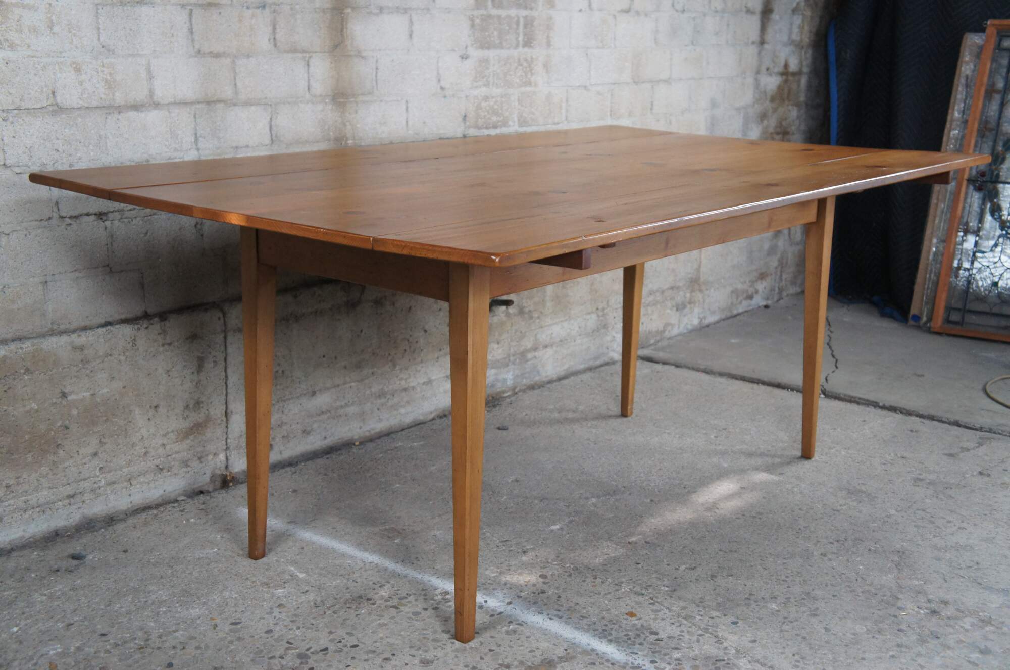 This beautiful table was constructed from solid pine. Features a rectangular form with short drop leafs and square tapered legs. Great for use in the dining room, arts & crafts or even as a console table.