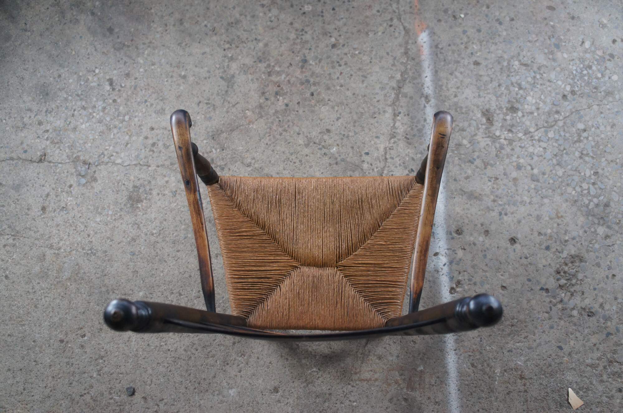 Vintage early american style shaker laddderback chair. Made from oak with black painted finish, naturally distressed allowing the oak to show through in spots. Features a ladderback design and scrolled arms.