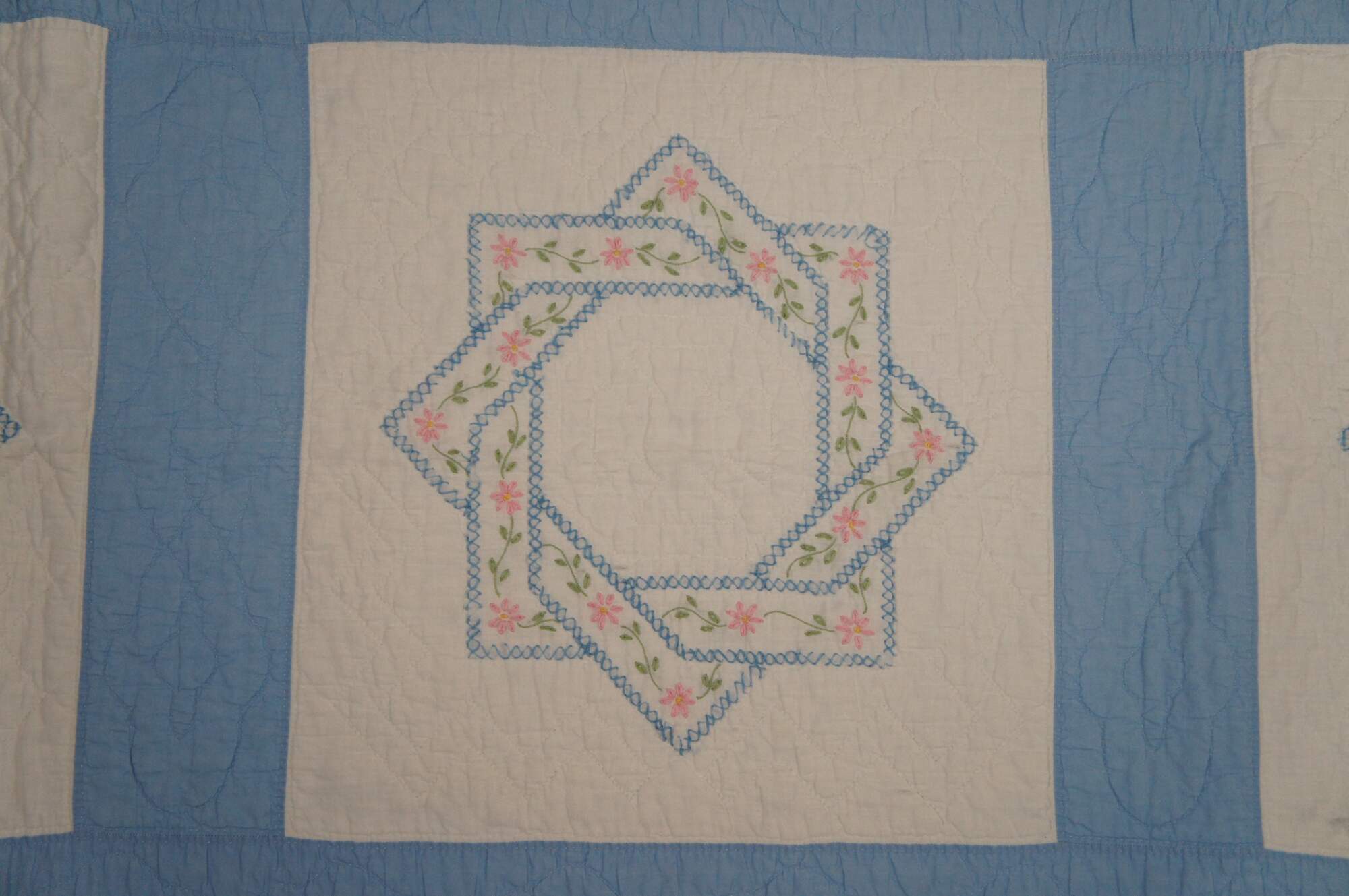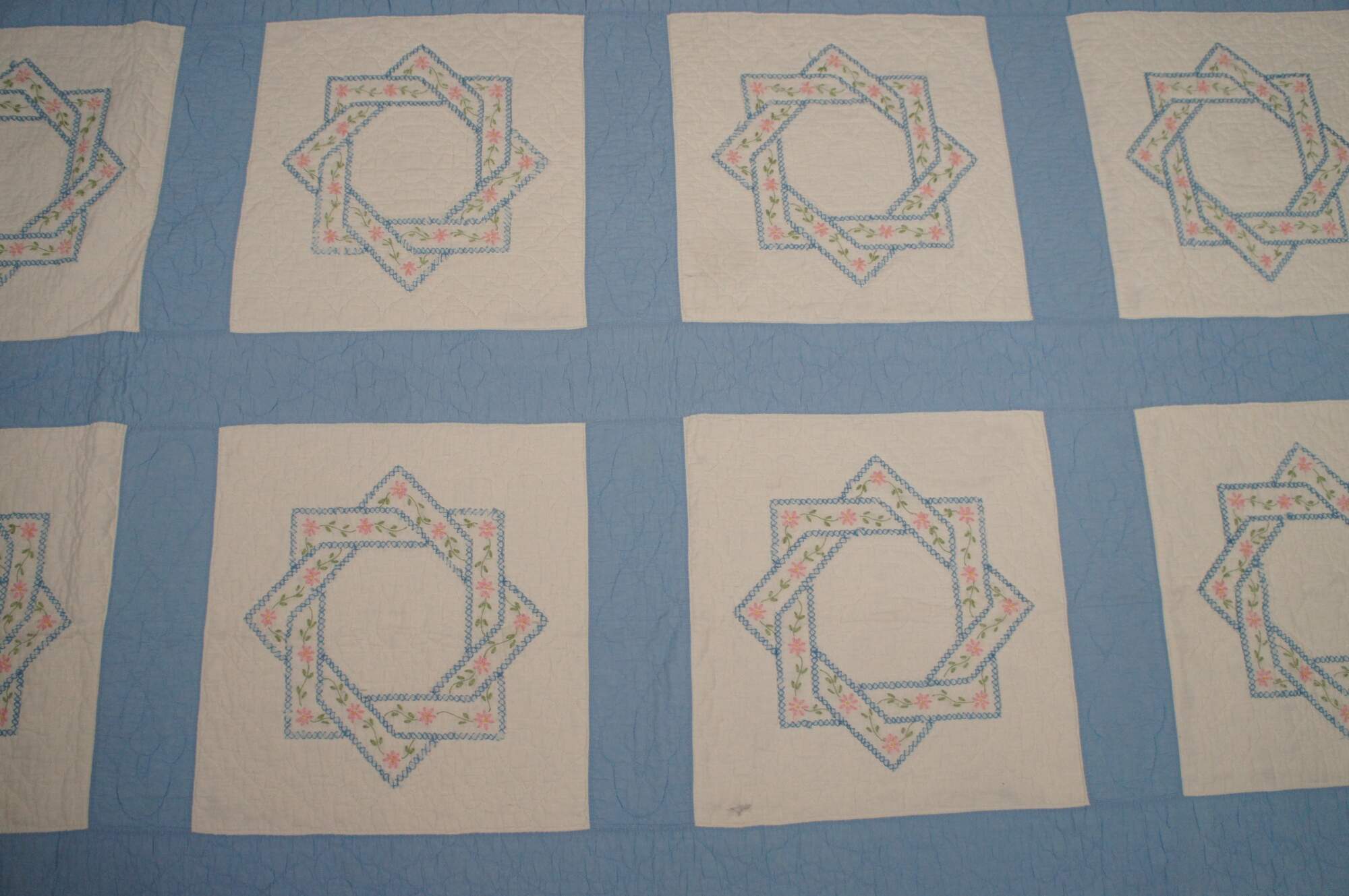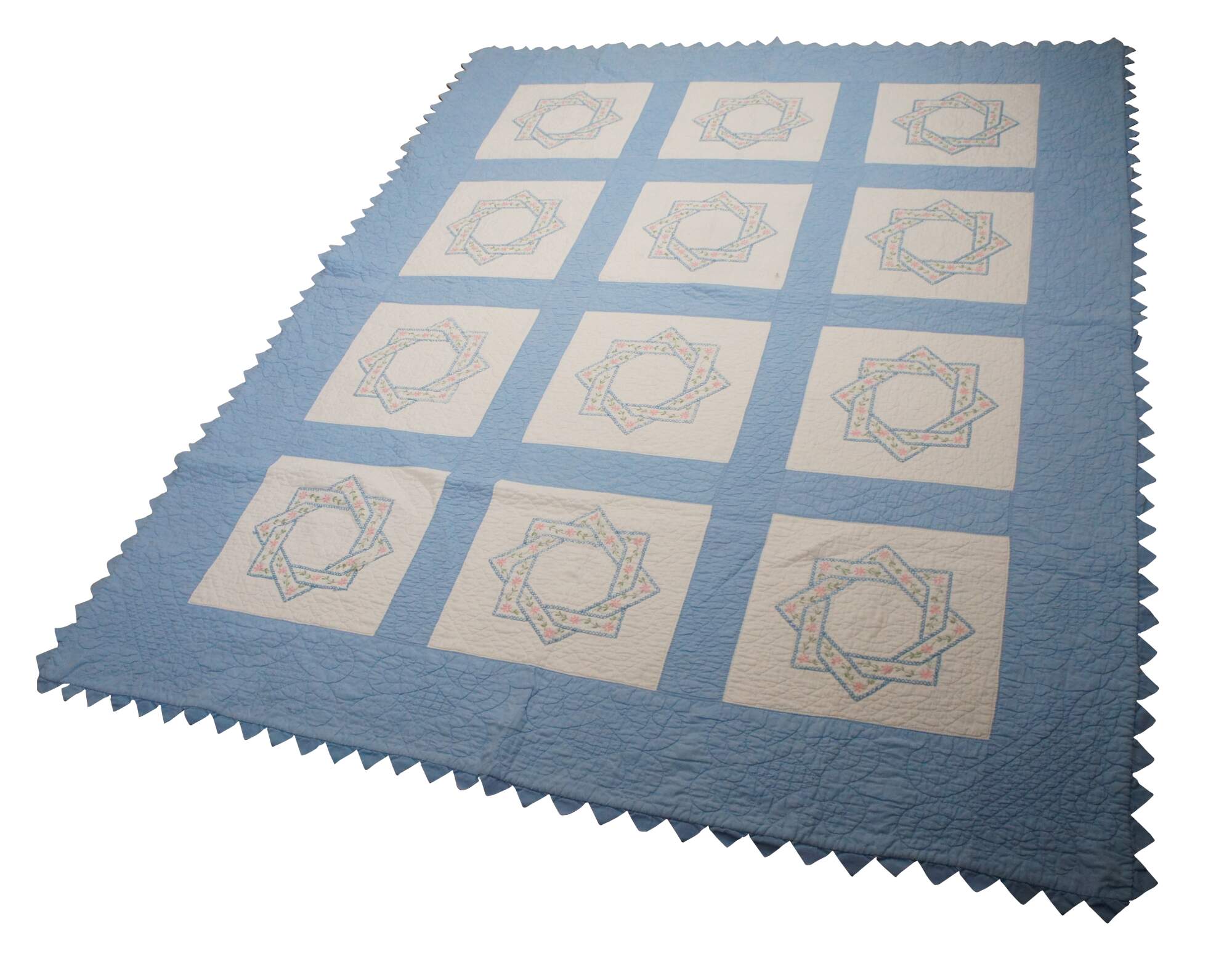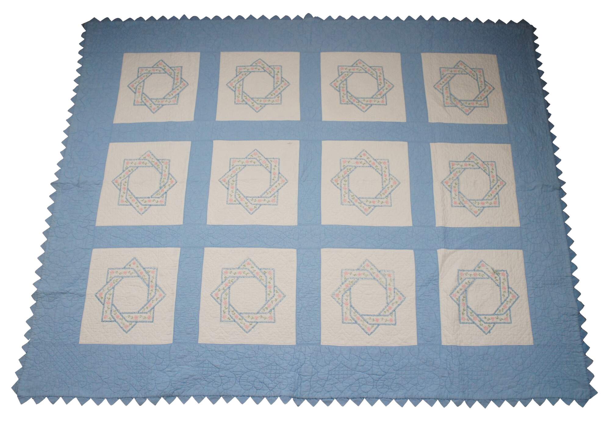 Antique hand stitched blue and white bedspread / blanket / coverlet / quilt with sawtooth border and blocks embroidered with woven interlocked eight pointed stars lined in pink flowers.