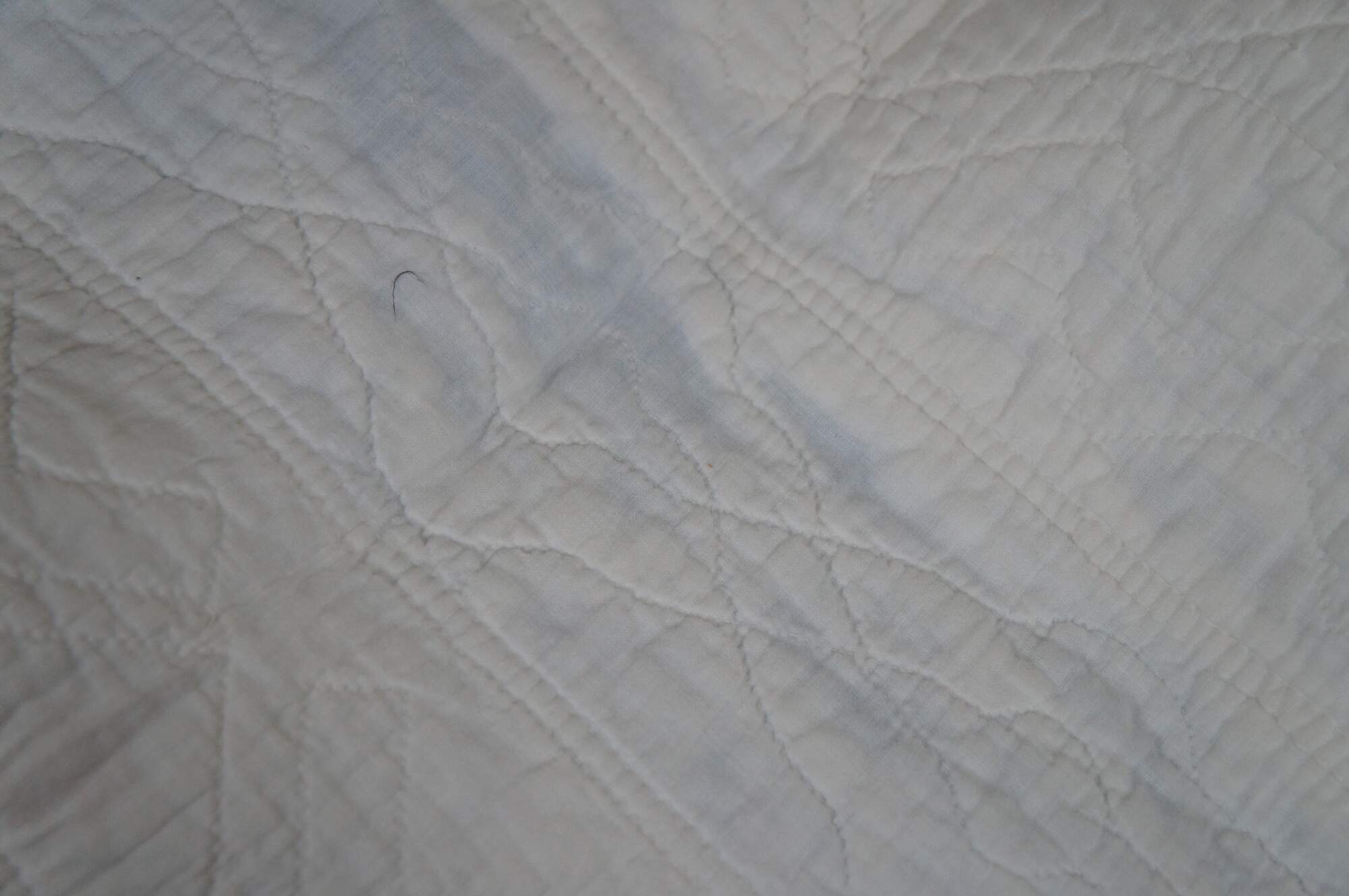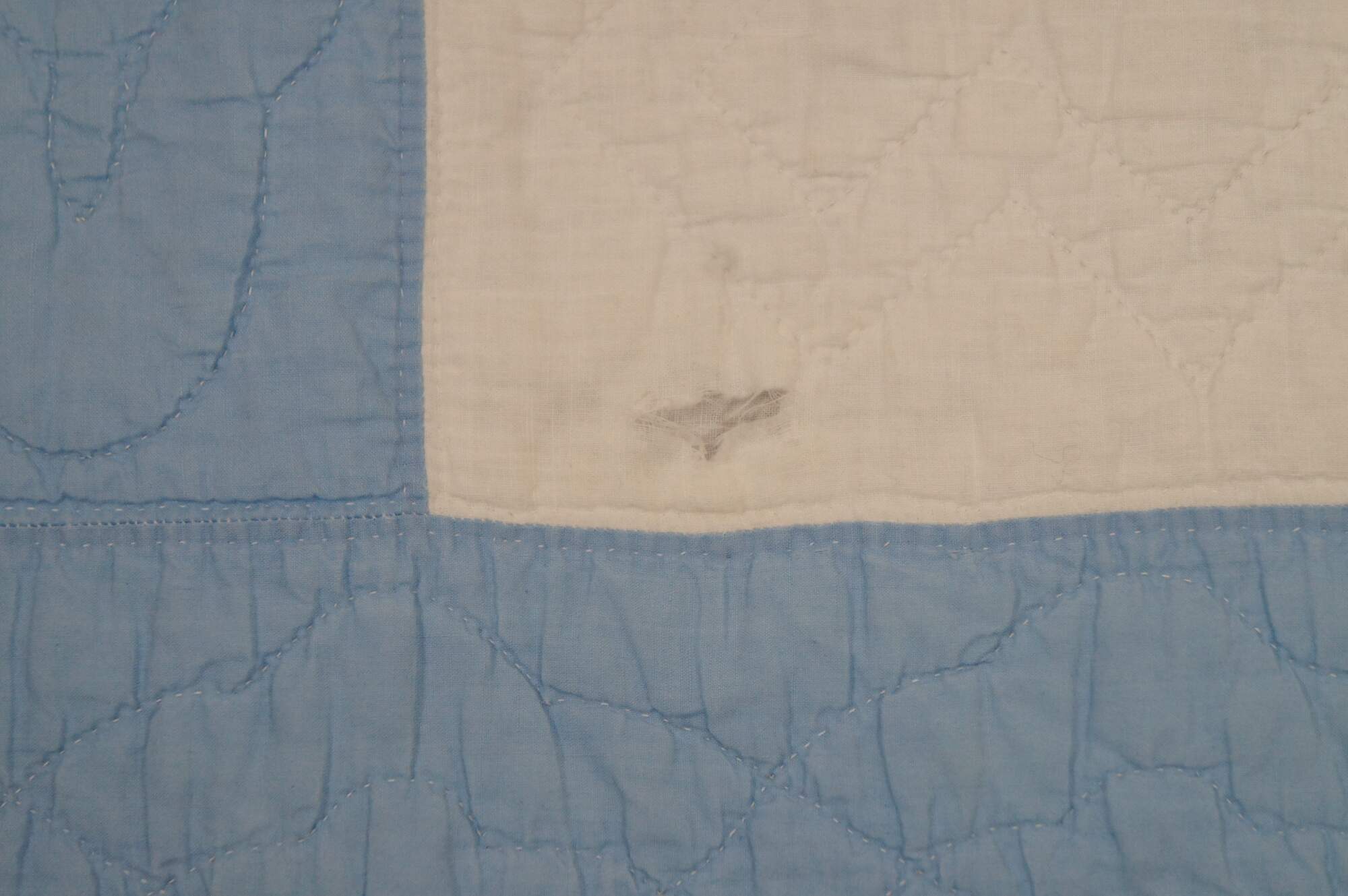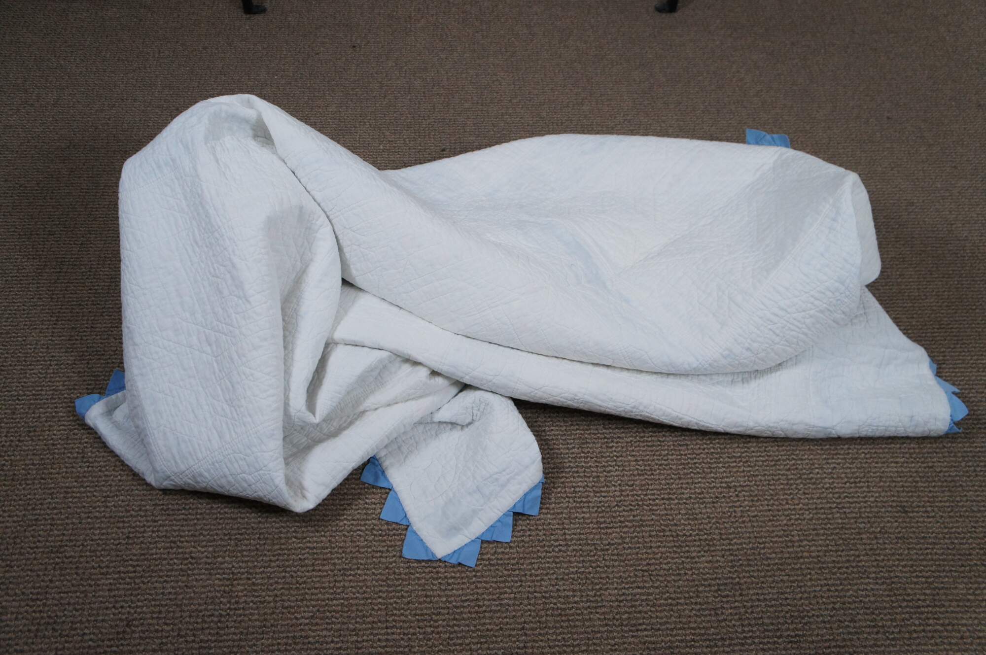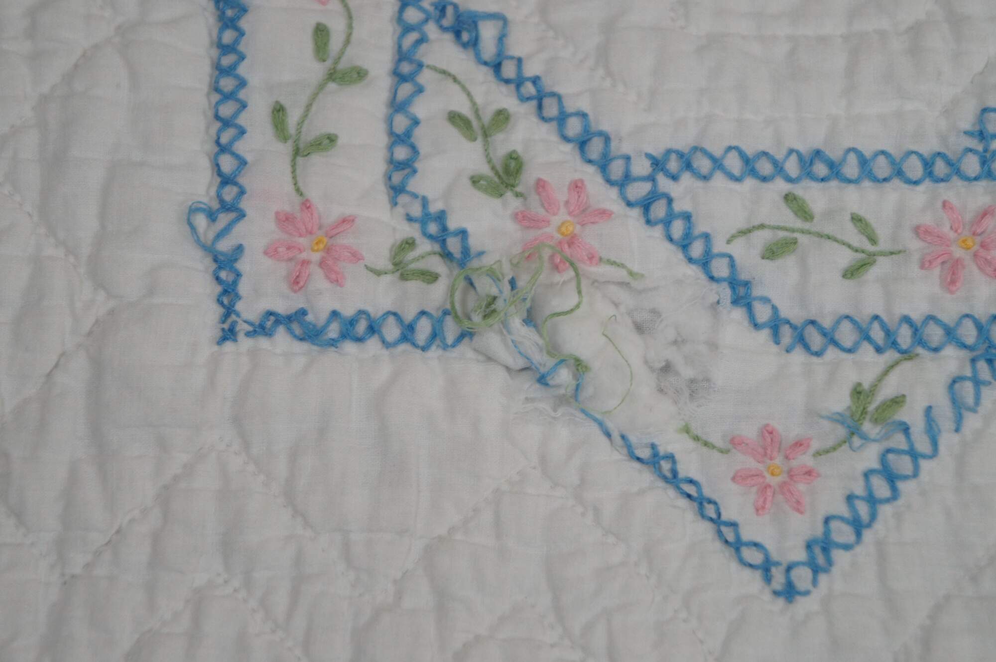 Antique hand stitched blue and white bedspread / blanket / coverlet / quilt with sawtooth border and blocks embroidered with woven interlocked eight pointed stars lined in pink flowers.