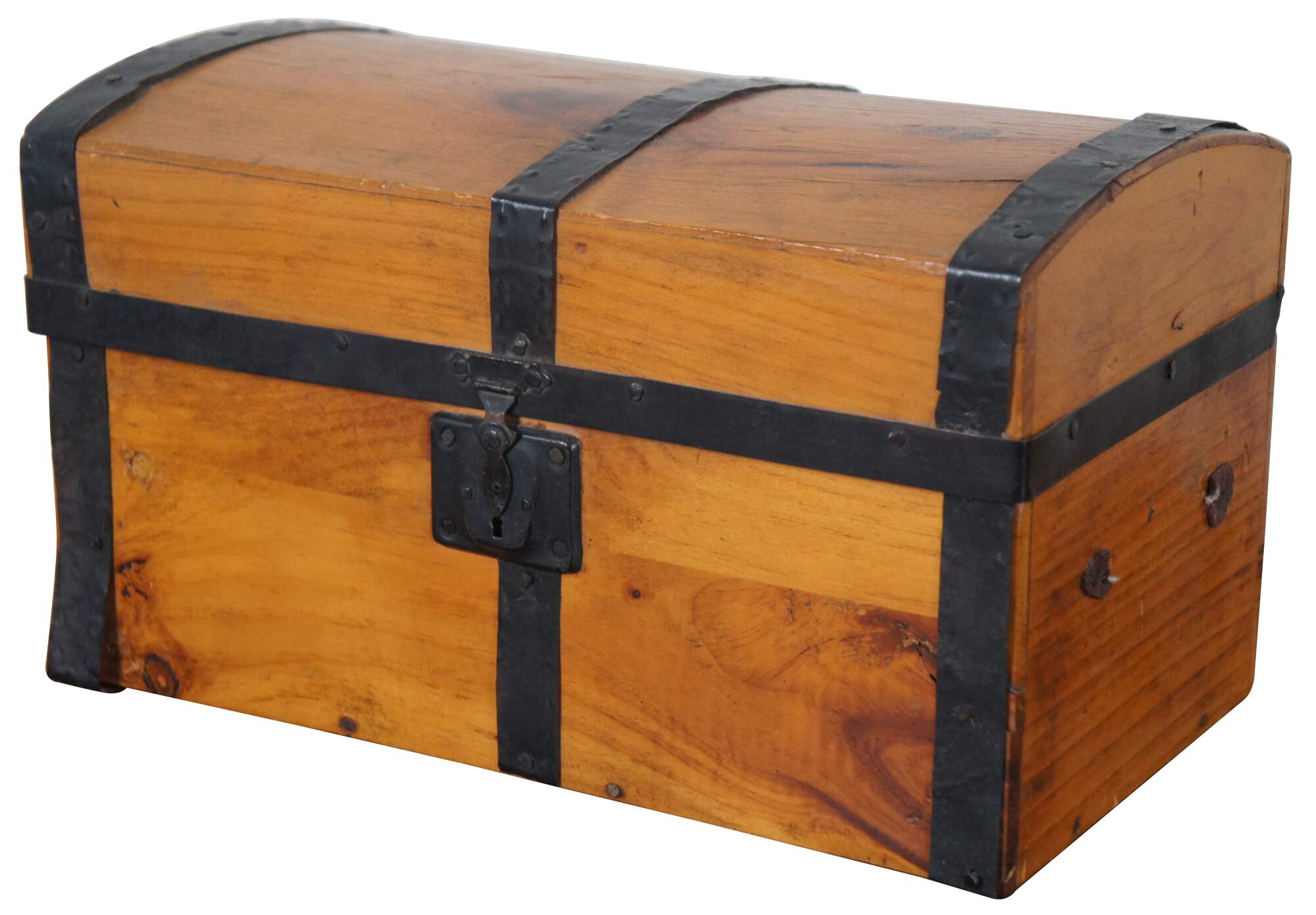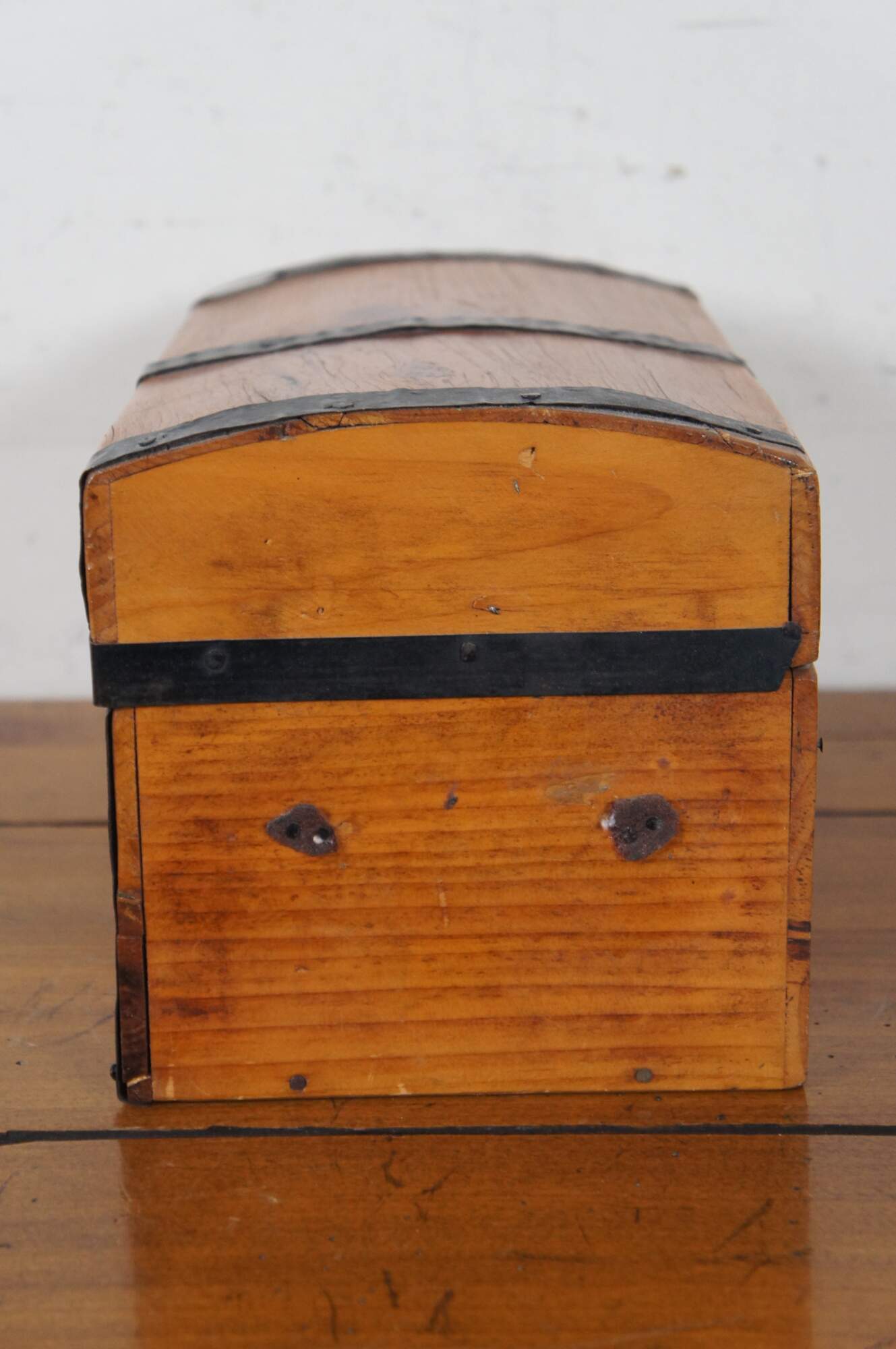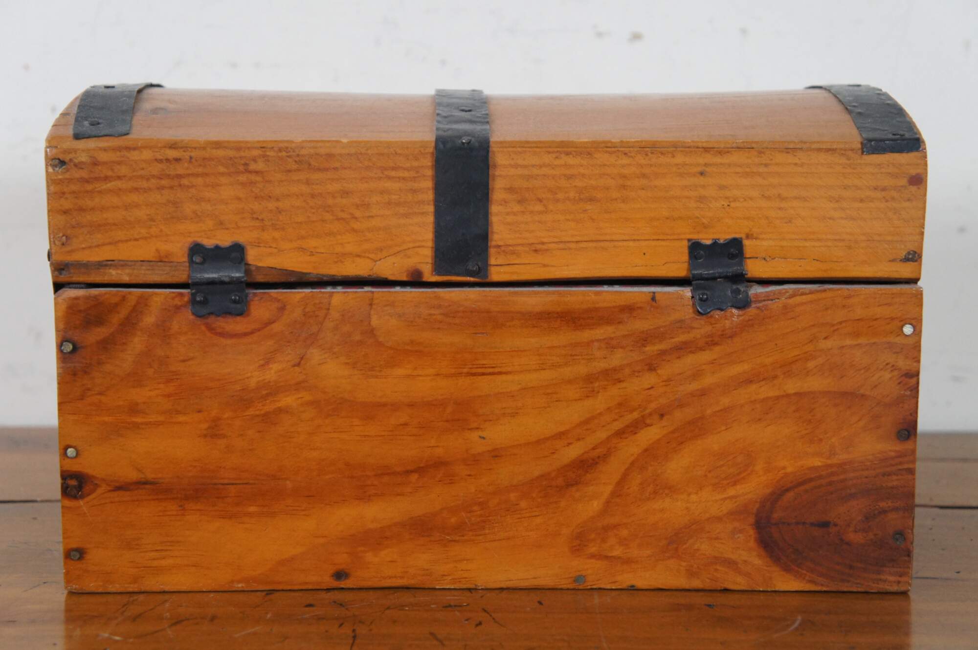 Vintage pine jewelry keepsake storage box or casket featuring a domed top in the form of a steamer trunk or treasure chest with iron banding and interior tray insert lined with red floral print paper.