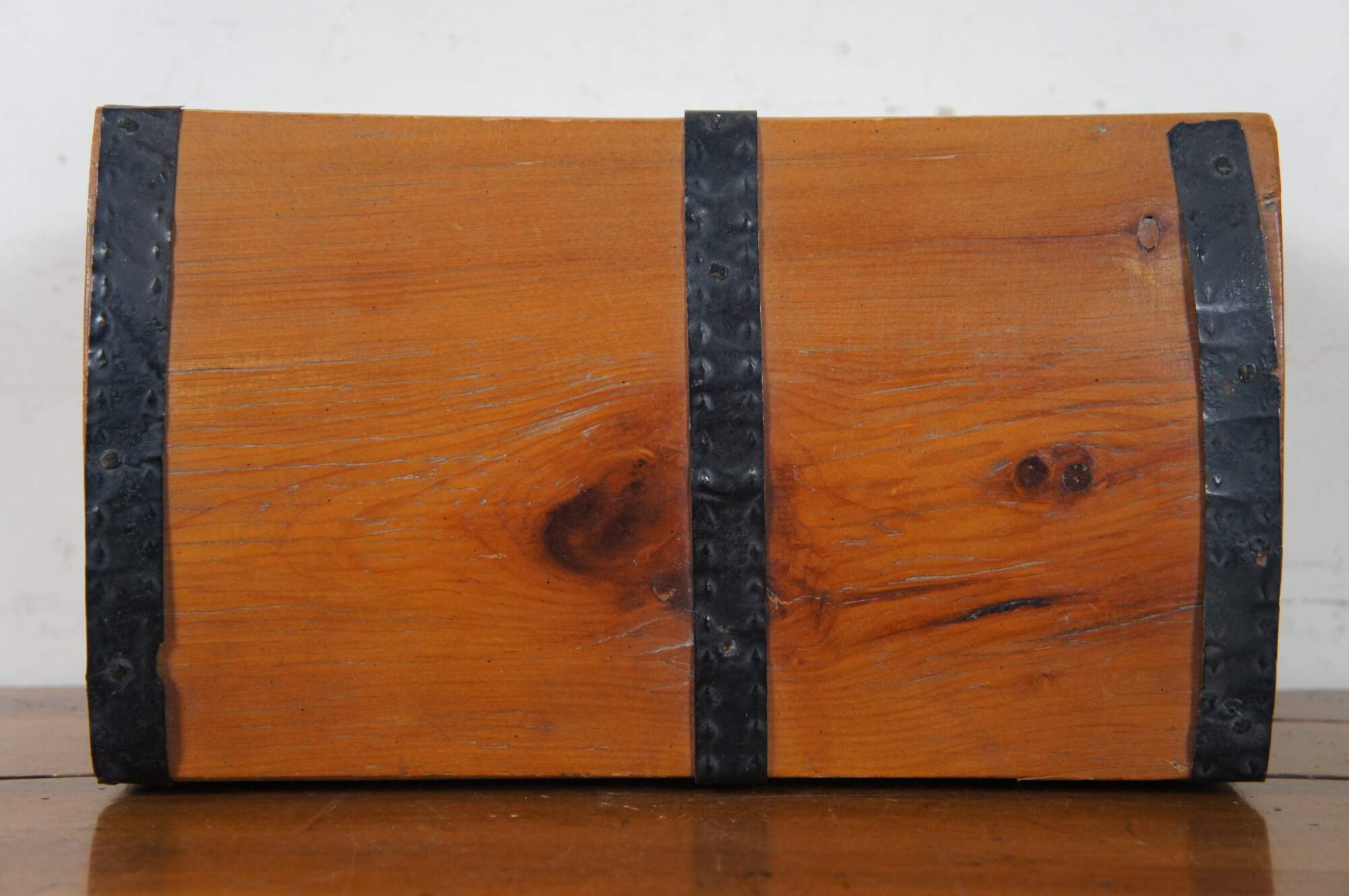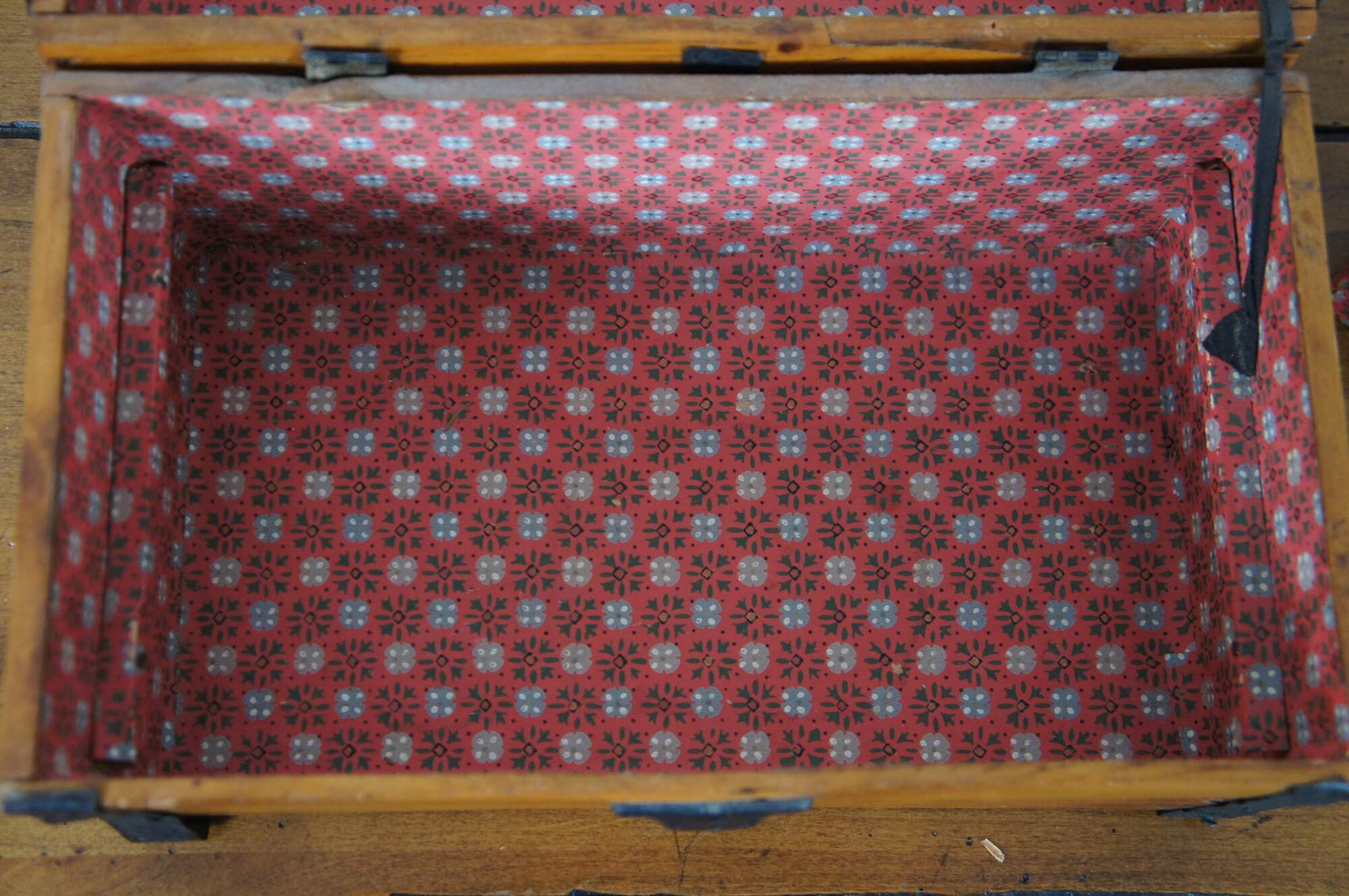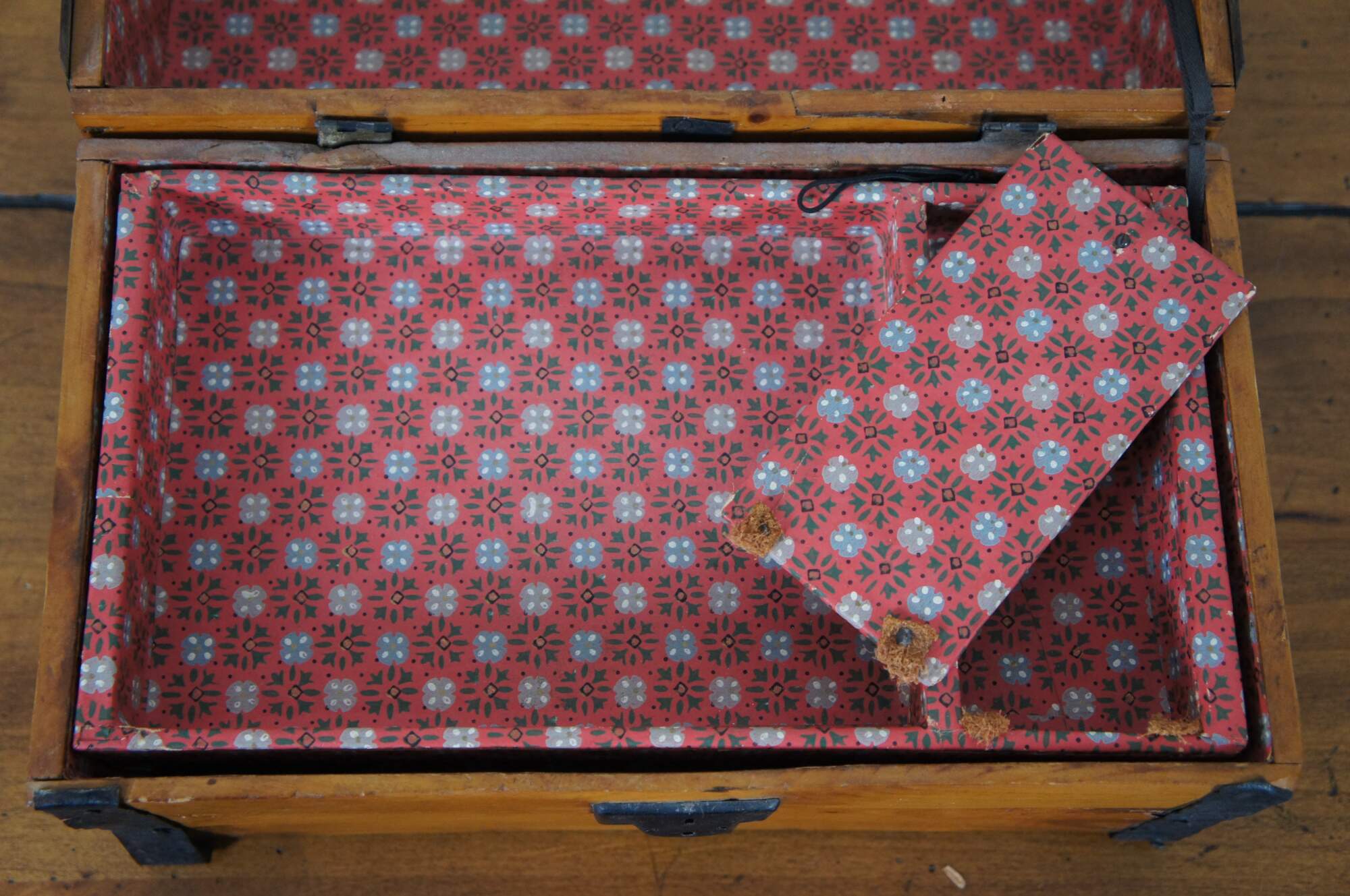 Vintage pine jewelry keepsake storage box or casket featuring a domed top in the form of a steamer trunk or treasure chest with iron banding and interior tray insert lined with red floral print paper.