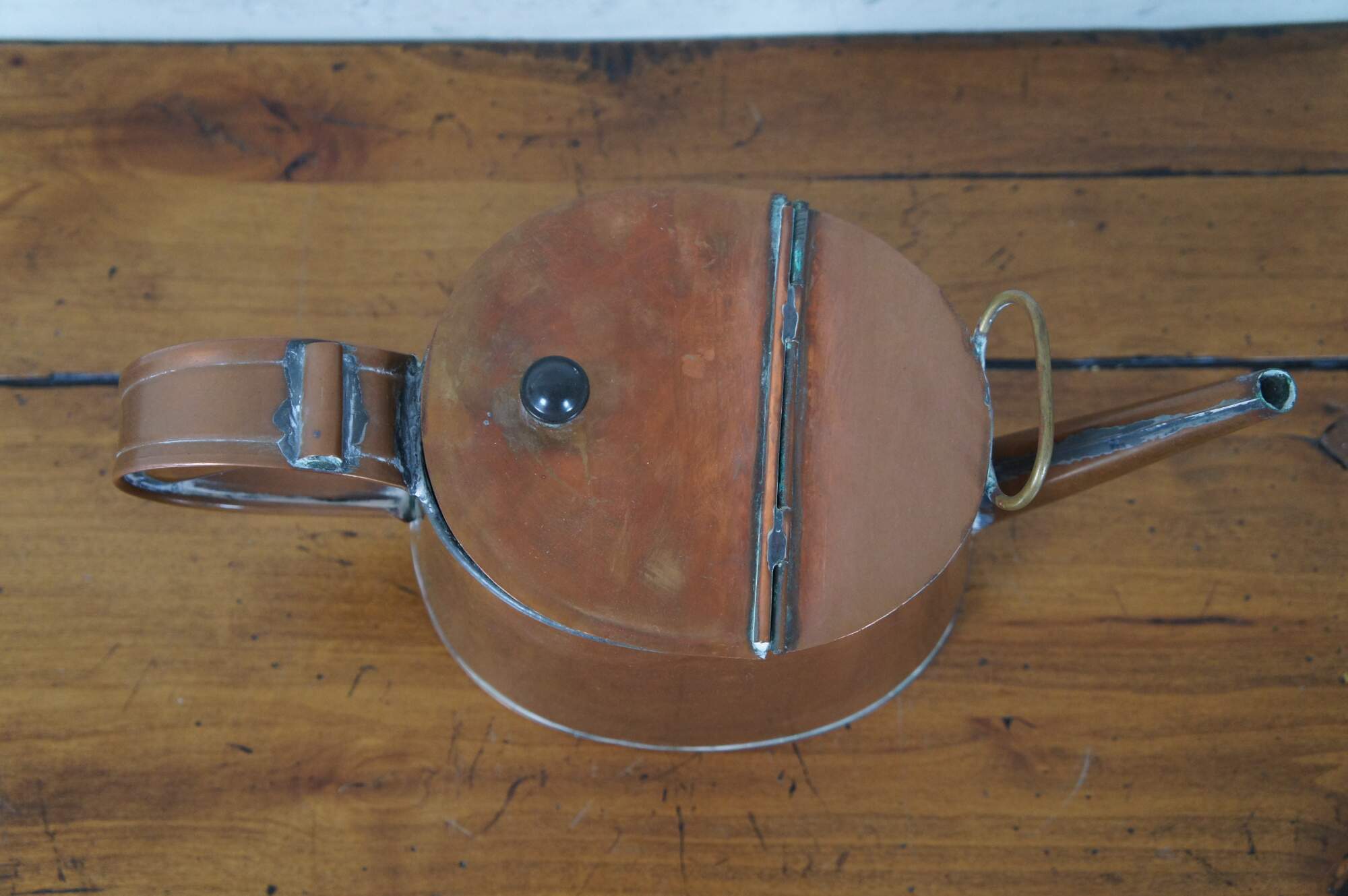 Antique 19th century copper tea kettle with oval body, straight spout, large flip top opening, hefty handle and brass ring at the front.