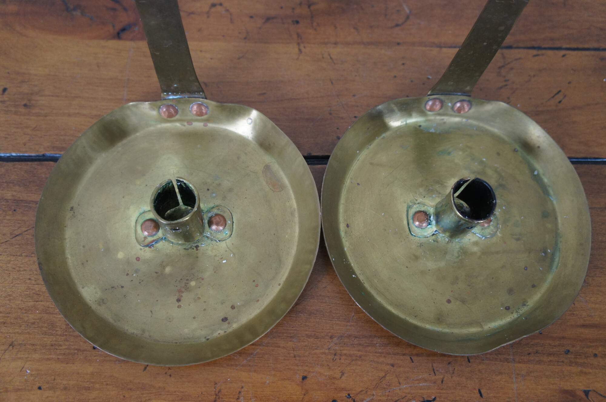 Pair of antique primitive brass chamber stick candle holders in the manner of a frying pan with tall straight handle that could be used to hang the holders as wall sconces.