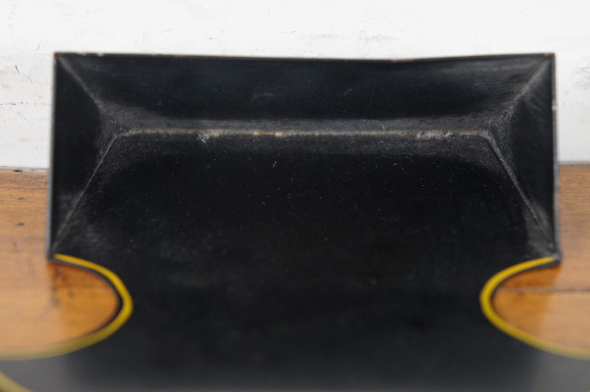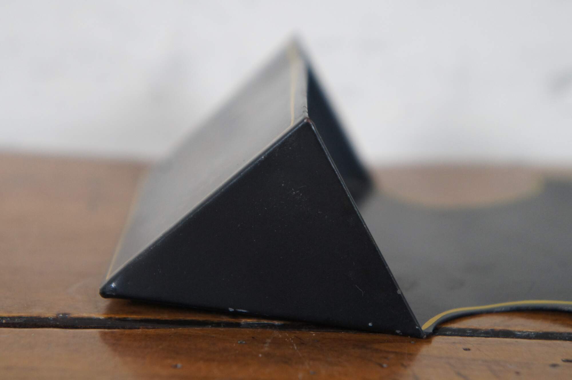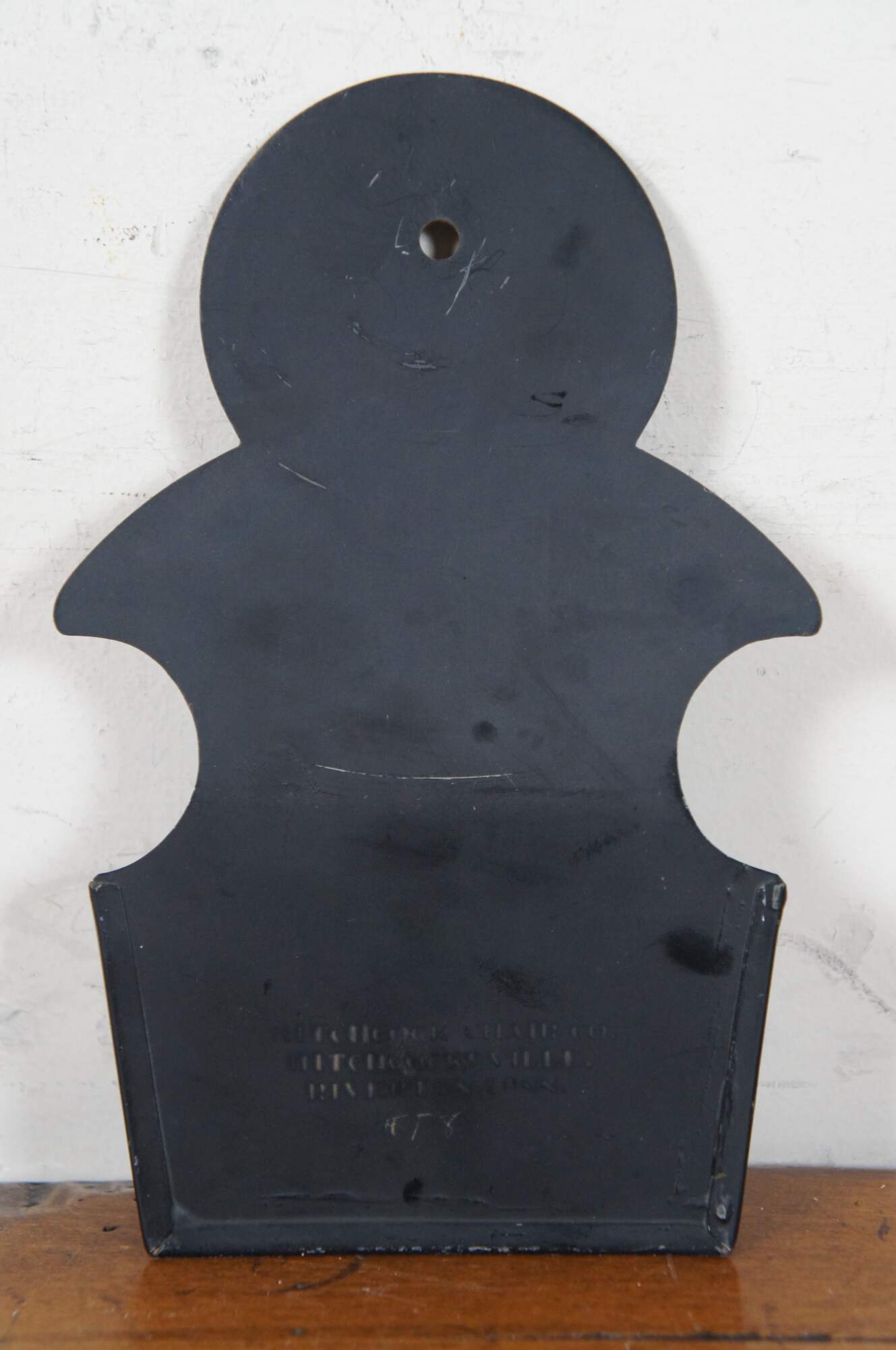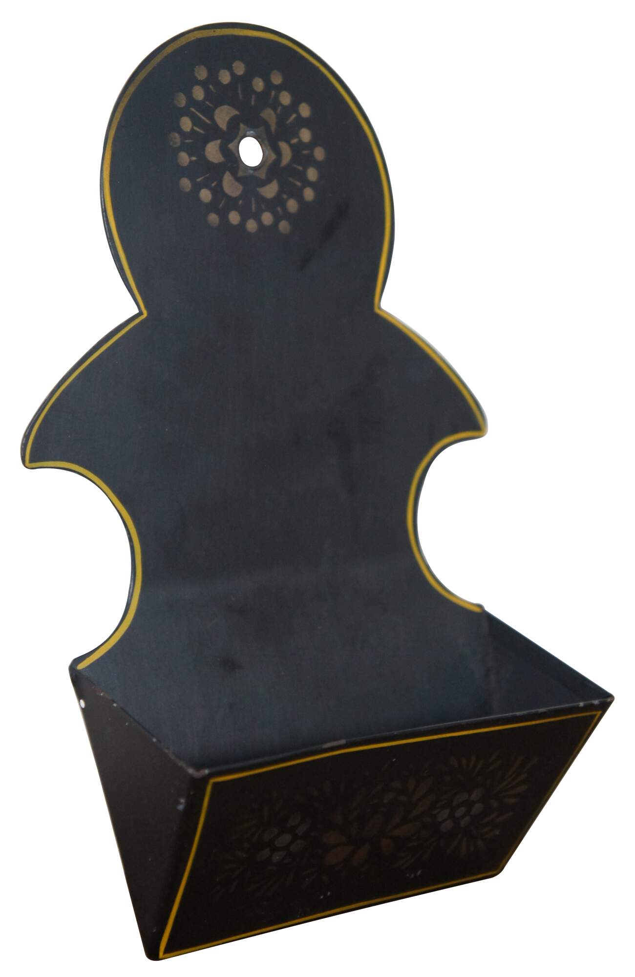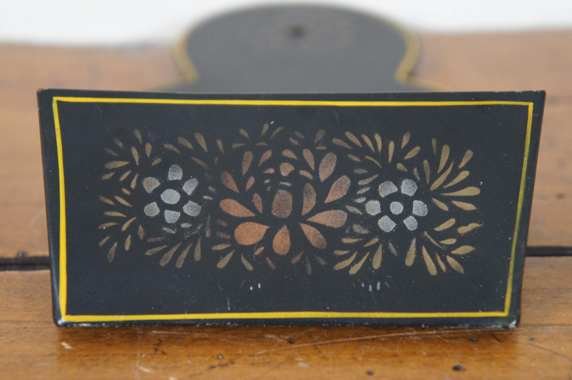 Vintage early American or folk art style black stenciled toleware metal wall hanging match safe / card holder / wall pocket produced by the Hitchcock Chair Co. Fireplace, hearthware.