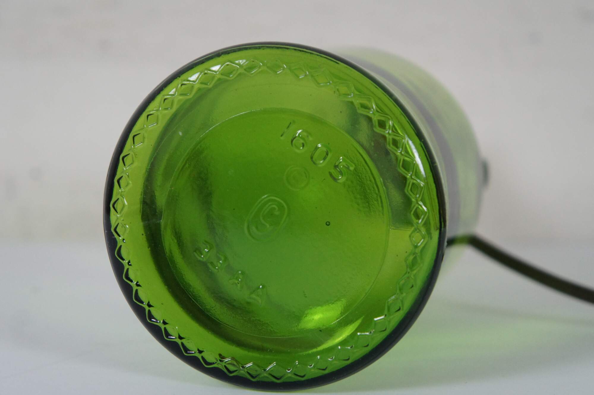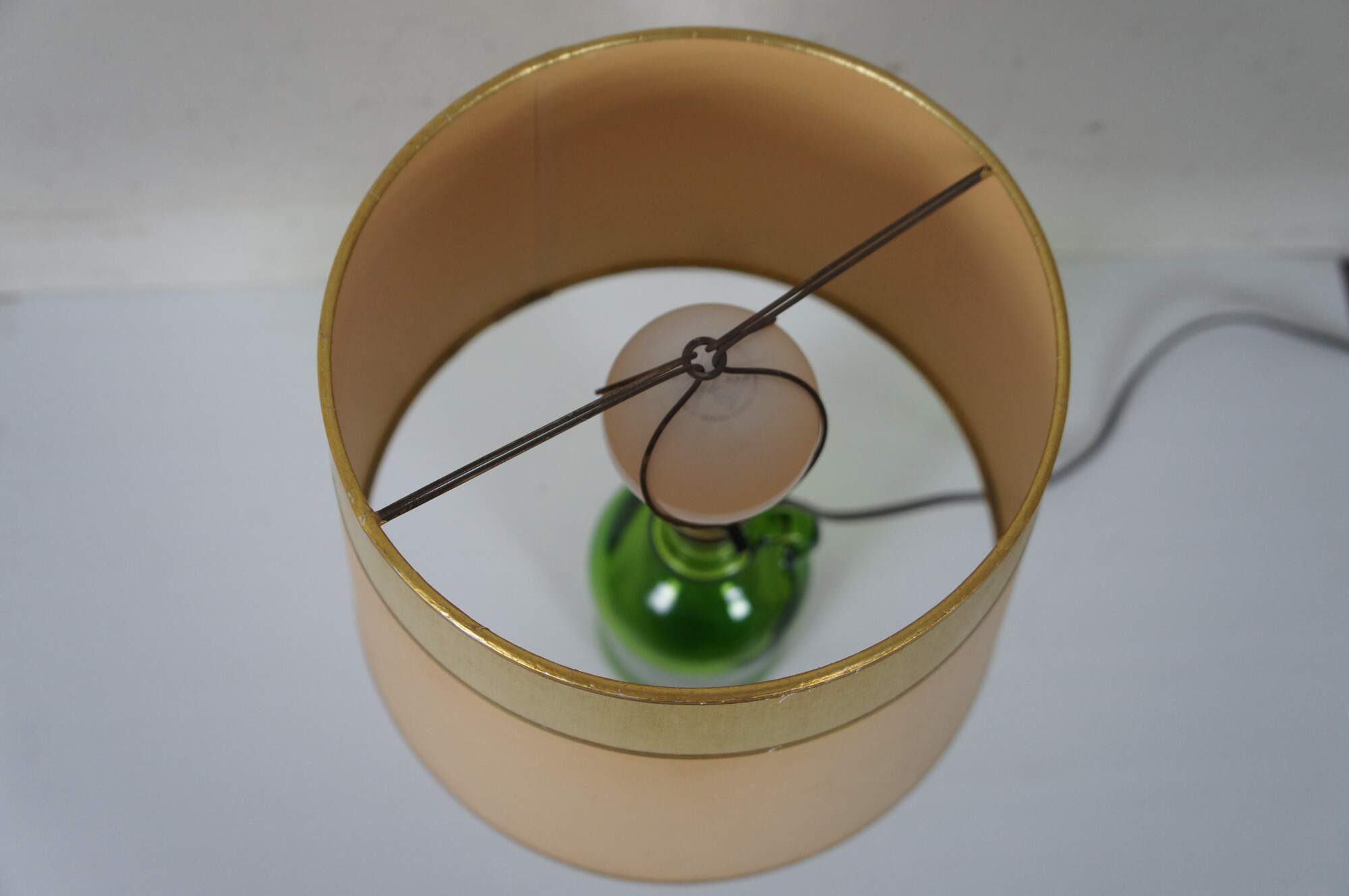 Vintage repurposed glass bottle / jug budoir / table lamp marked with 1605 – 33AA and a logo featuring a letter (likely a G) in an oval. Includes a gold and beige paper shade.
