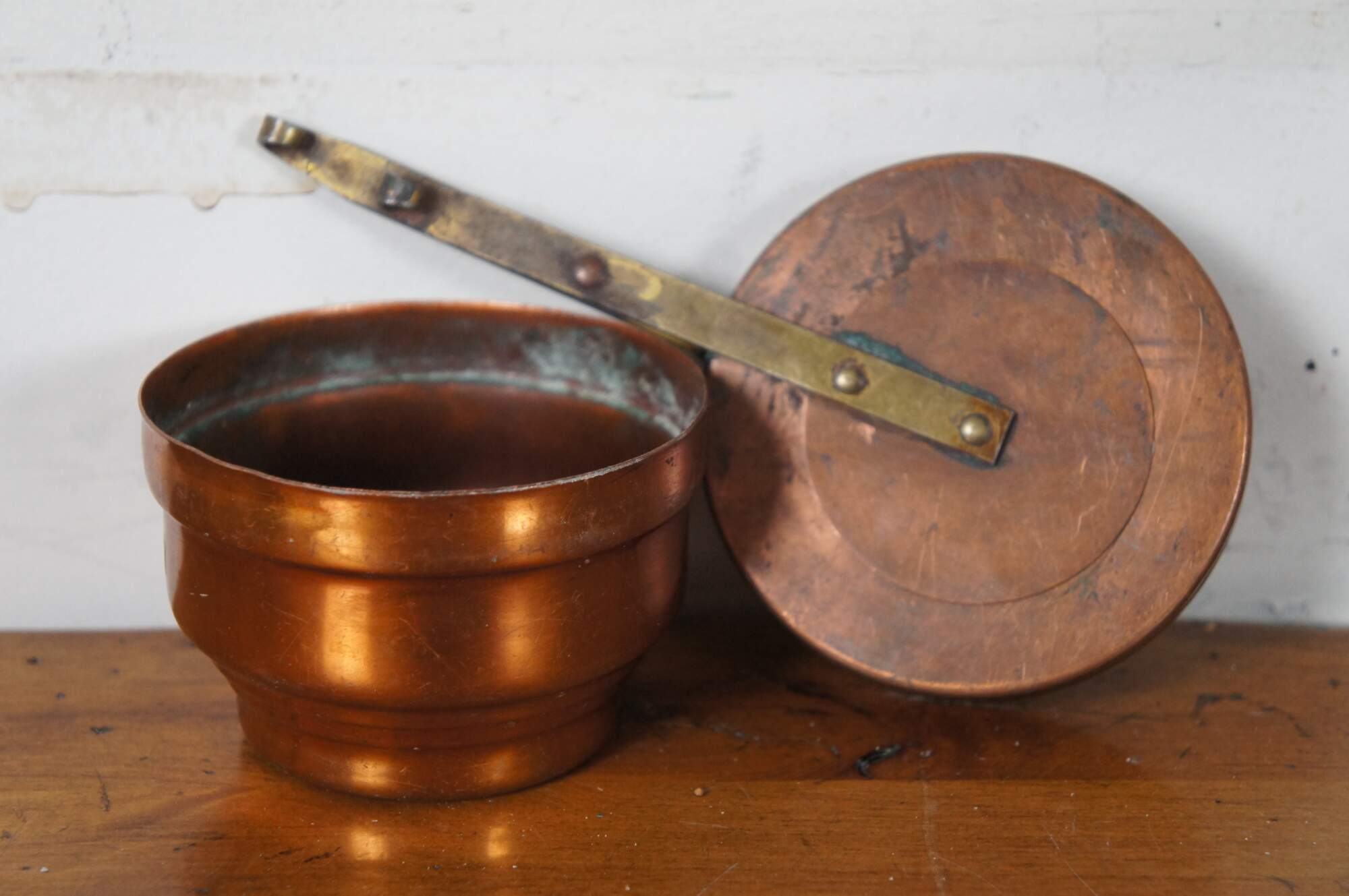Vintage five piece copper and brass chafing dish / warming pan set with turned wood handle.