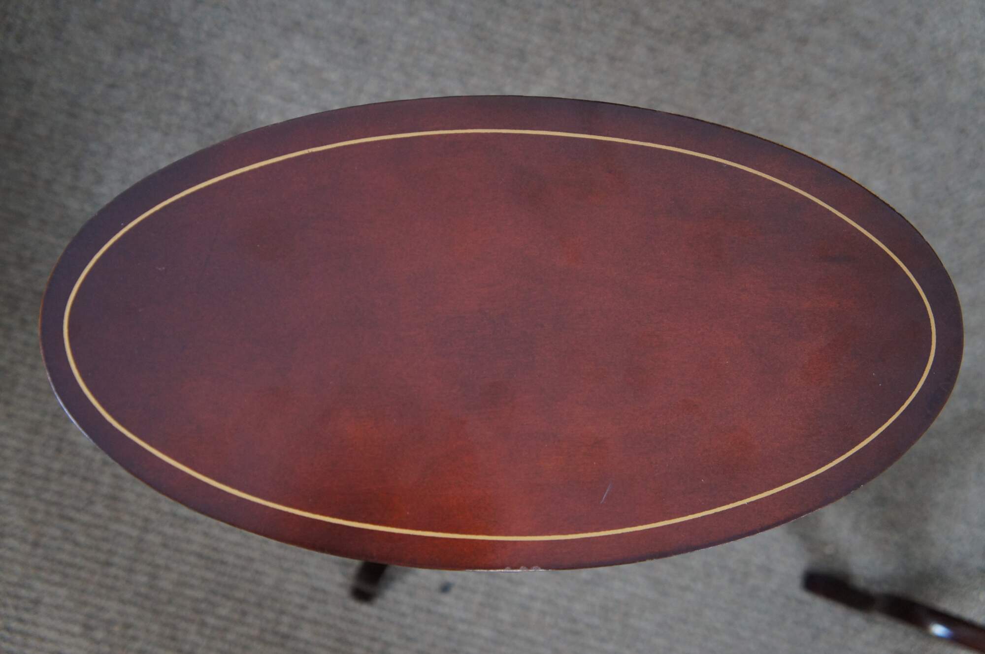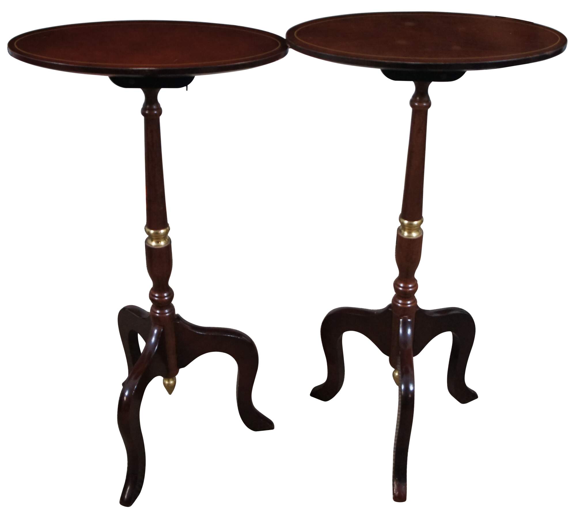 Pair of vintage Queen Anne style mahogany tilt top oval candle stands with inlaid top, tripod cabriole feet, central column and brass accents.