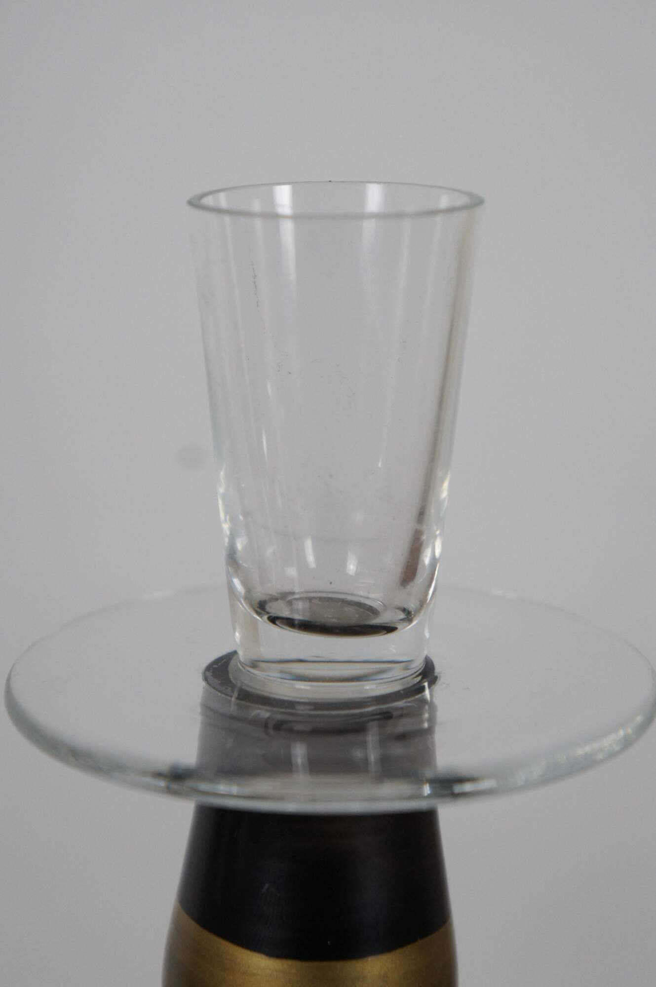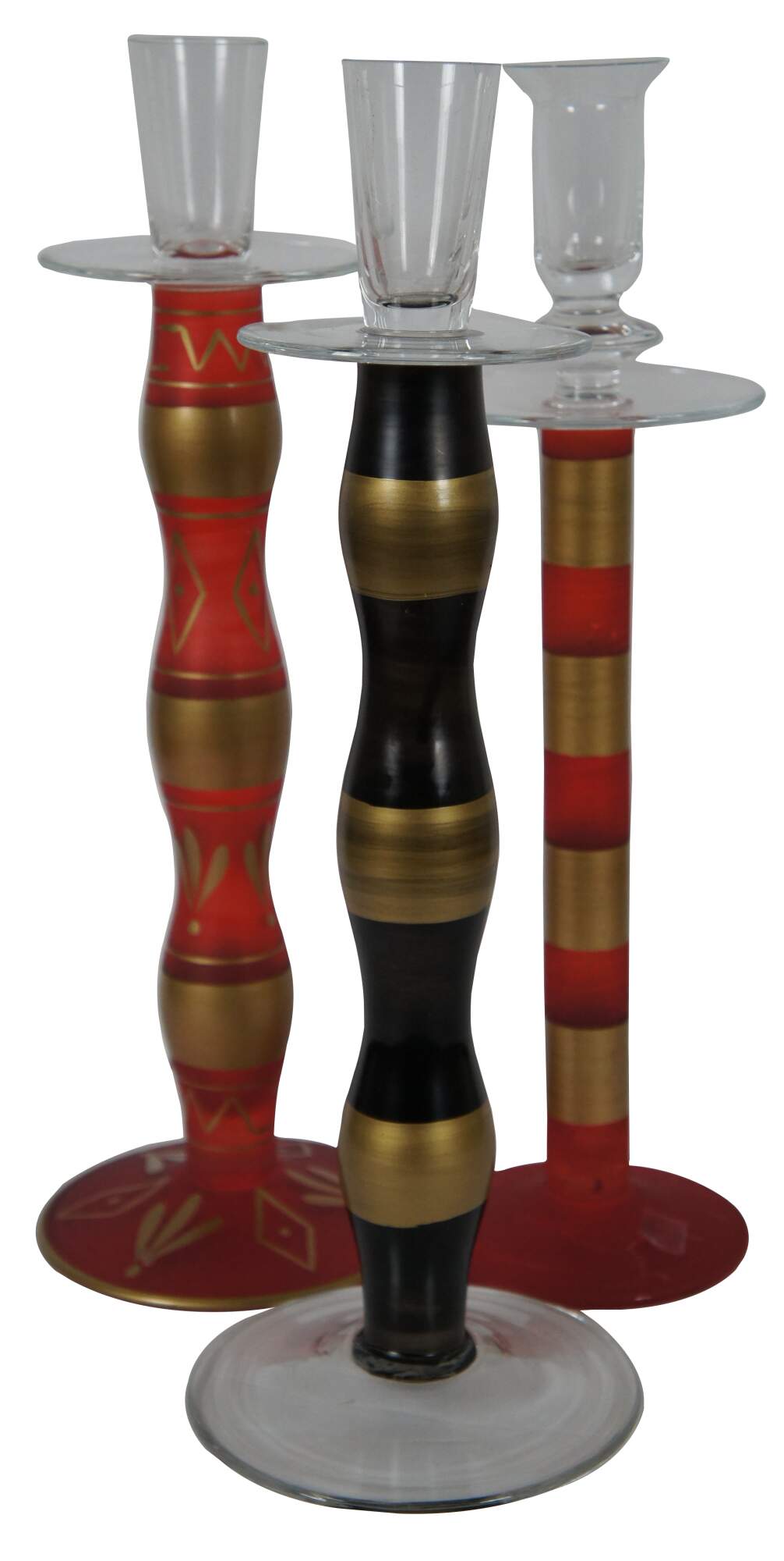 Set of three vintage hand blown and painted glass candlesticks in red and gold, and gold and black, made in Romania.