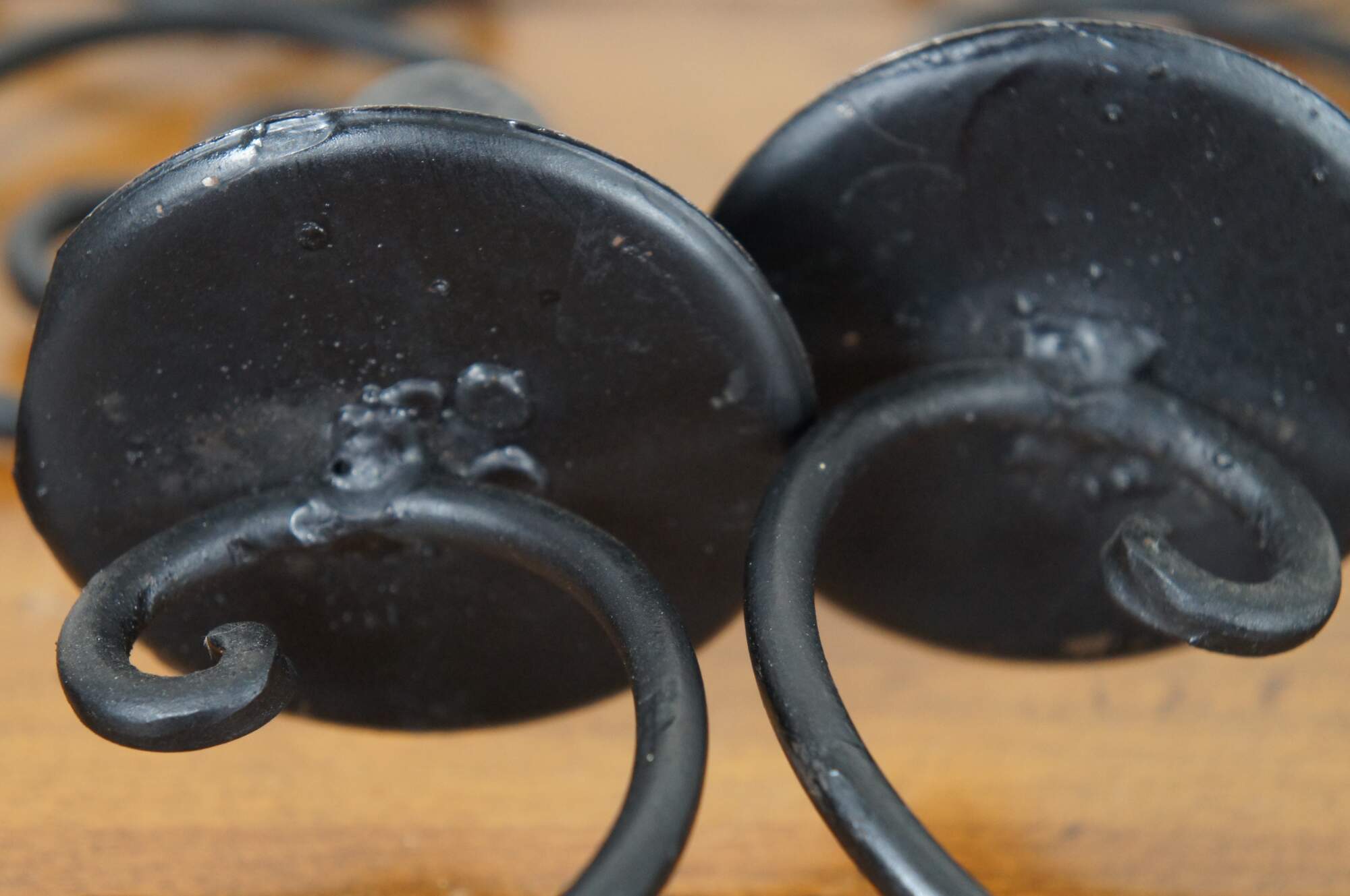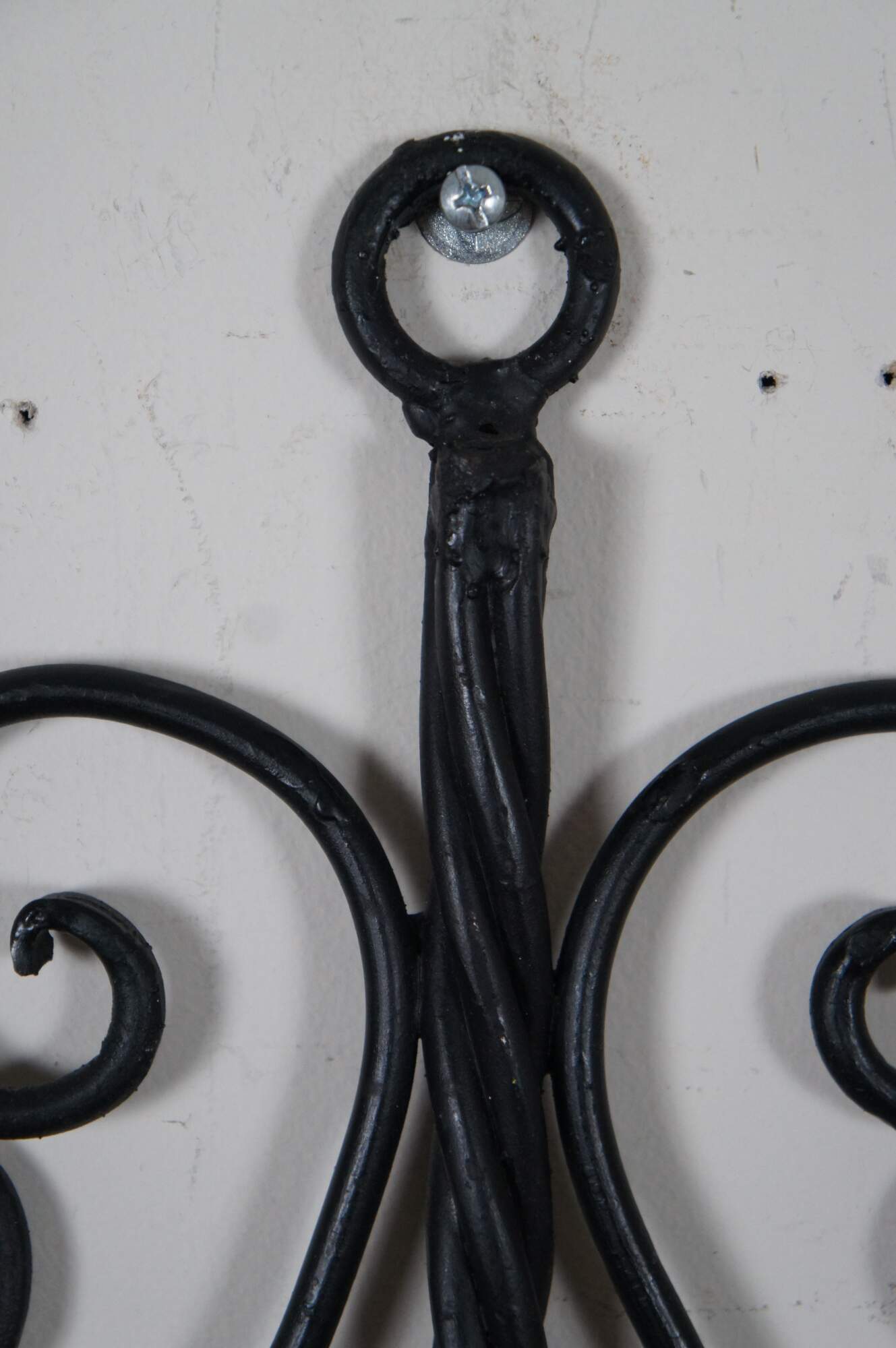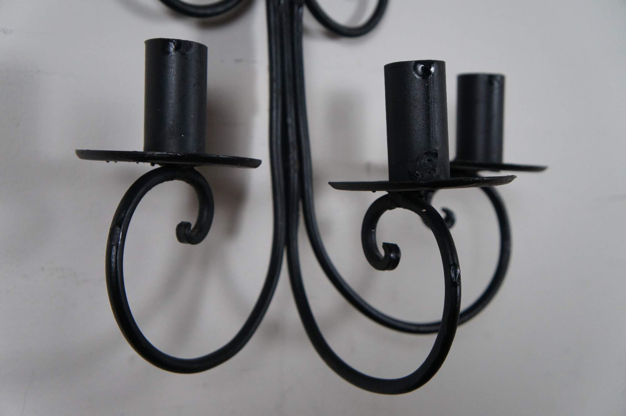 Vintage pair of twisted or scrolled wrought iron three arm candle holder wall sconces.