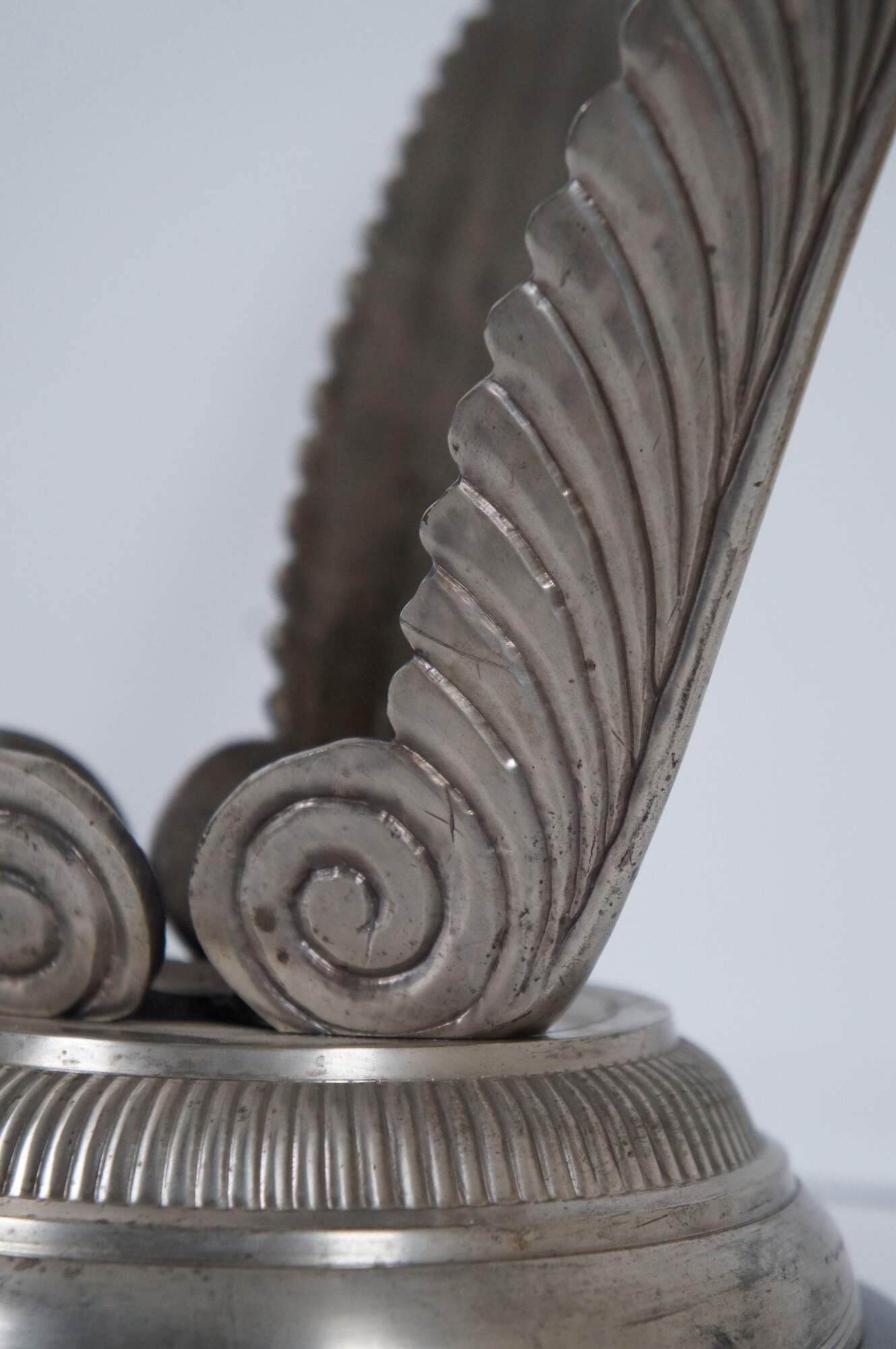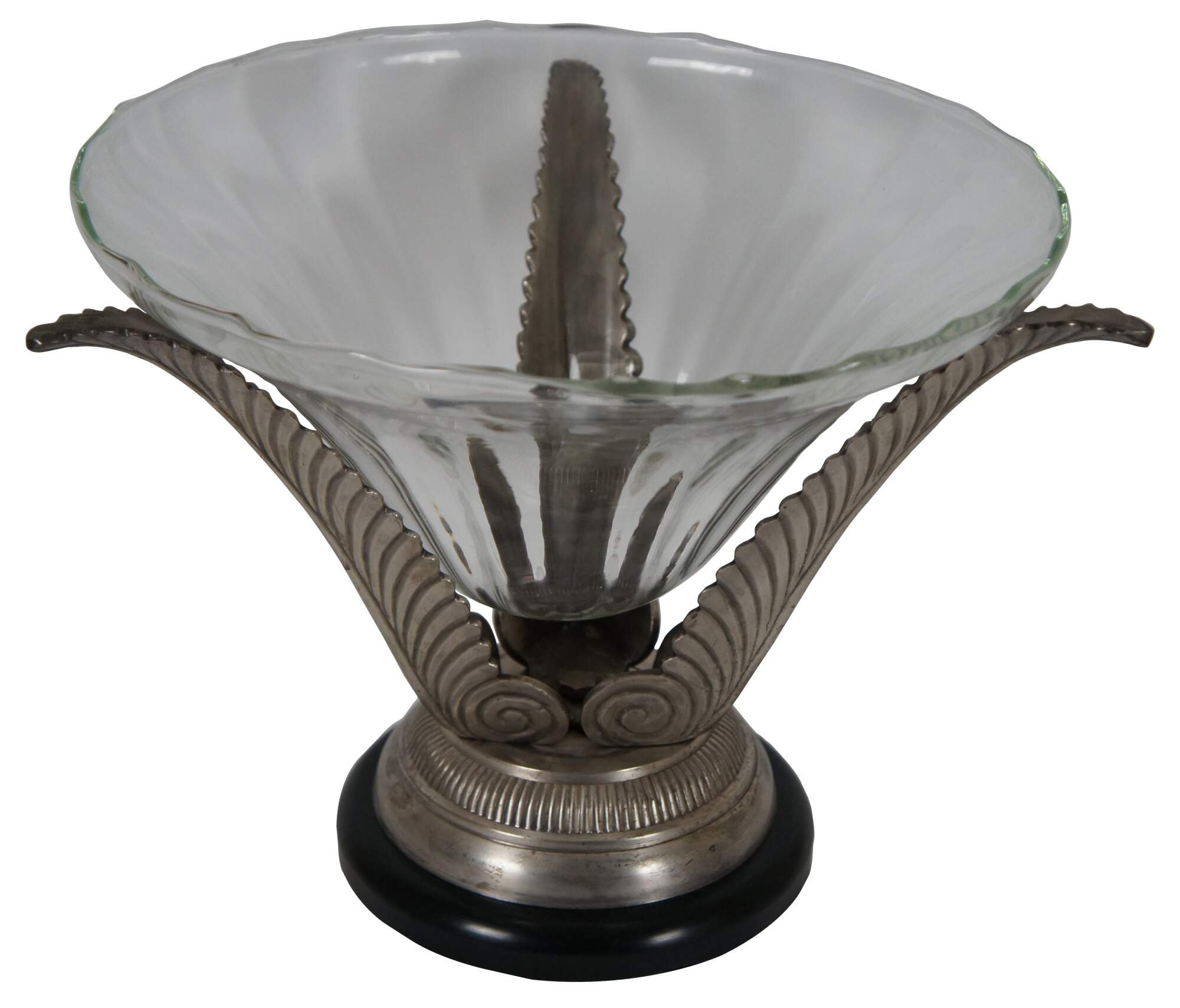 Hand crafted glass centerpiece bowl gently rippling texture, standing on a trio of silver painted metal acanthus leaves on a silver and black pedestal base.