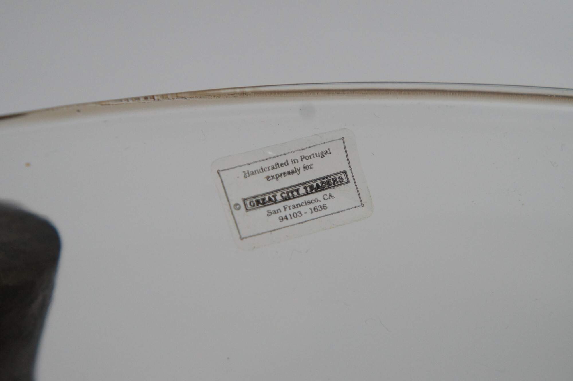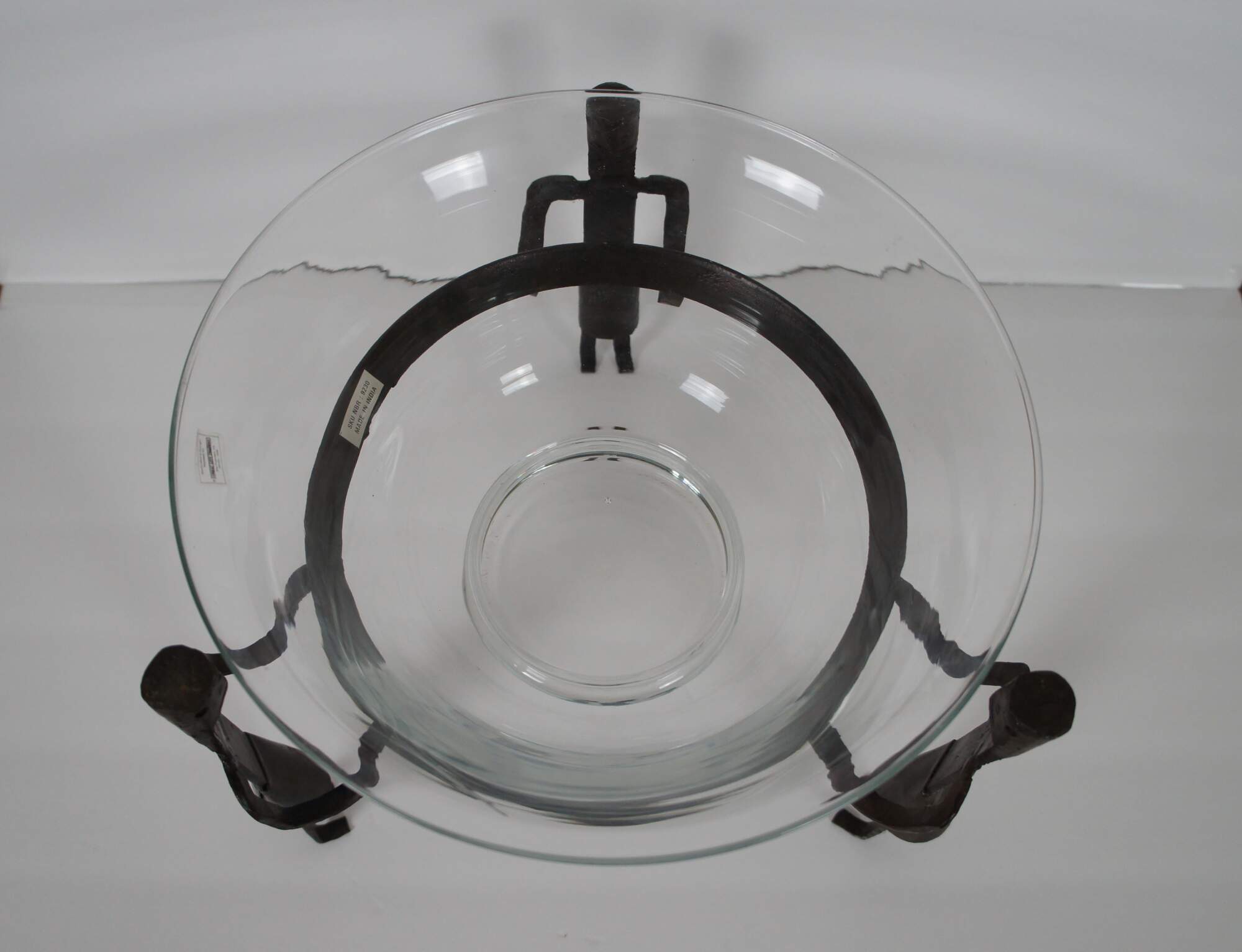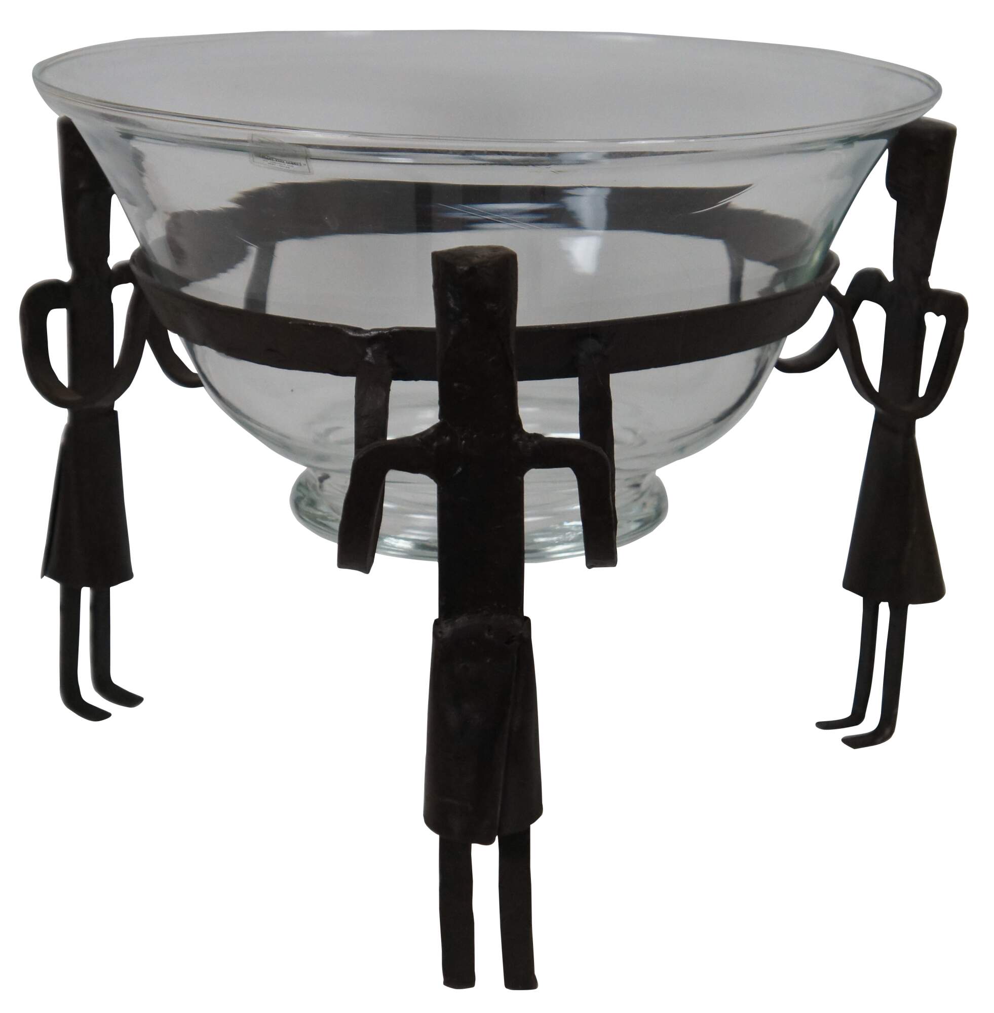 Glass bowl centerpiece on a wrought iron stand held by three semi-abstract figures. Handcrafted in Portugal for Great City Traders. Great for use as a centerpiece, candy or nut dish on a buffet or dining table.
