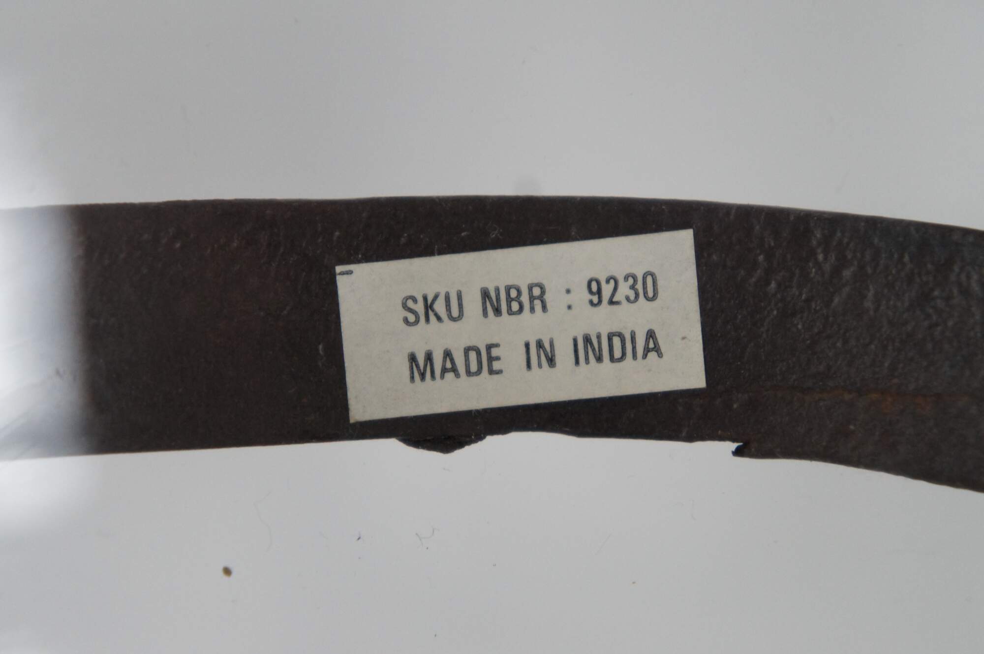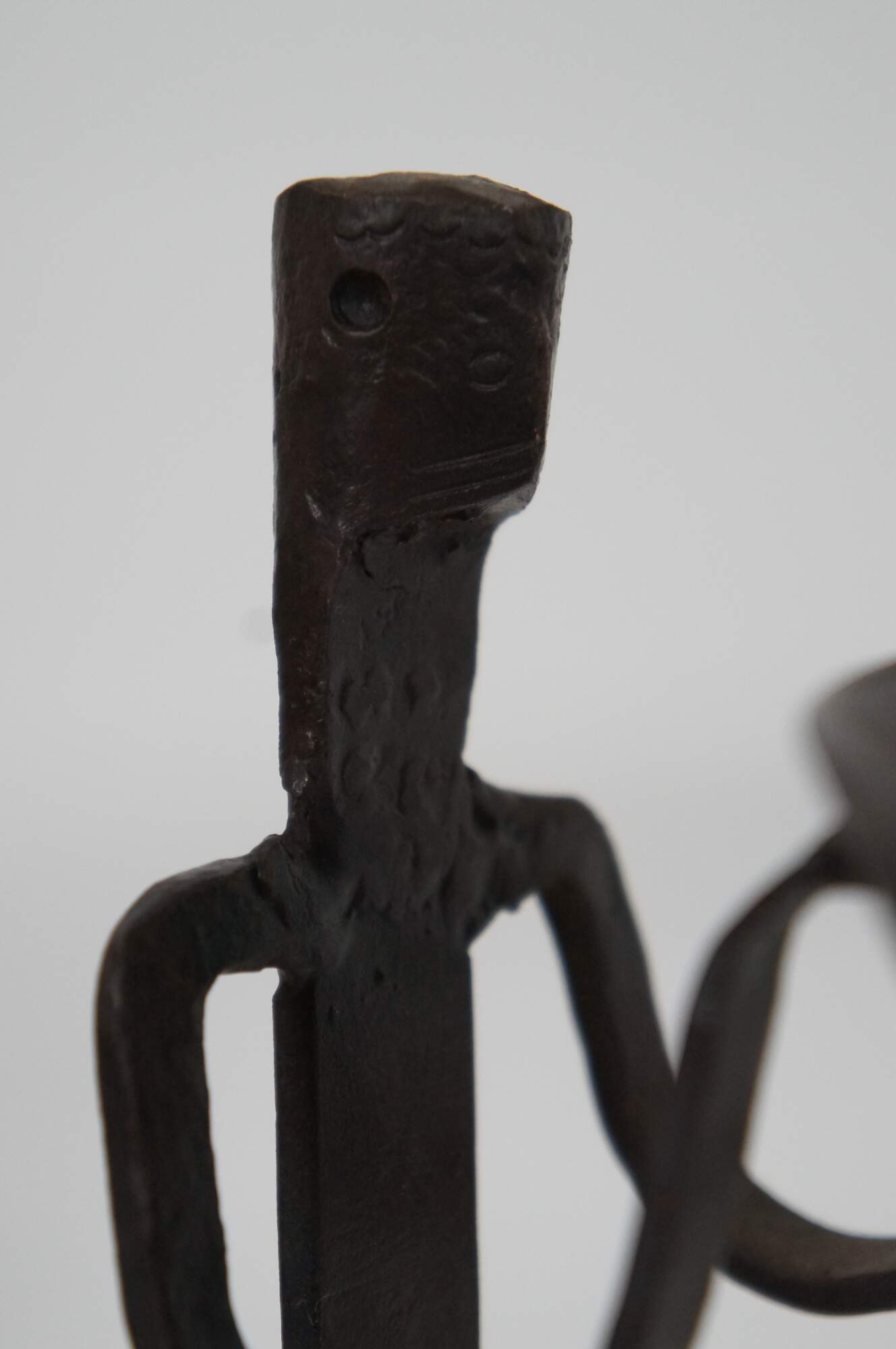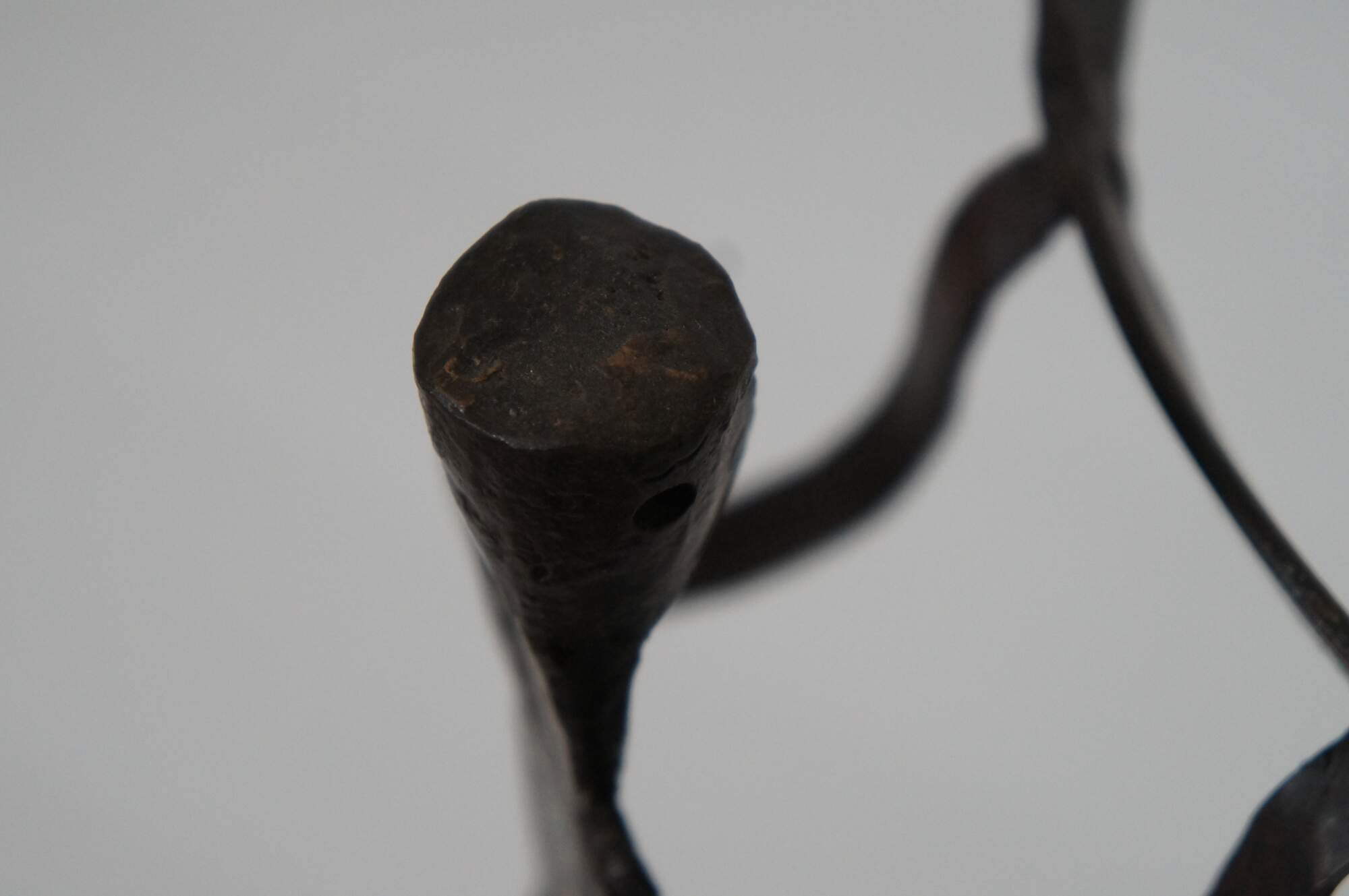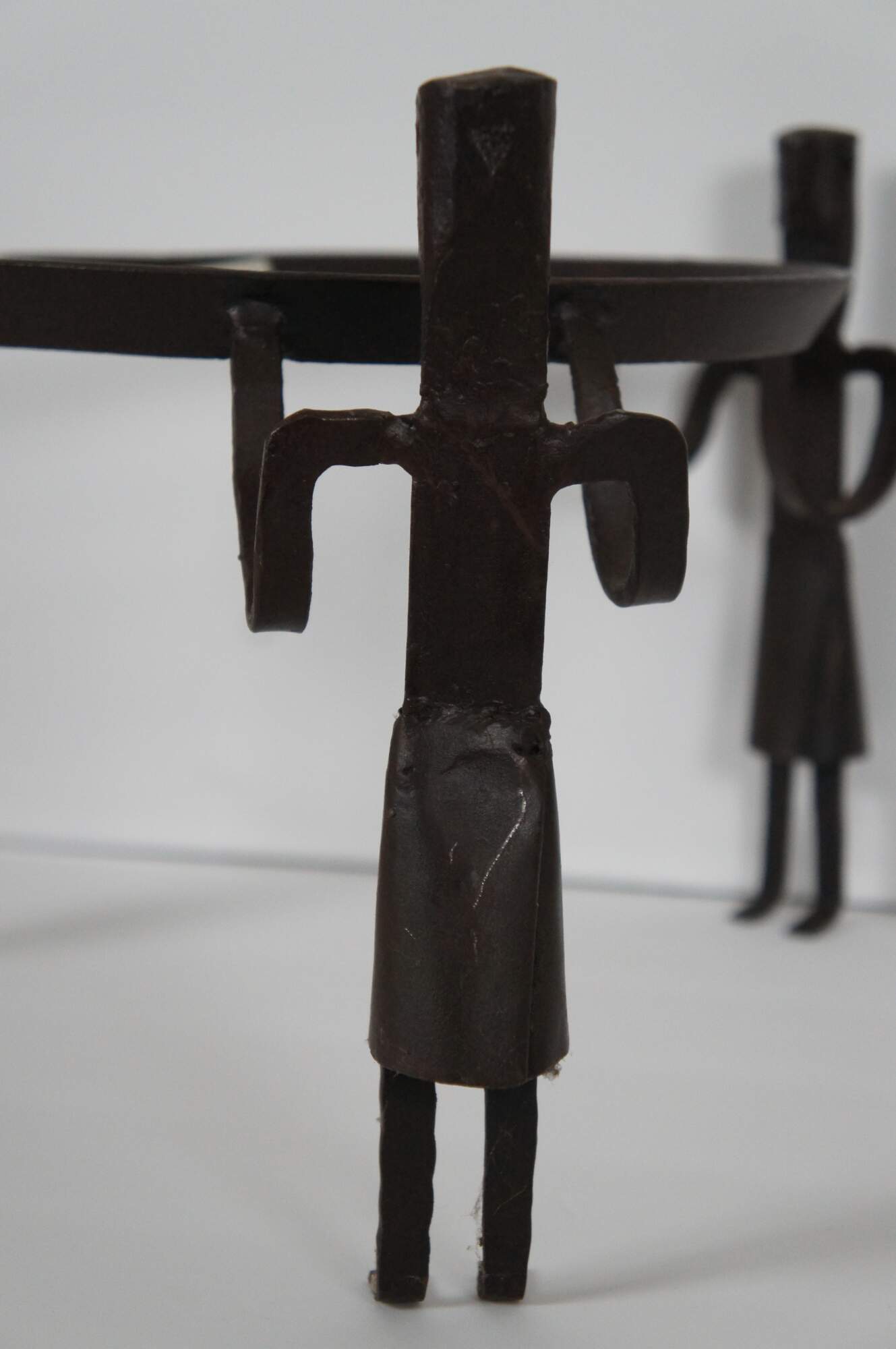Glass bowl centerpiece on a wrought iron stand held by three semi-abstract figures. Handcrafted in Portugal for Great City Traders. Great for use as a centerpiece, candy or nut dish on a buffet or dining table.