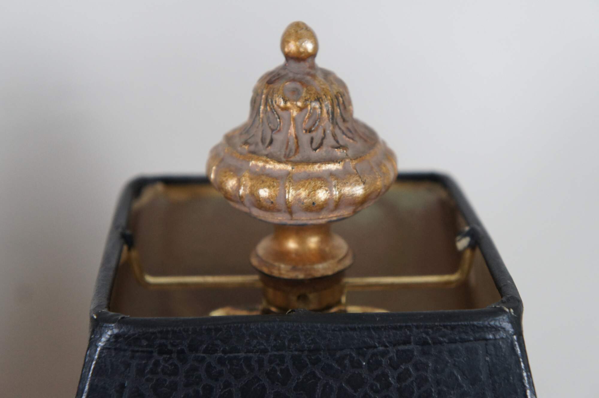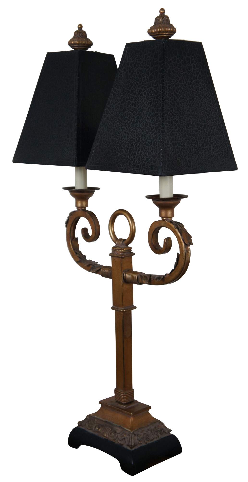 Vintage Uttermost black and gold French style candelabra table lamp with two candle or candlestick lights and double black crackle finish shades.