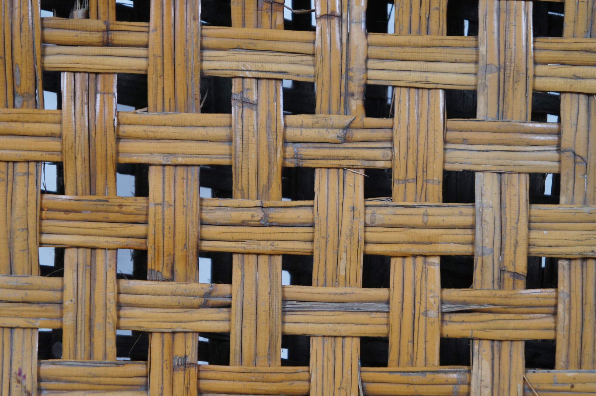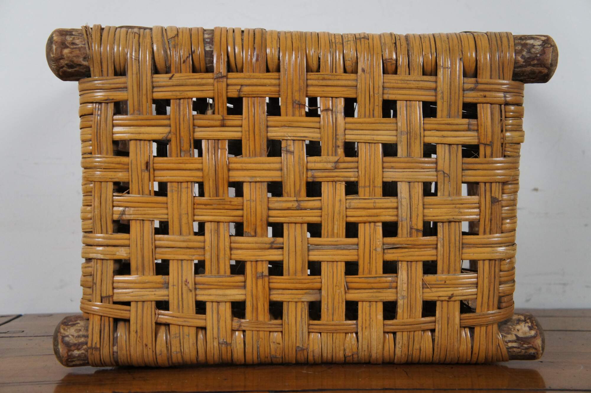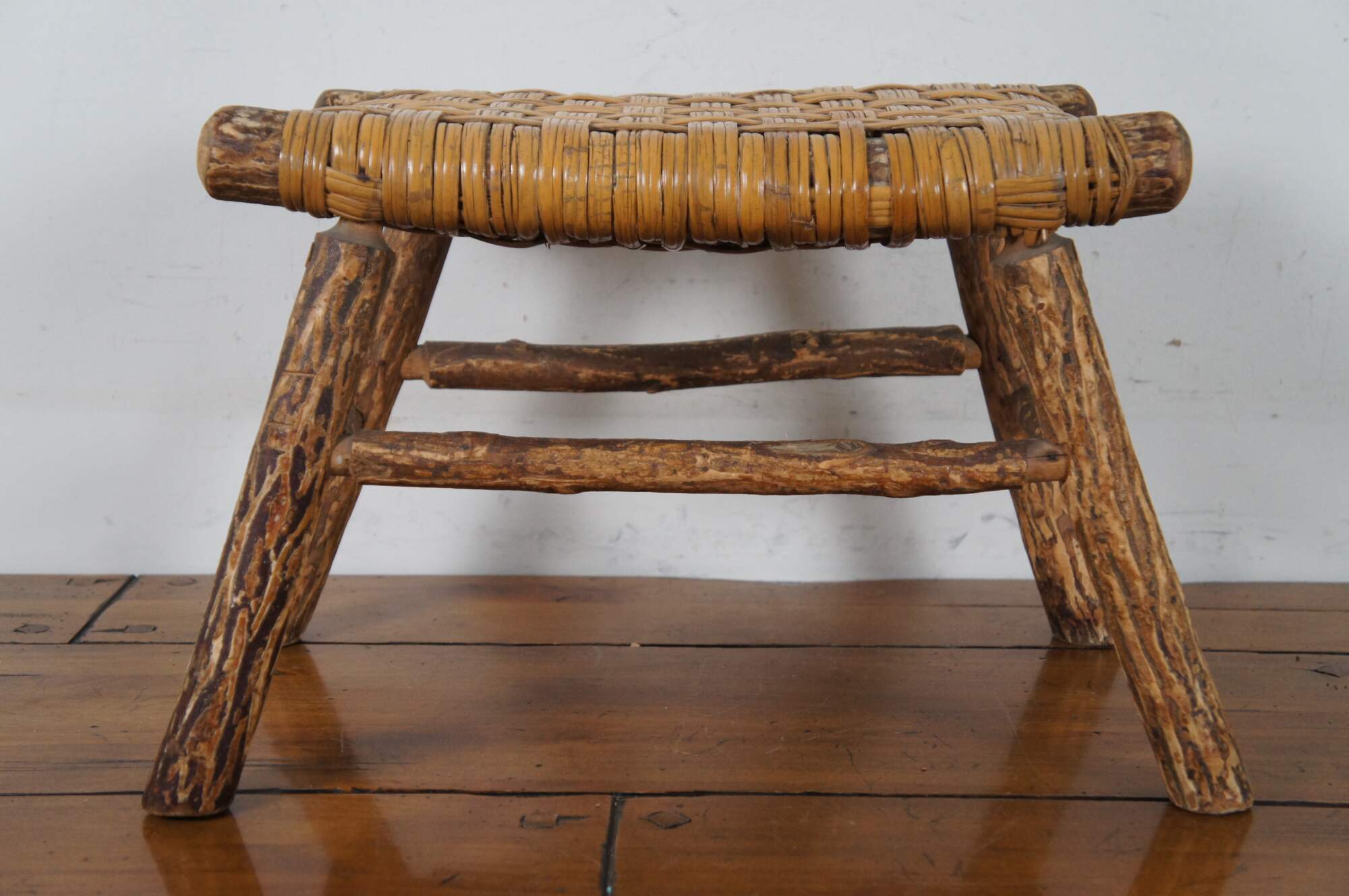Antique Shaker footstool or ottoman featuring early American styling with rough hewn legs and woven wicker / rattan top.