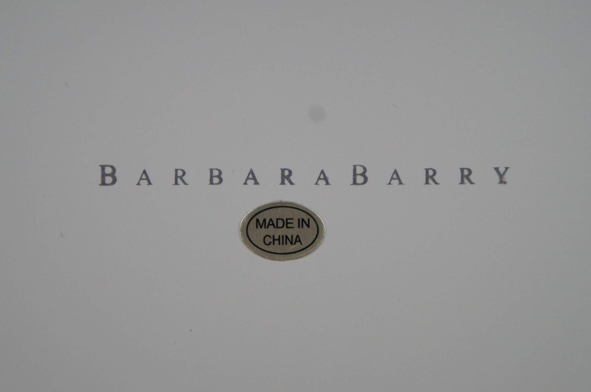 Barbara Barry for Global Views rectangular tea / serving tray with high gallery and cut out handles, made of wood painted in off white with silver along the top edge. Circa 2010.