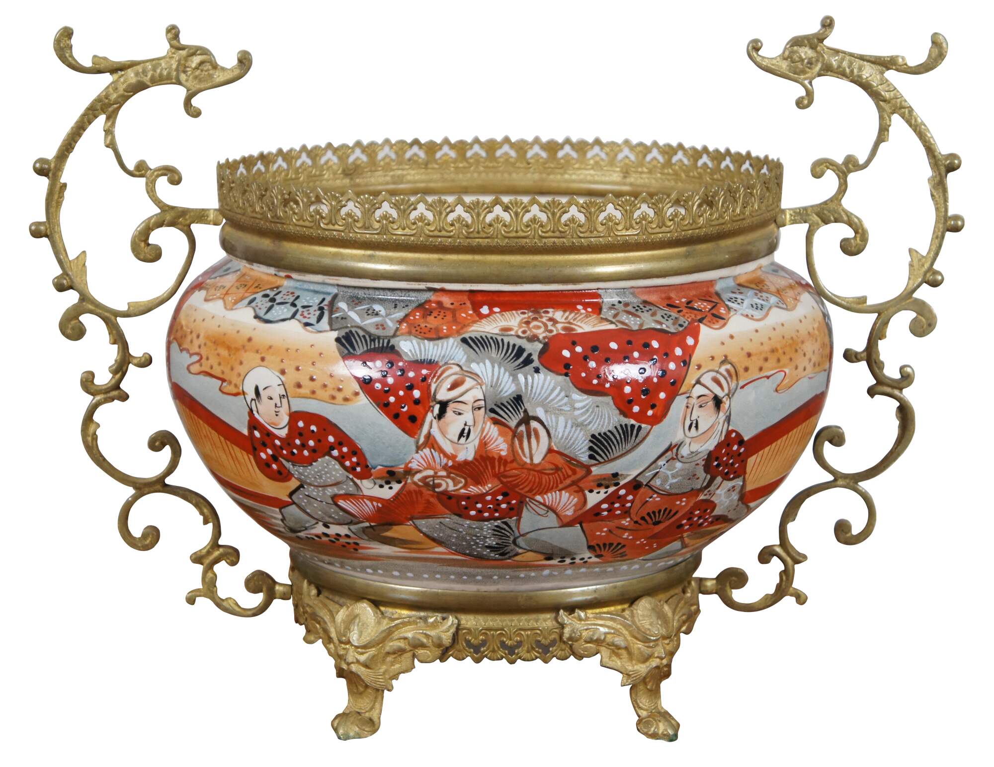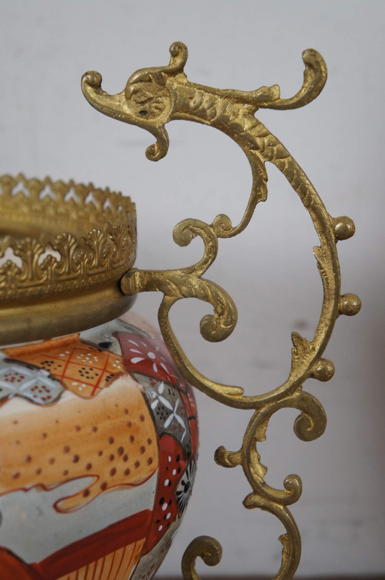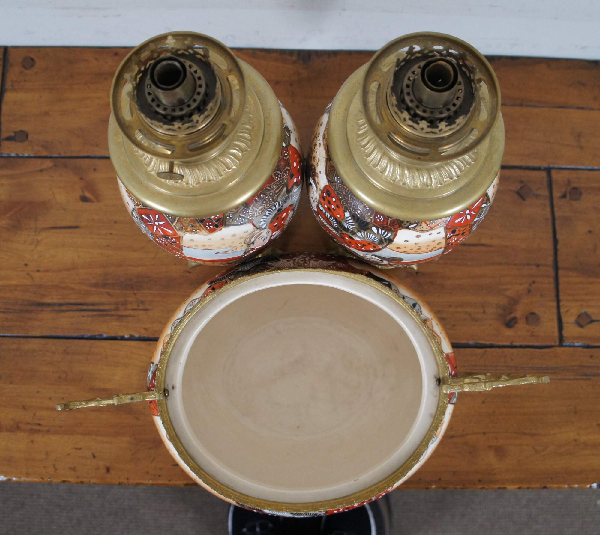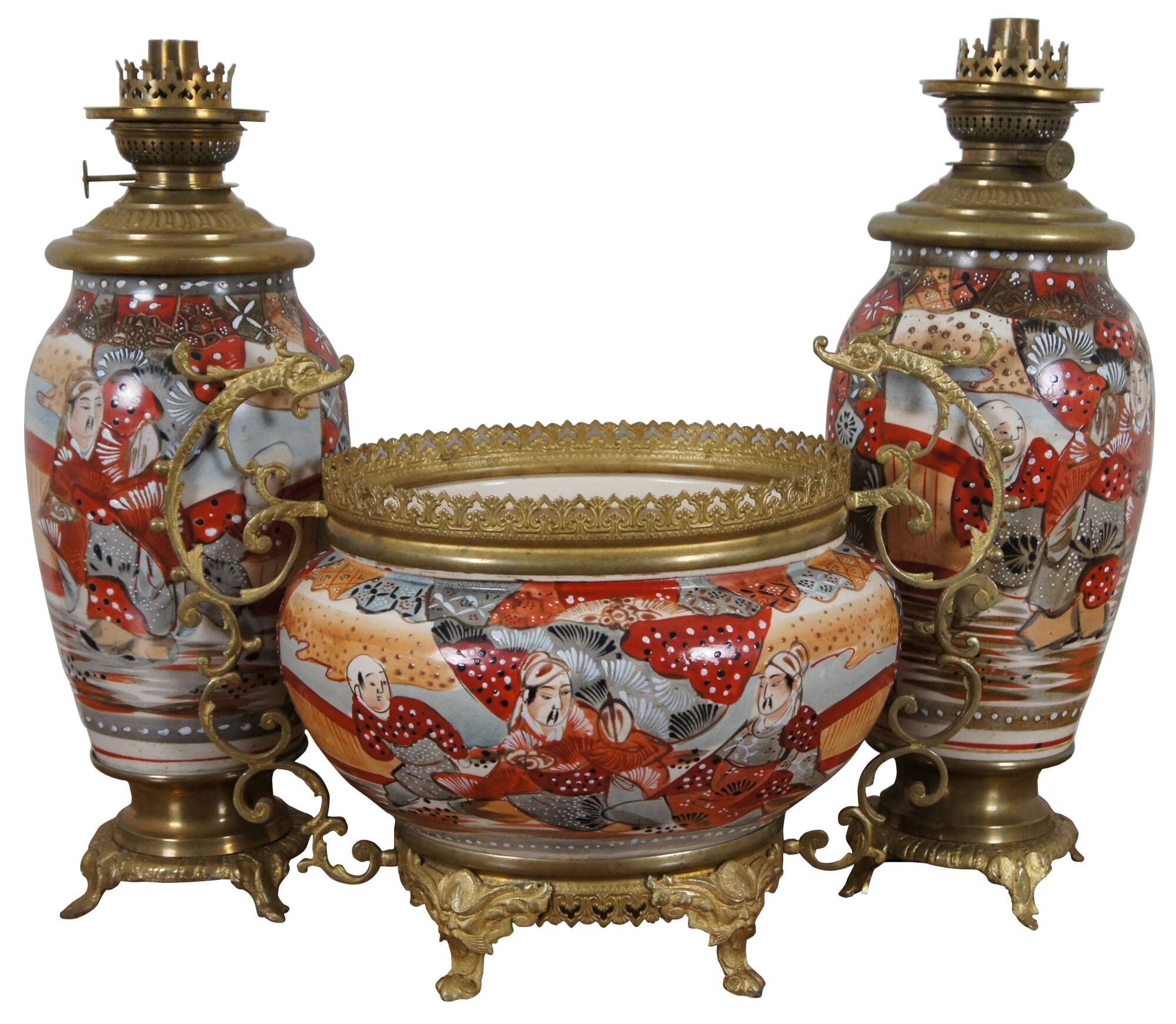 Rare antique parlor set of Japanese Satsuma porcelain and brass Kosmos Brenner oil lamps and jardinière / cache pot / planter / urn. Both are moriage painted with red, orange, gray and white figures and designs. The bases of the ginger jar shaped lamps feature butterfly or bat shaped feet. The jardinière is accented with a pierced rim, slender dragon handles and winged northwind faces for feet. Origin Sazuki.