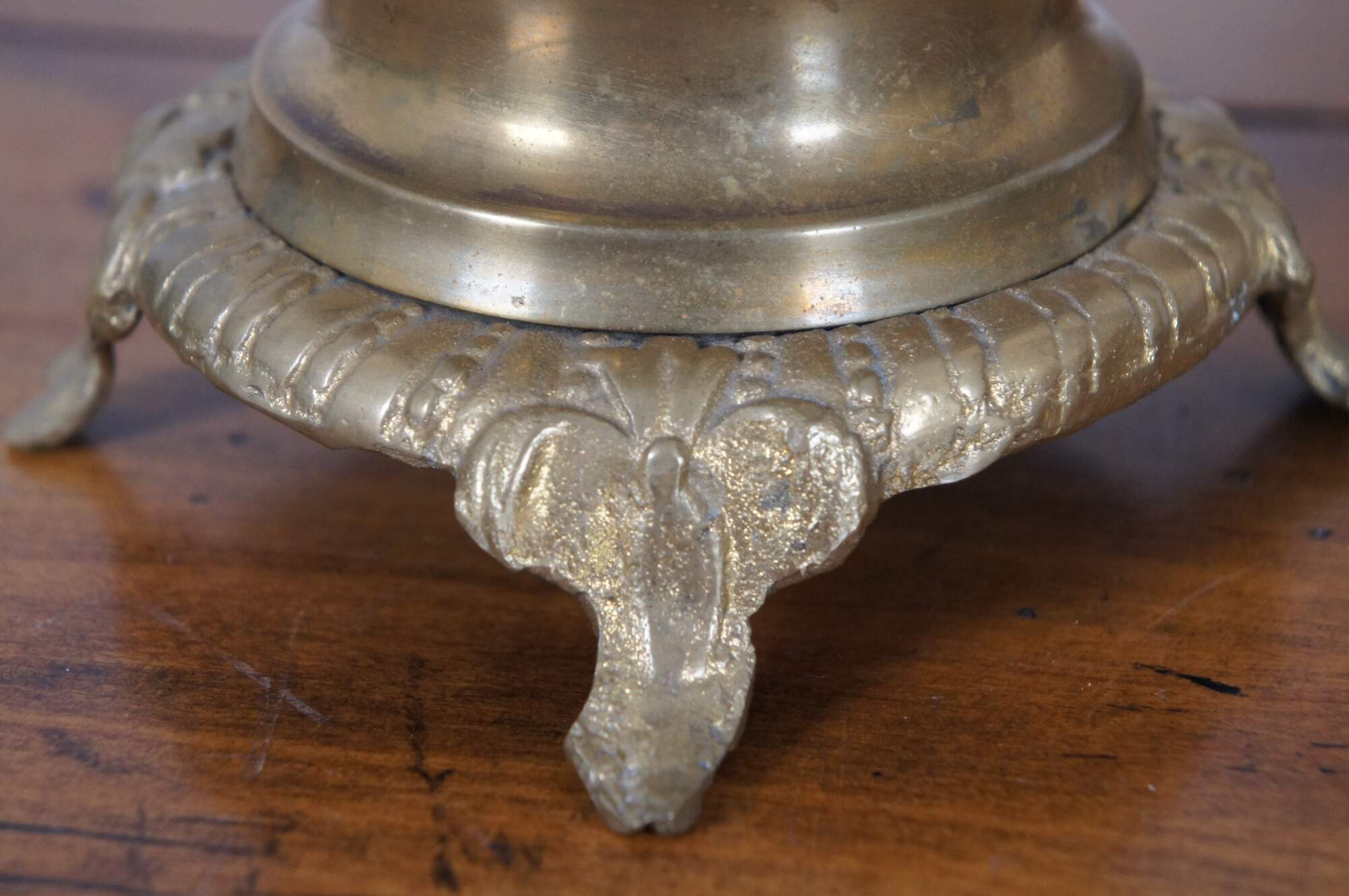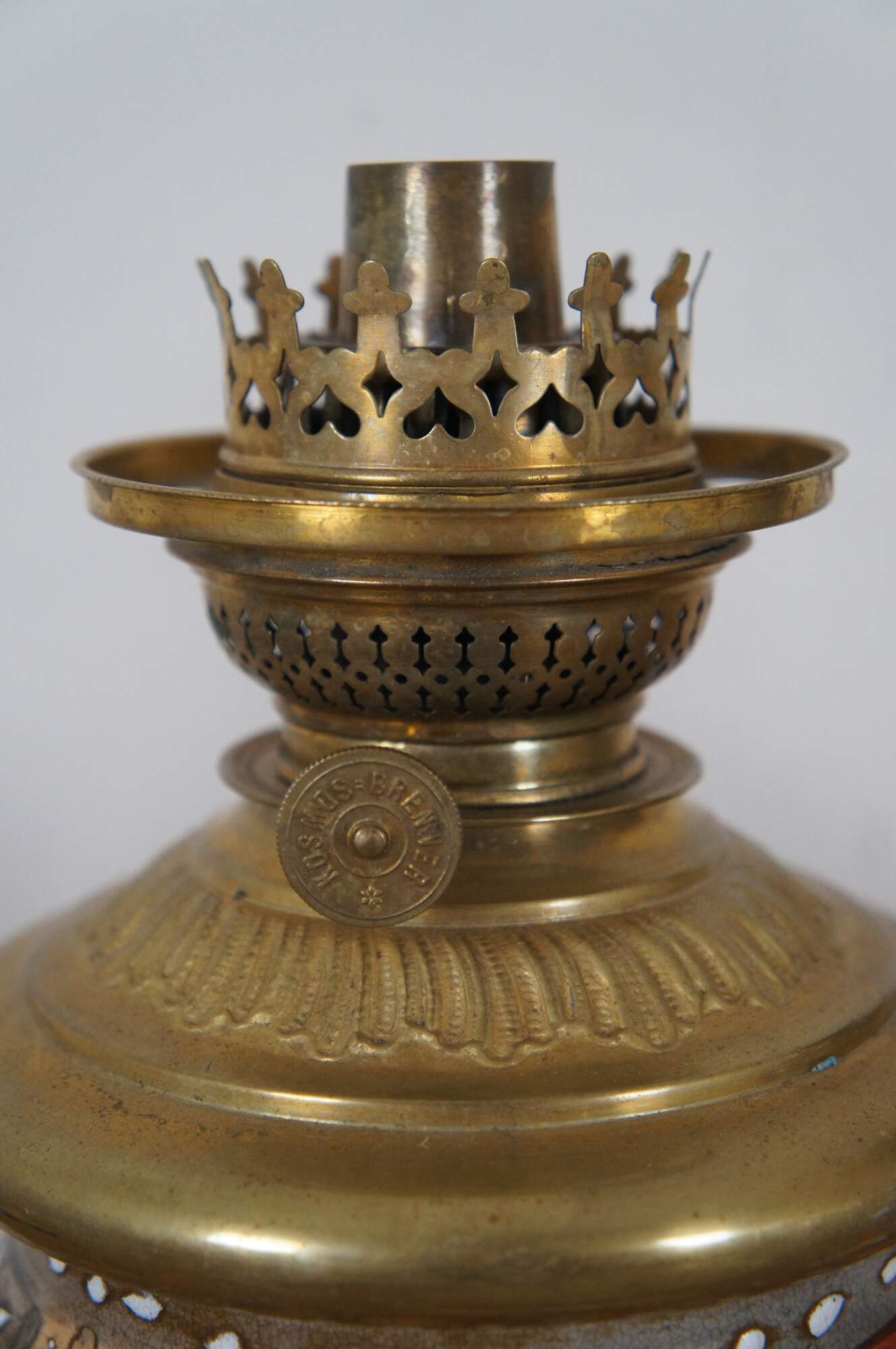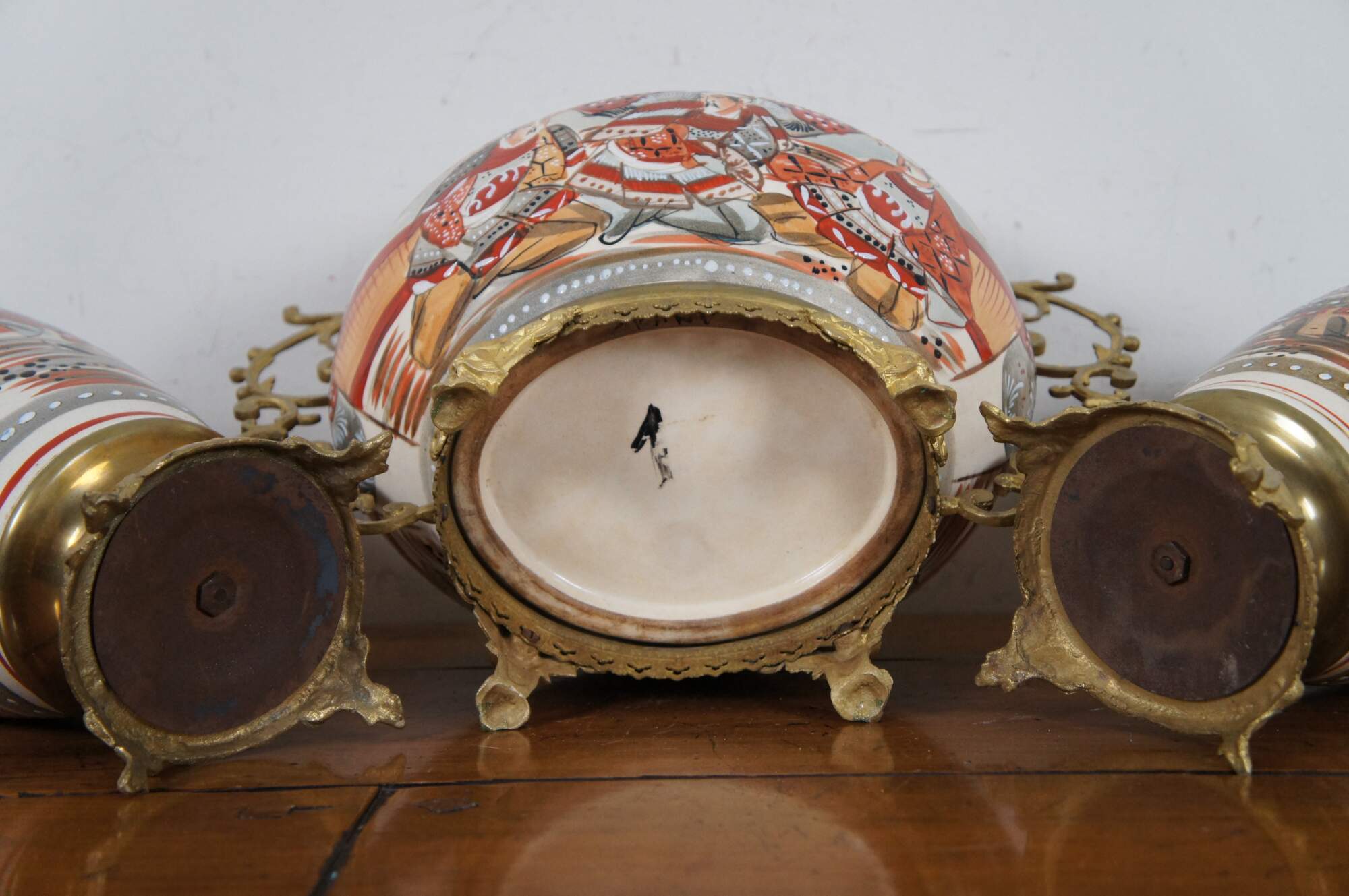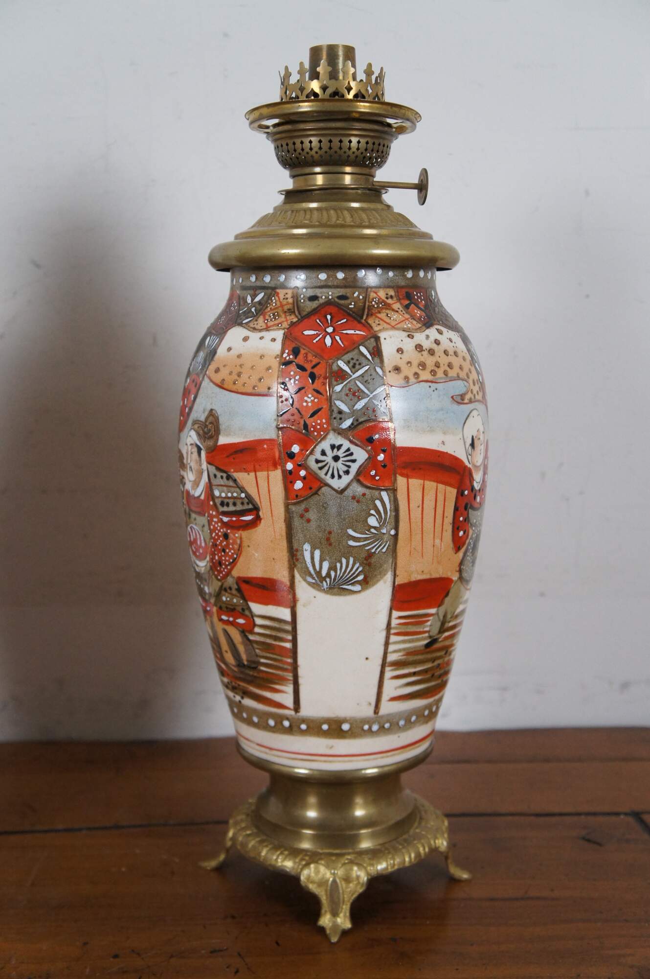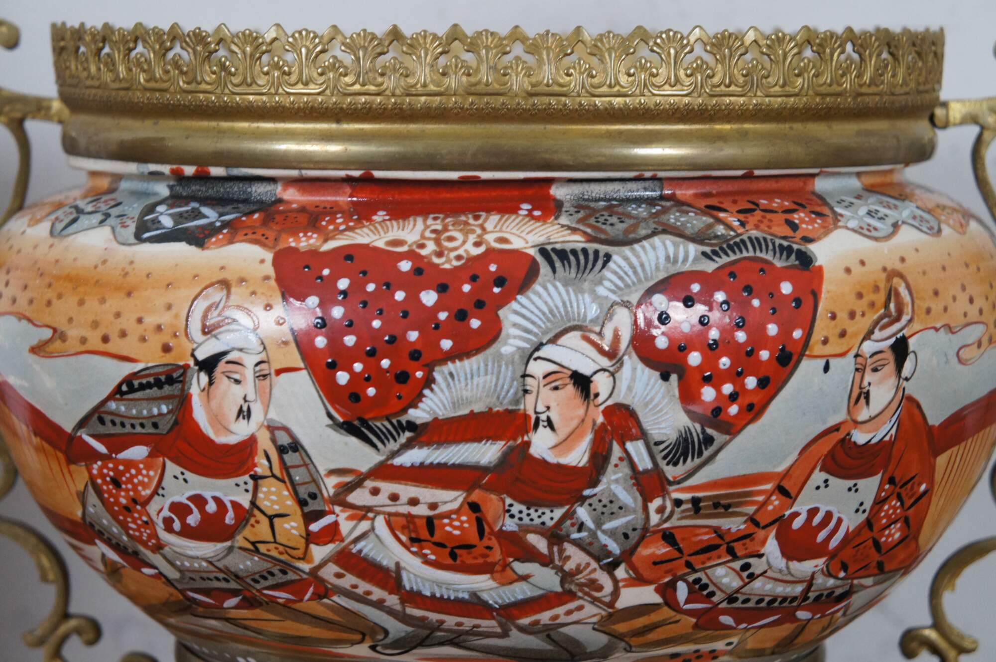 Rare antique parlor set of Japanese Satsuma porcelain and brass Kosmos Brenner oil lamps and jardinière / cache pot / planter / urn. Both are moriage painted with red, orange, gray and white figures and designs. The bases of the ginger jar shaped lamps feature butterfly or bat shaped feet. The jardinière is accented with a pierced rim, slender dragon handles and winged northwind faces for feet. Origin Sazuki.