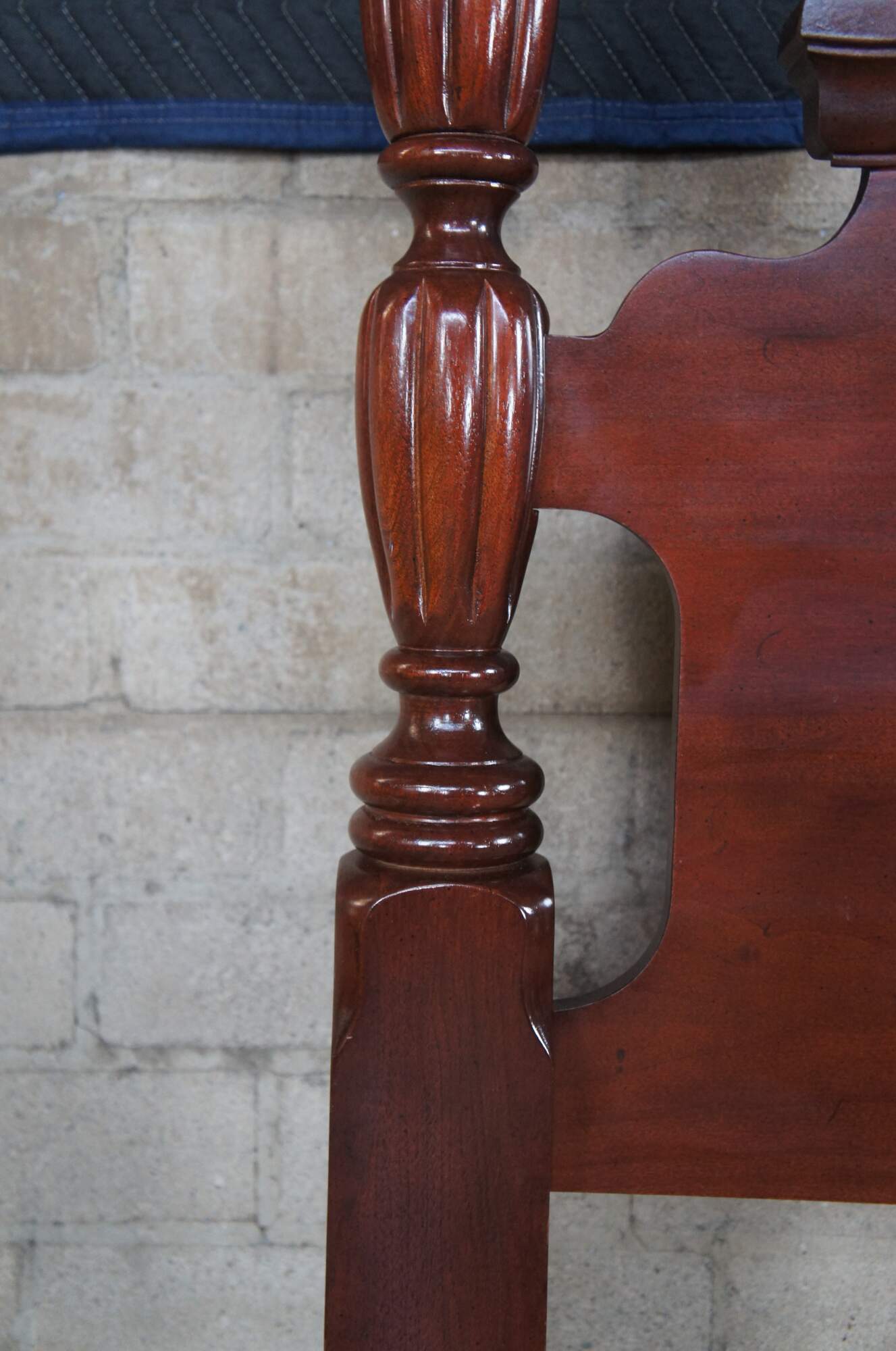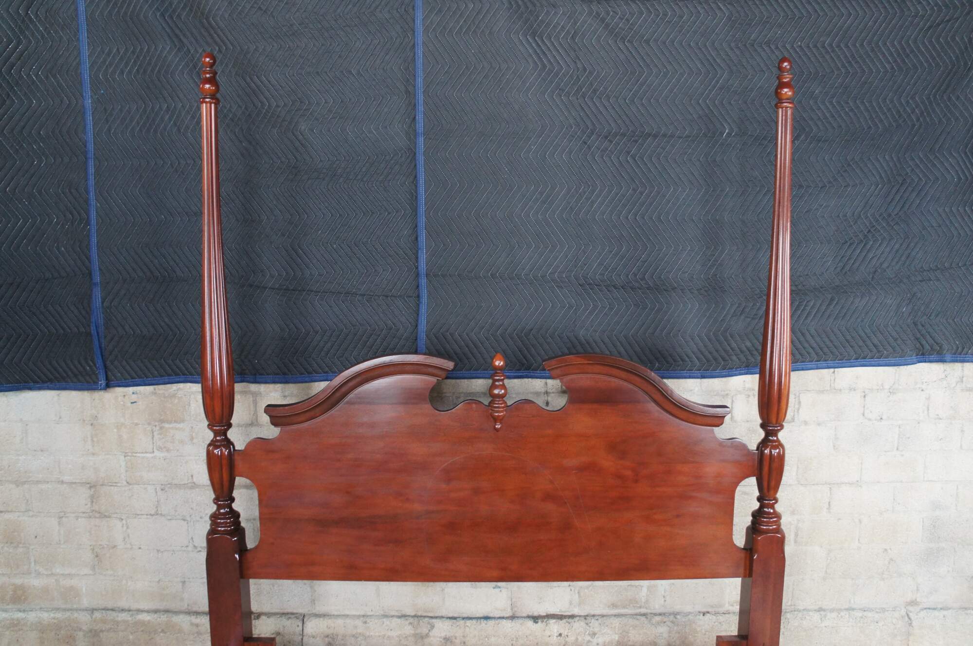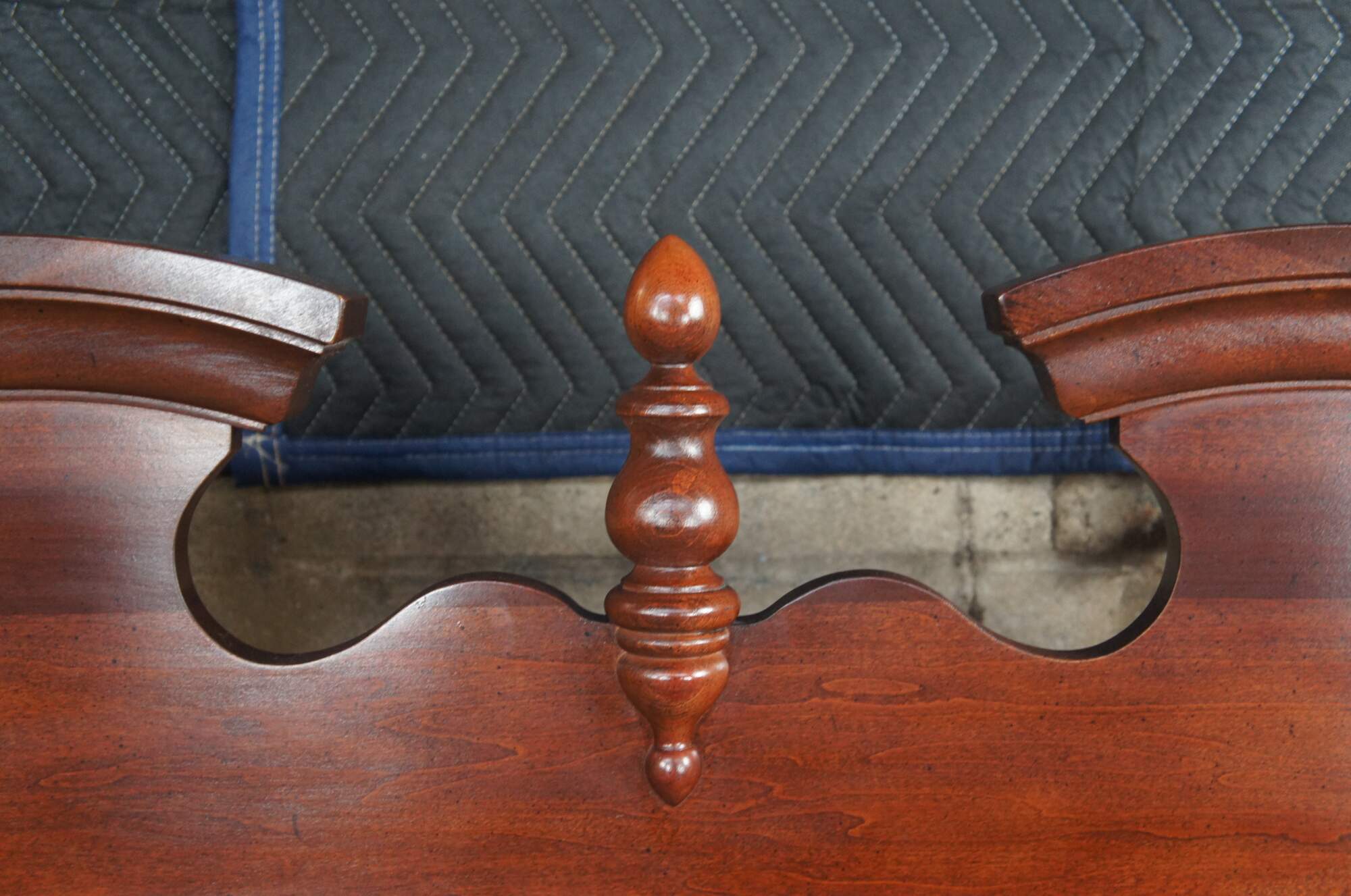 Kincaid Furniture General William Lenoire Limited Edition plantation style rice carved Full to Queen bed. Made from cherry with a warm brown finish, open pediment, reeded posters and carved details
