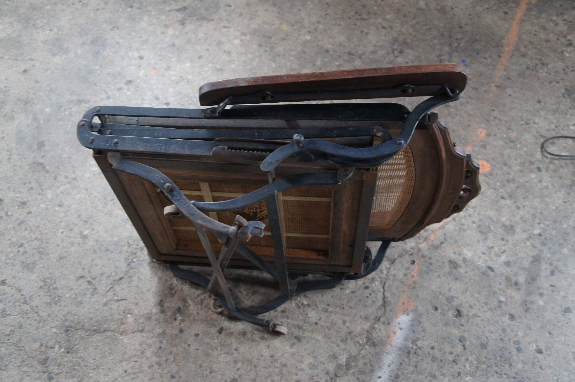 Good Antique Condition, missing wheel along the back, broken cane on the seat, some rust,