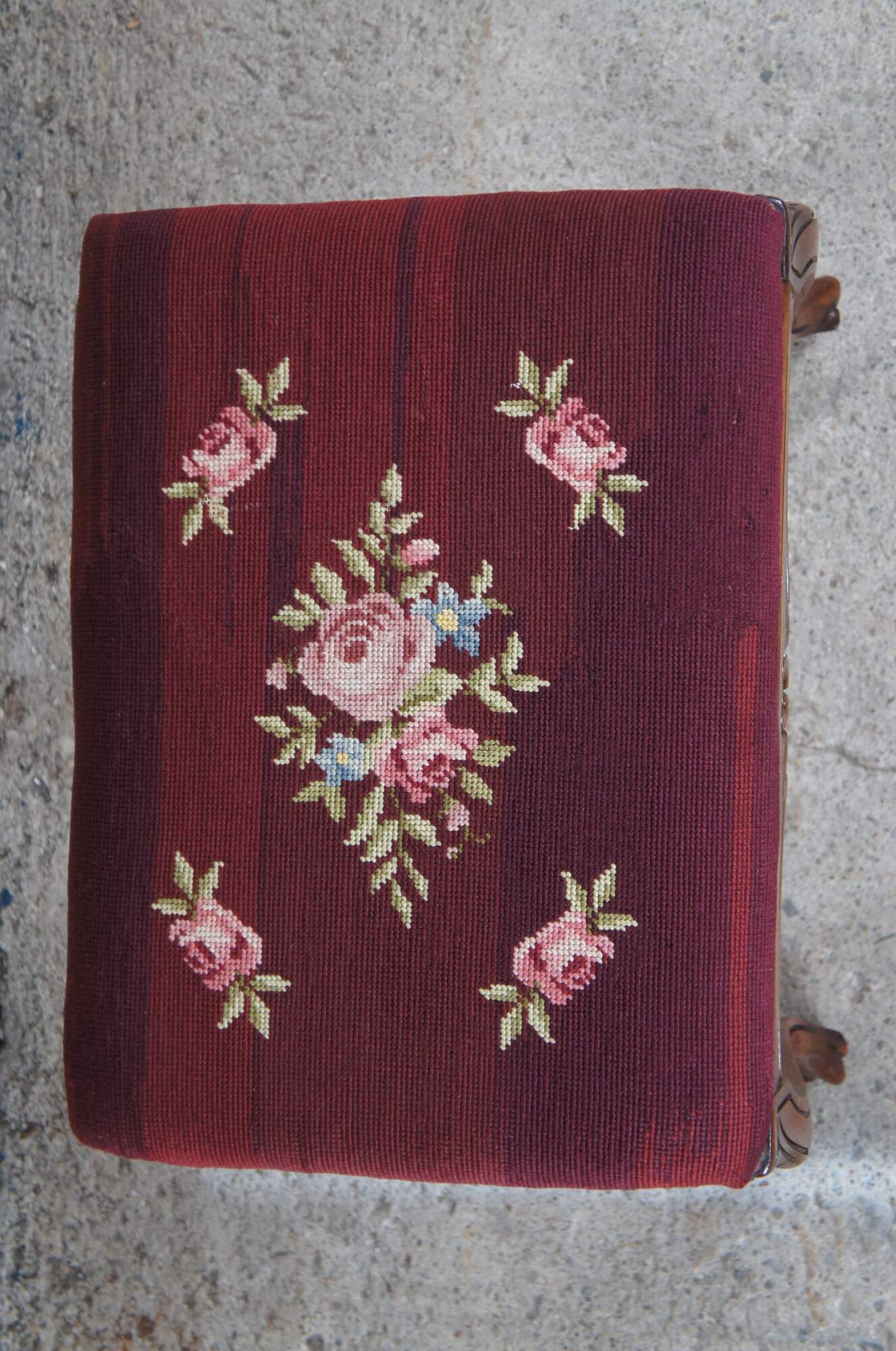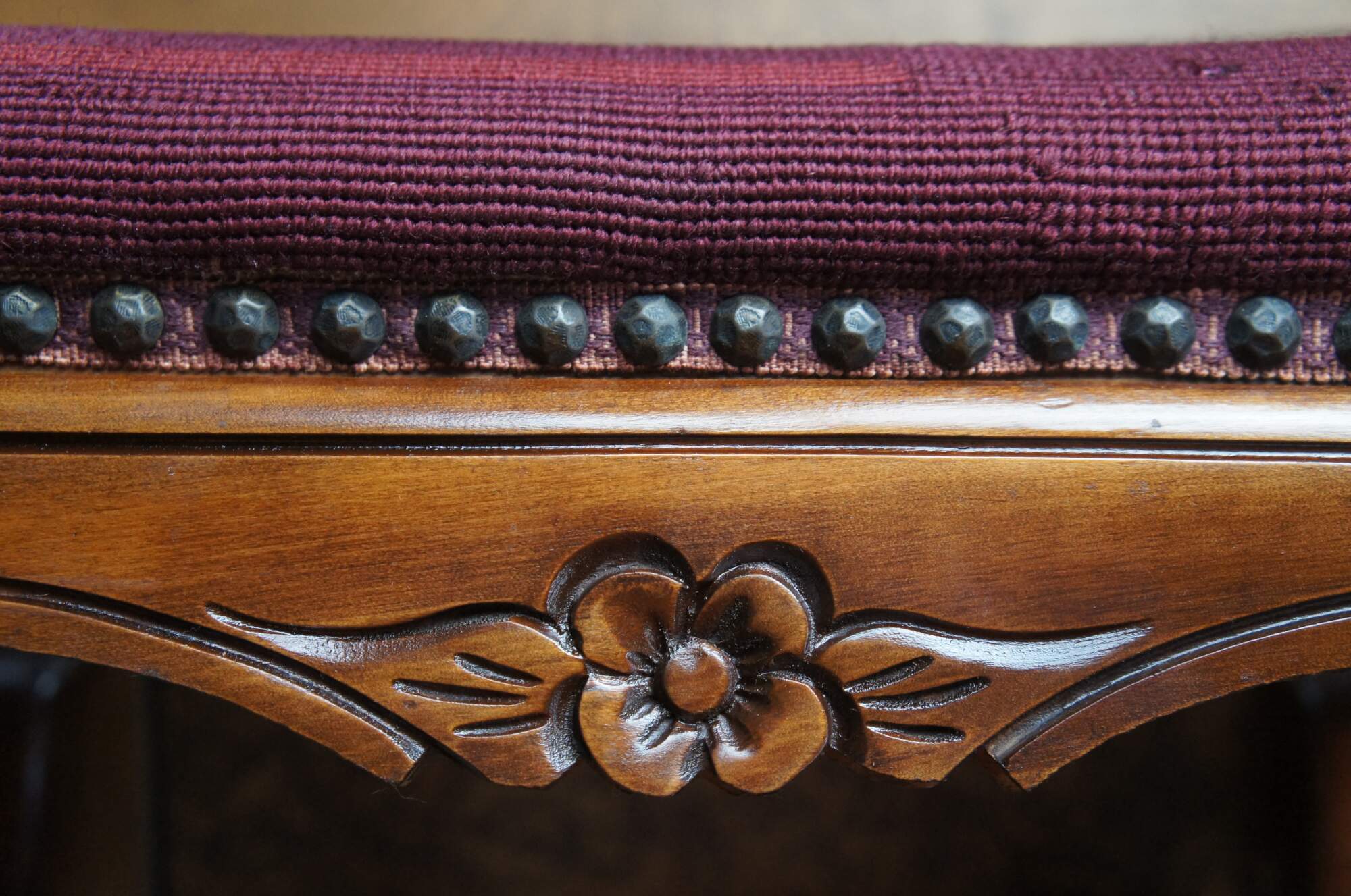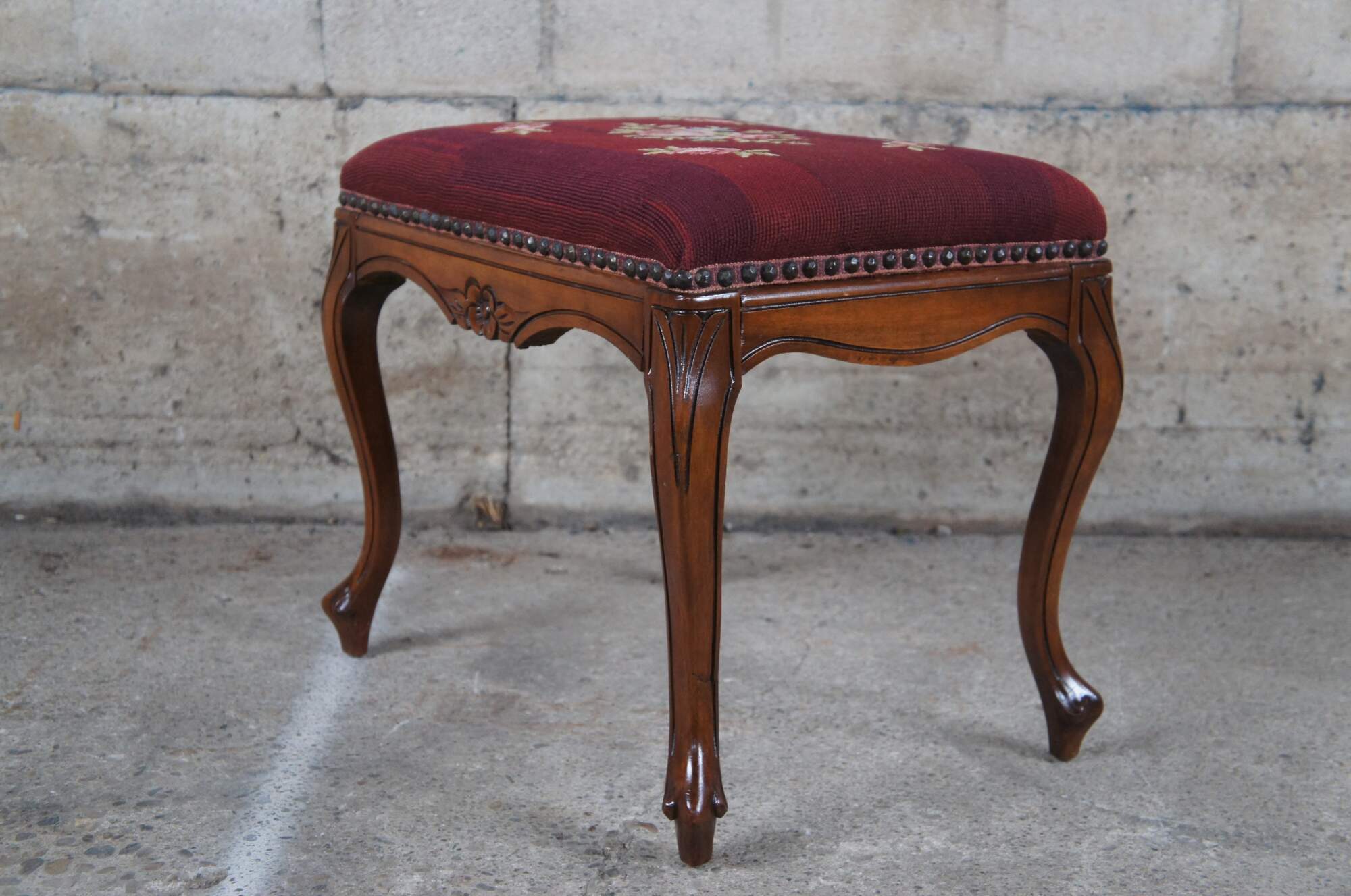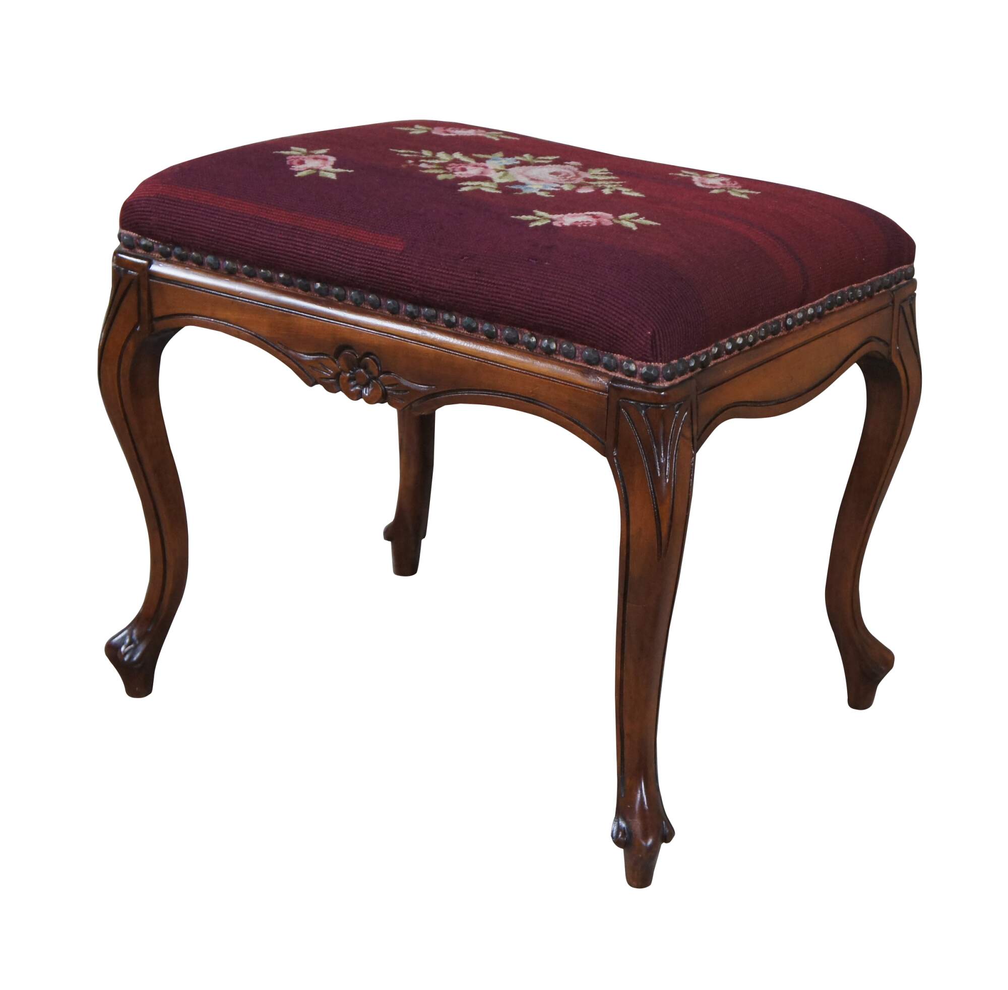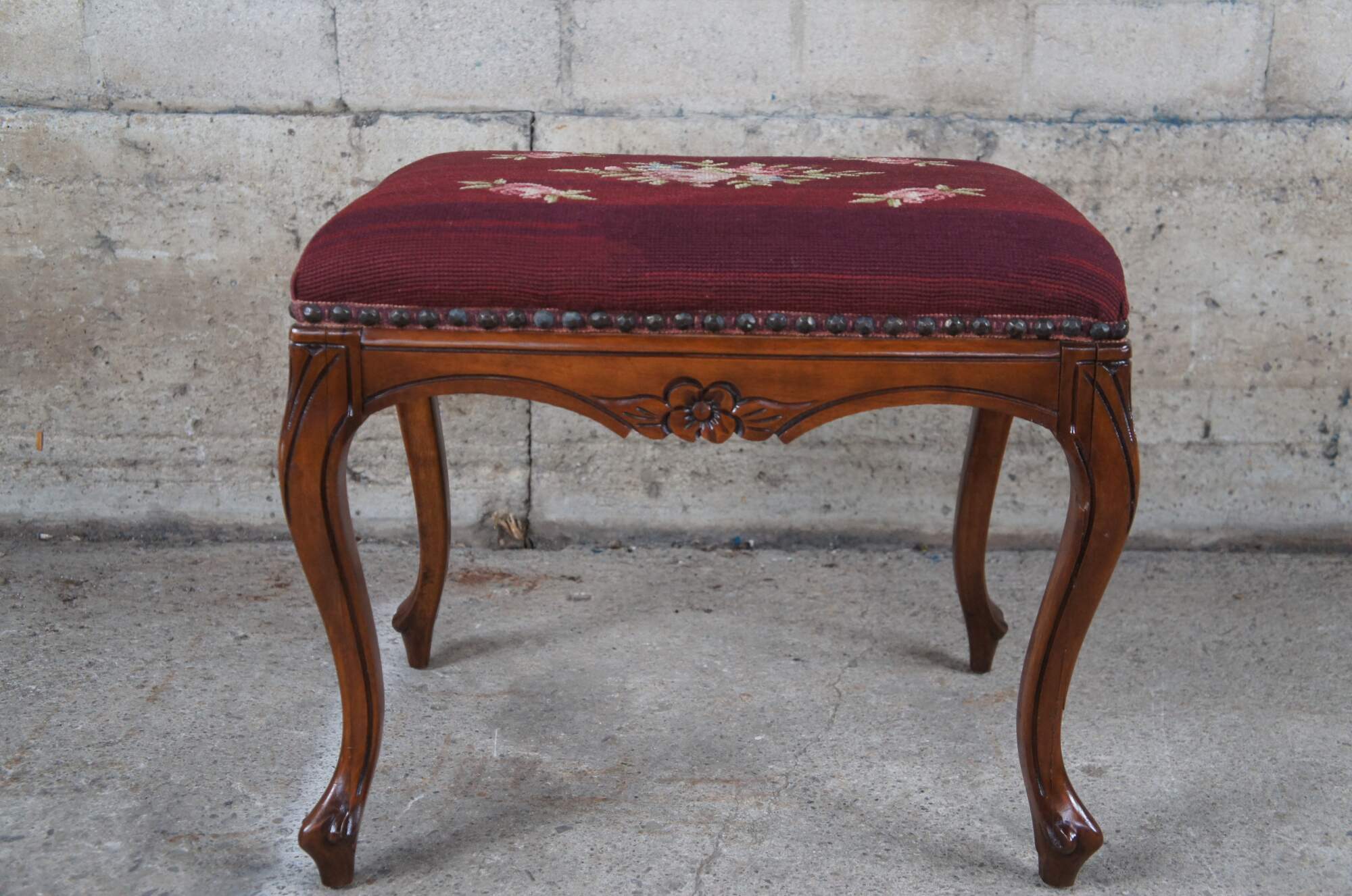 Vintage Provincial bench by Niehoff out of Oregon. Features a rectangular frame with floral embroidered seat, nail head trim and long cabriole legs.