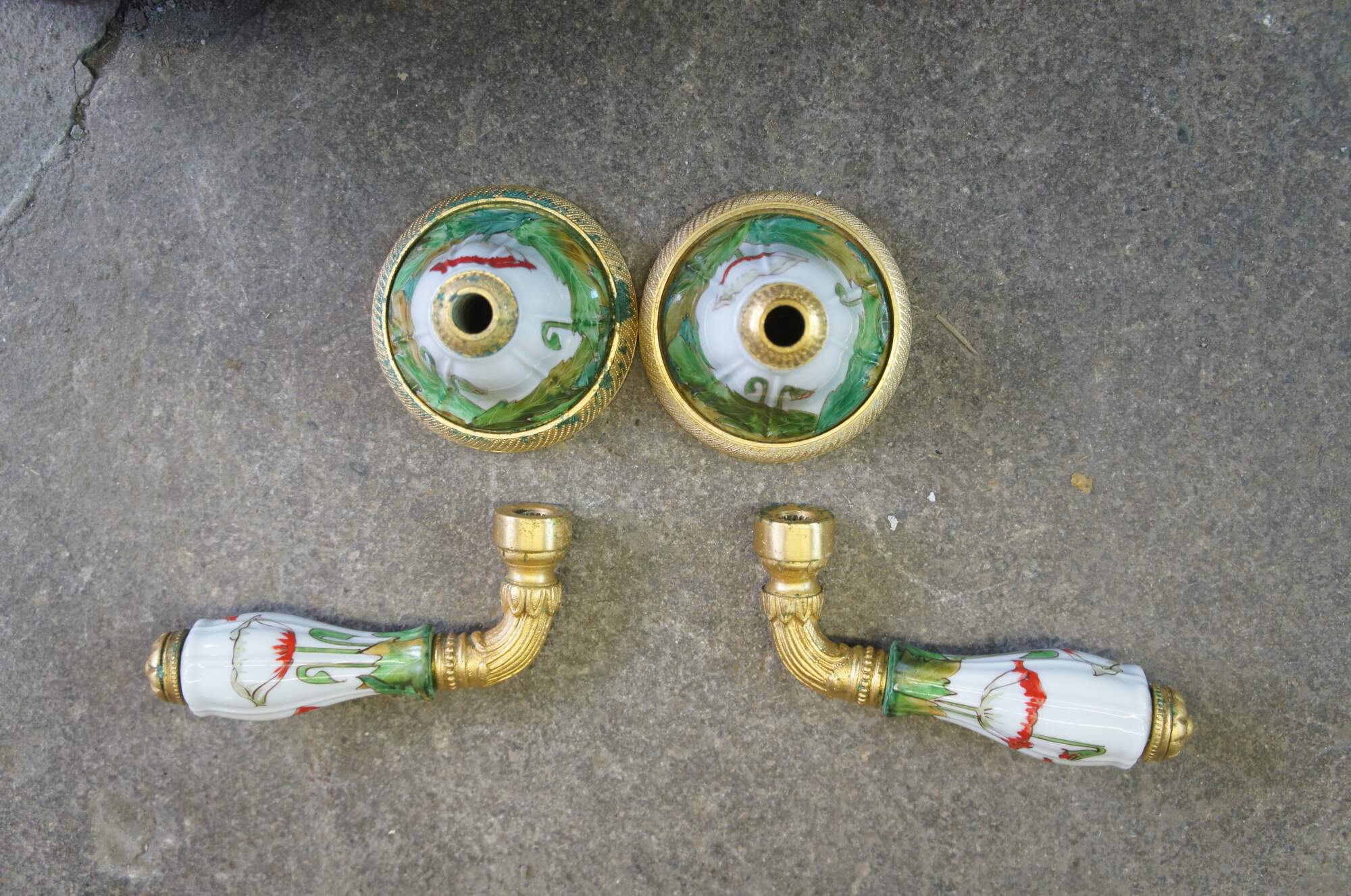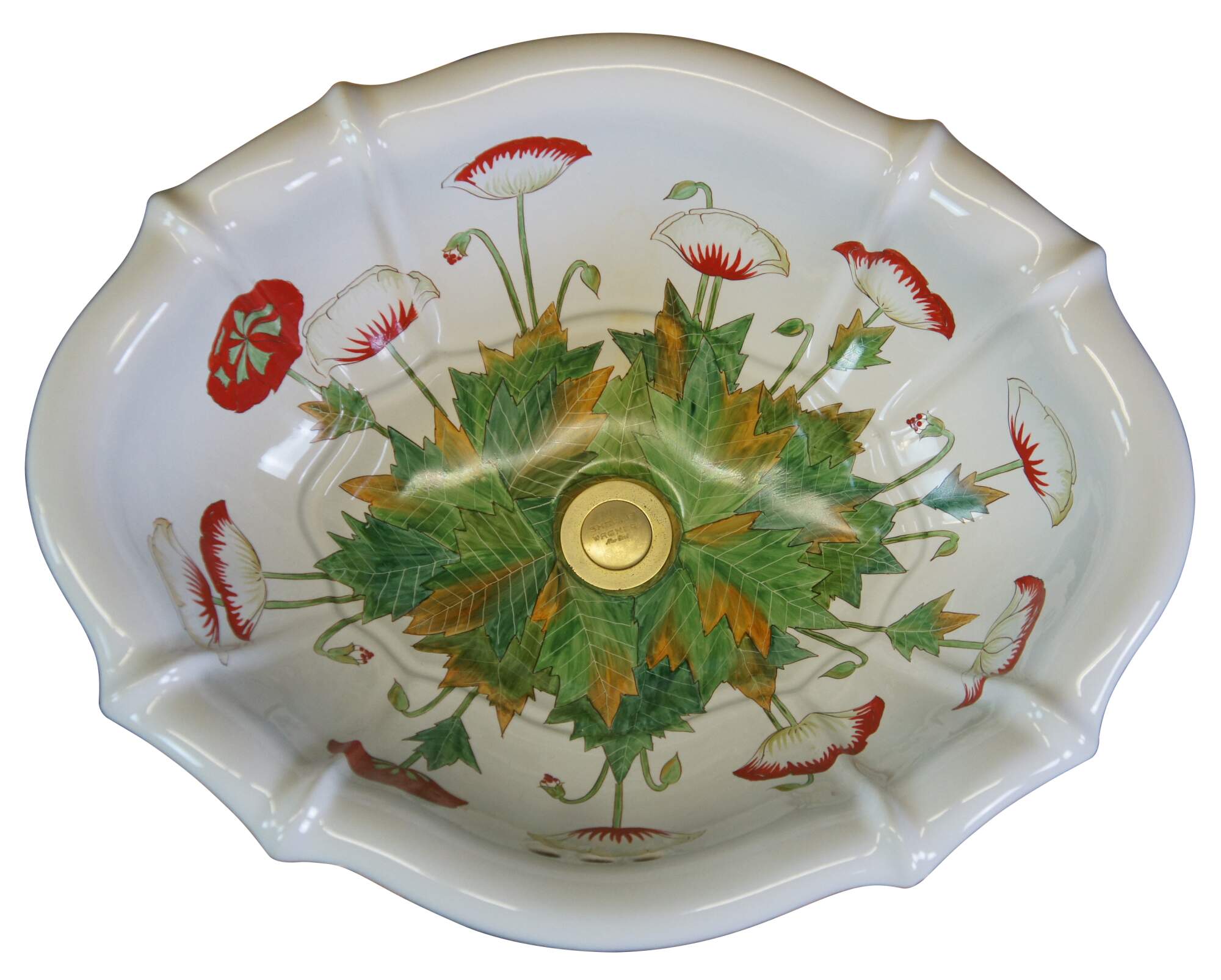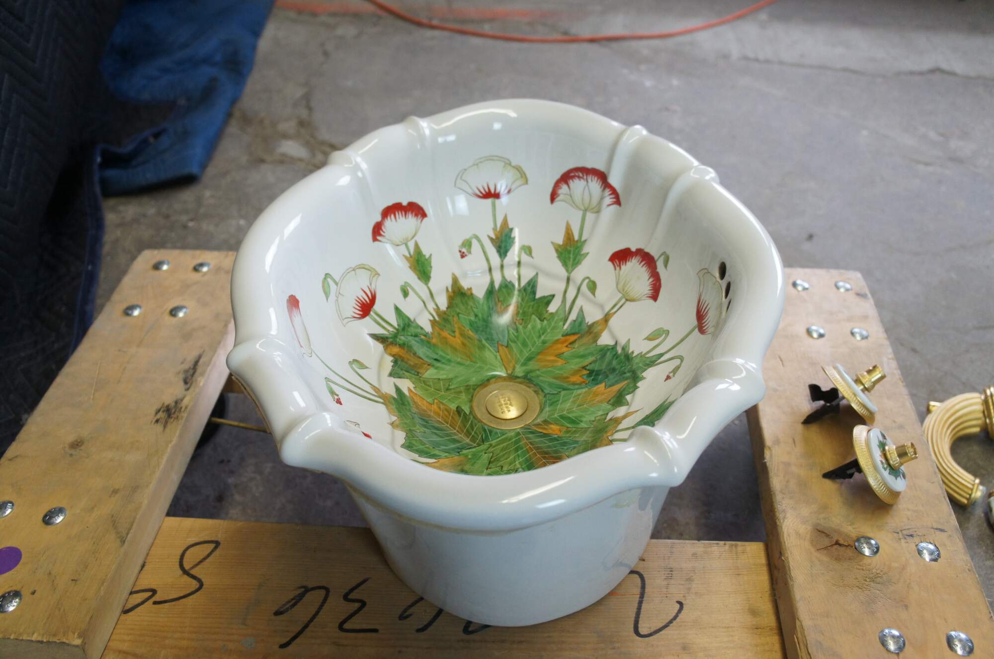 An exquisite collection of Sherlee Wagner pieces from the Poppy Flower Collection, circa 1960-70s. Hand painted Italian Porcelain with vivid greens and yellows over a white base. Includes; sink basin, toilet paper holder, faucet / spigot, hot & cold handles, Stopper with handle and glass towel bar with wall mounts. The elegant accessories all feature a 22-karat gold plated finish.
