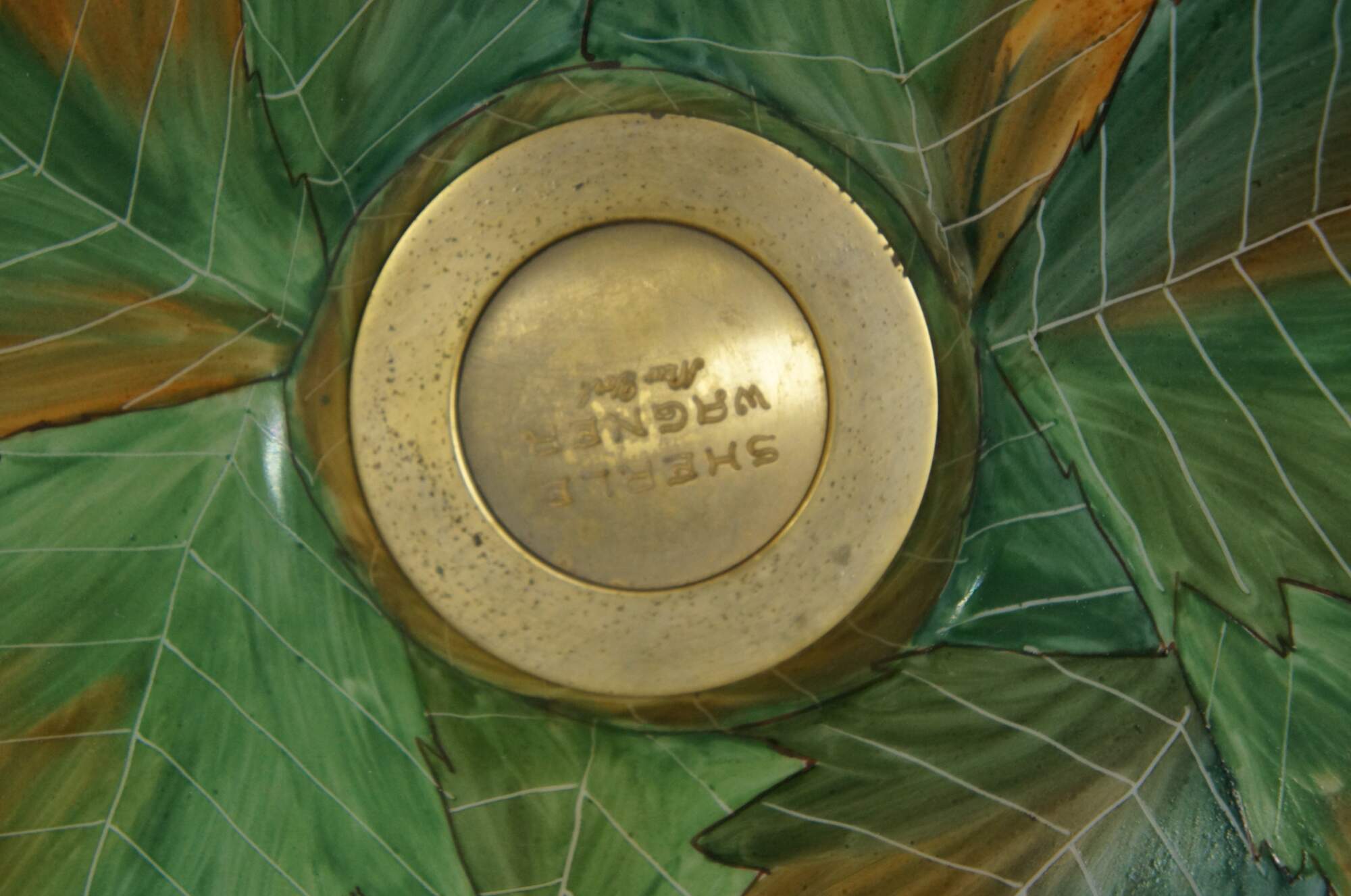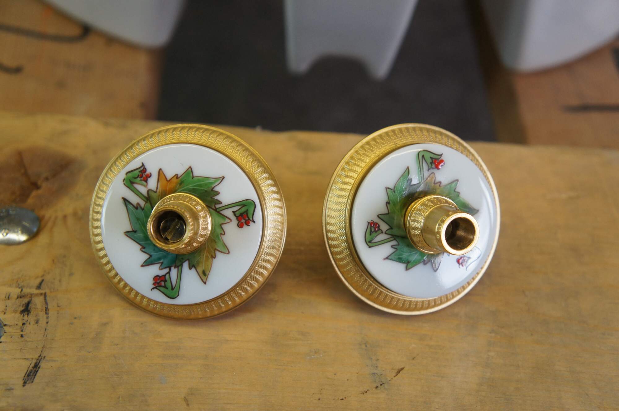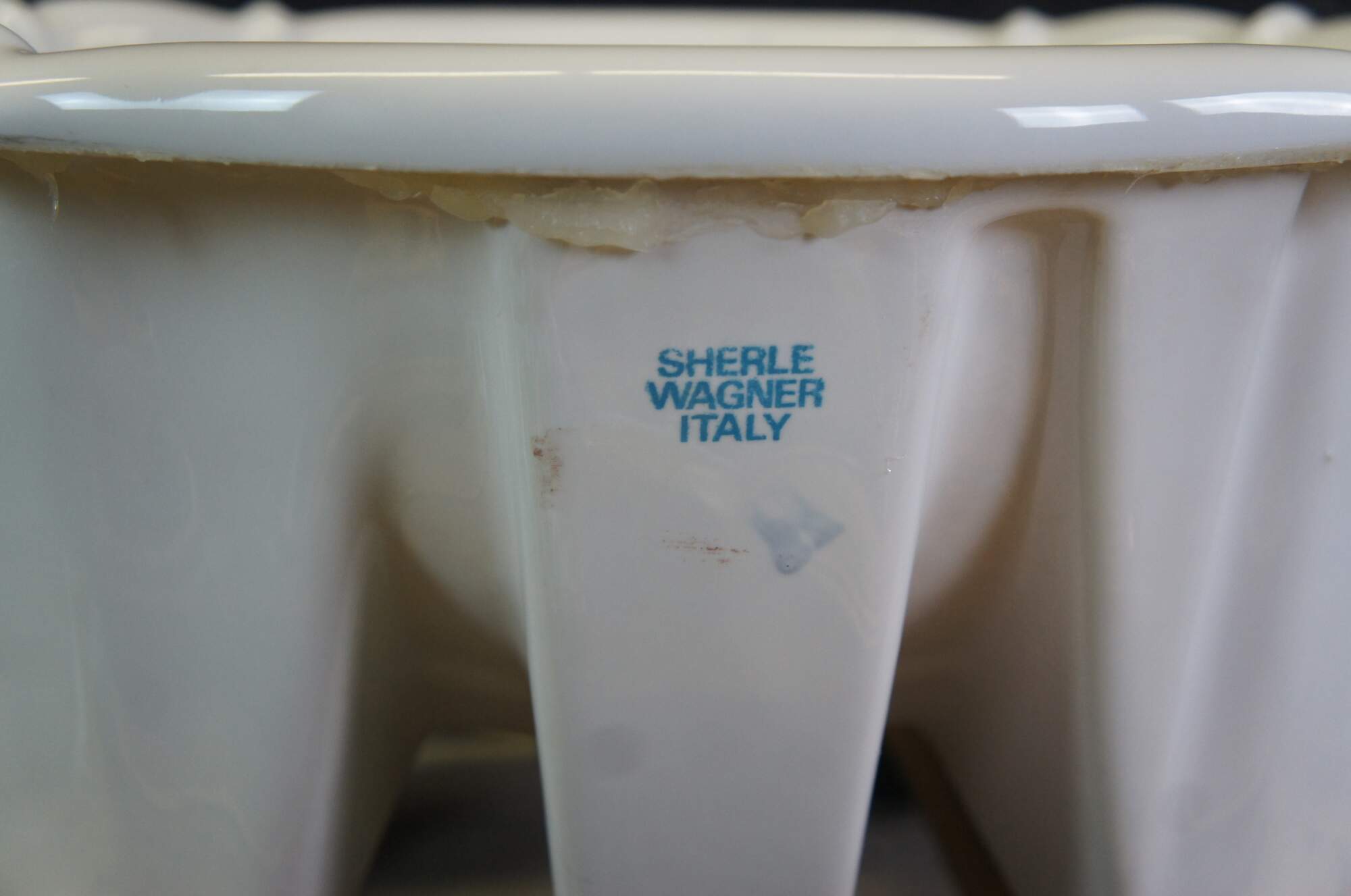 An exquisite collection of Sherlee Wagner pieces from the Poppy Flower Collection, circa 1960-70s. Hand painted Italian Porcelain with vivid greens and yellows over a white base. Includes; sink basin, toilet paper holder, faucet / spigot, hot & cold handles, Stopper with handle and glass towel bar with wall mounts. The elegant accessories all feature a 22-karat gold plated finish.