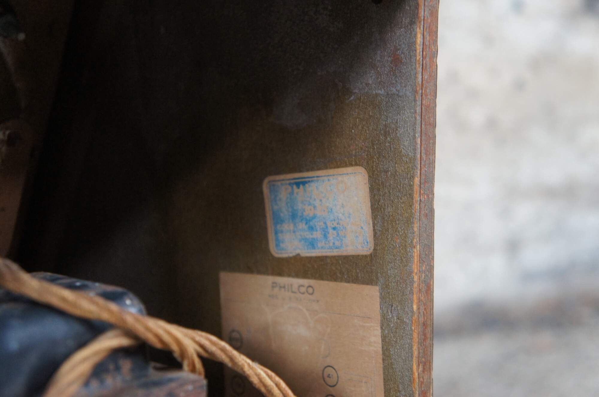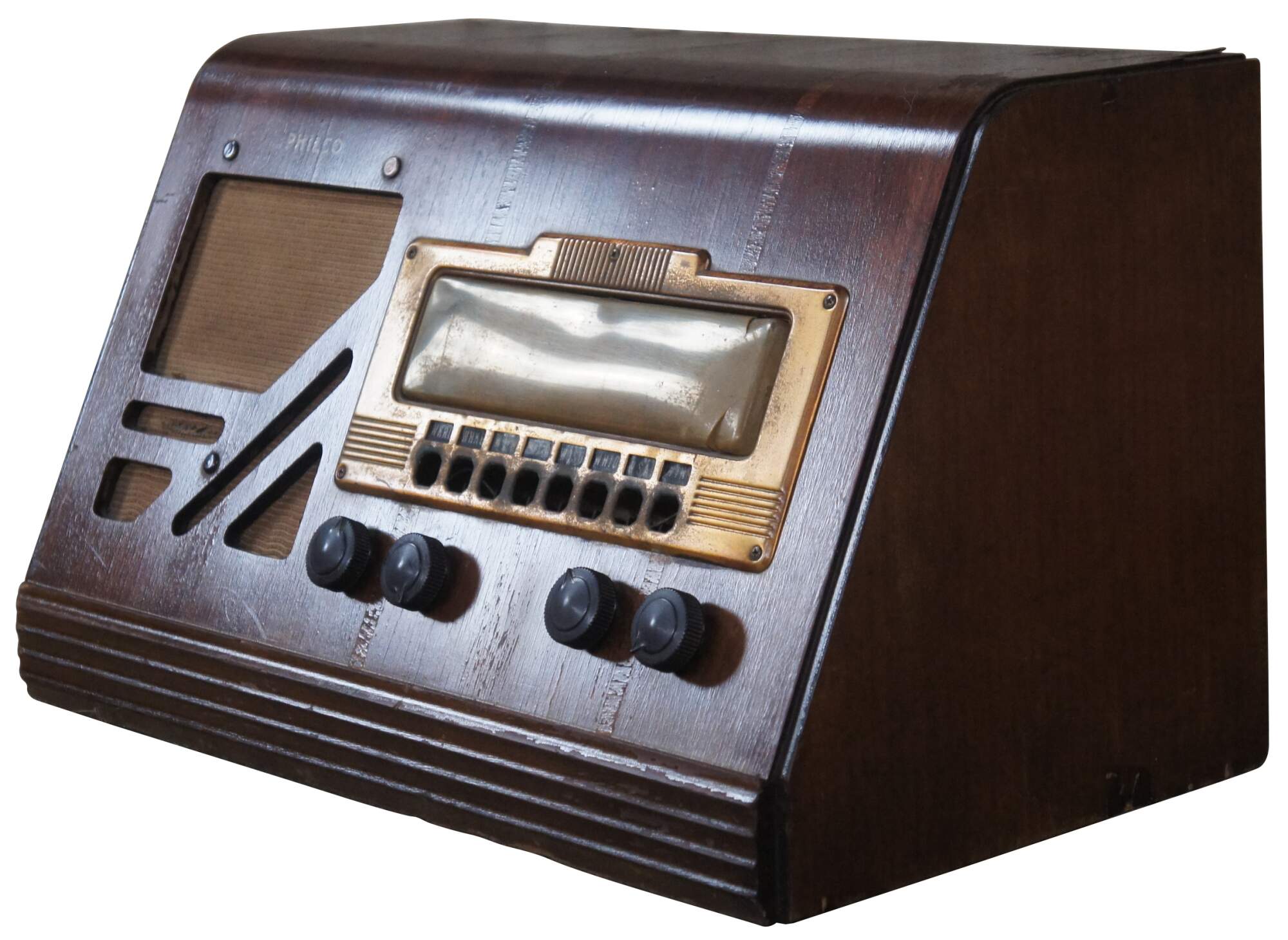 Philco 39-25 Tube Radio. Philco introduced inclined control panels in 1938. Using five tubes and eight electronic pushbuttons to complete a two band coverage. Operating on 115 Volts AC