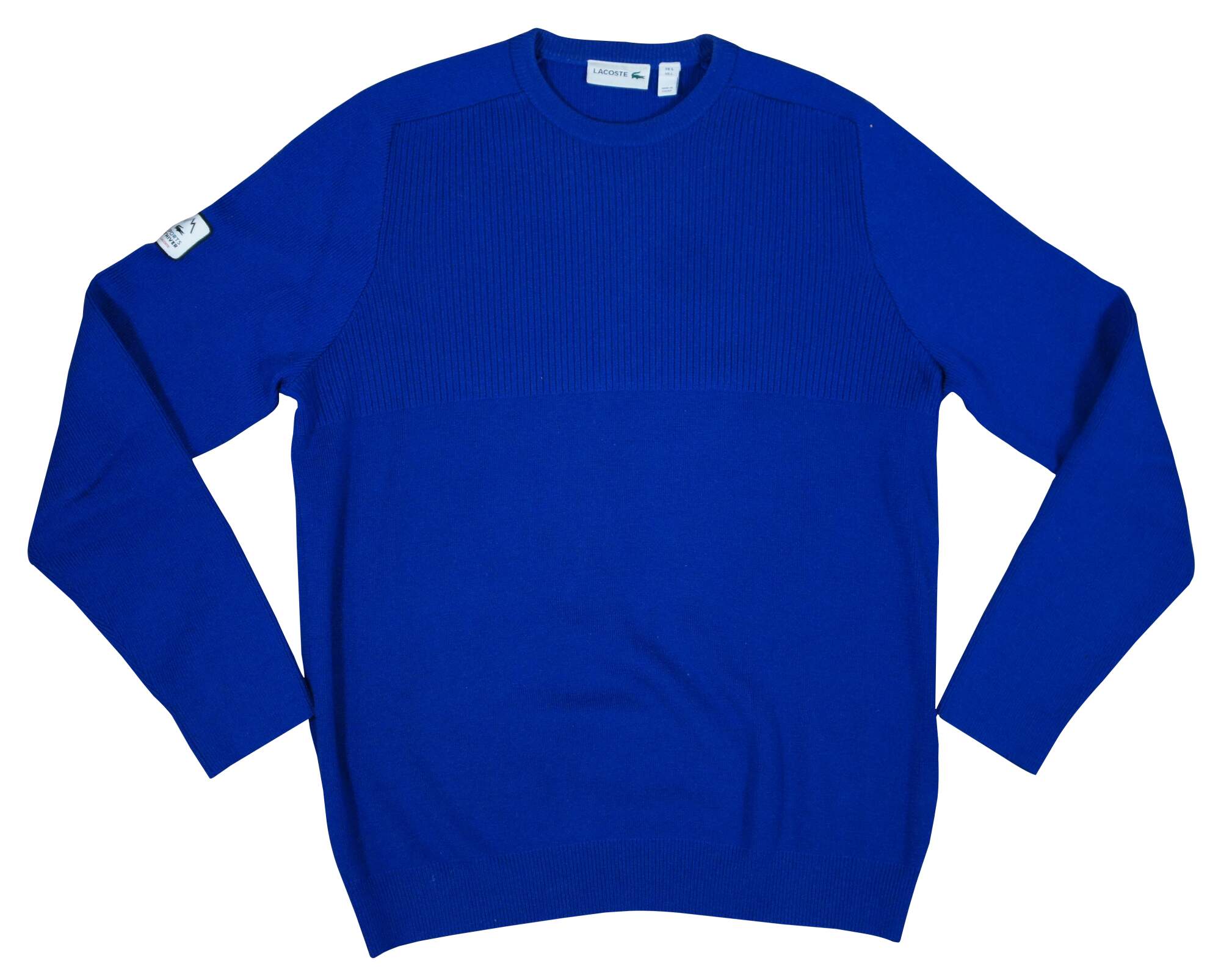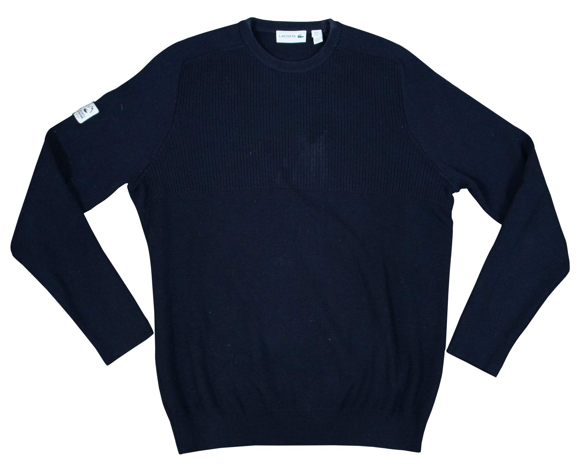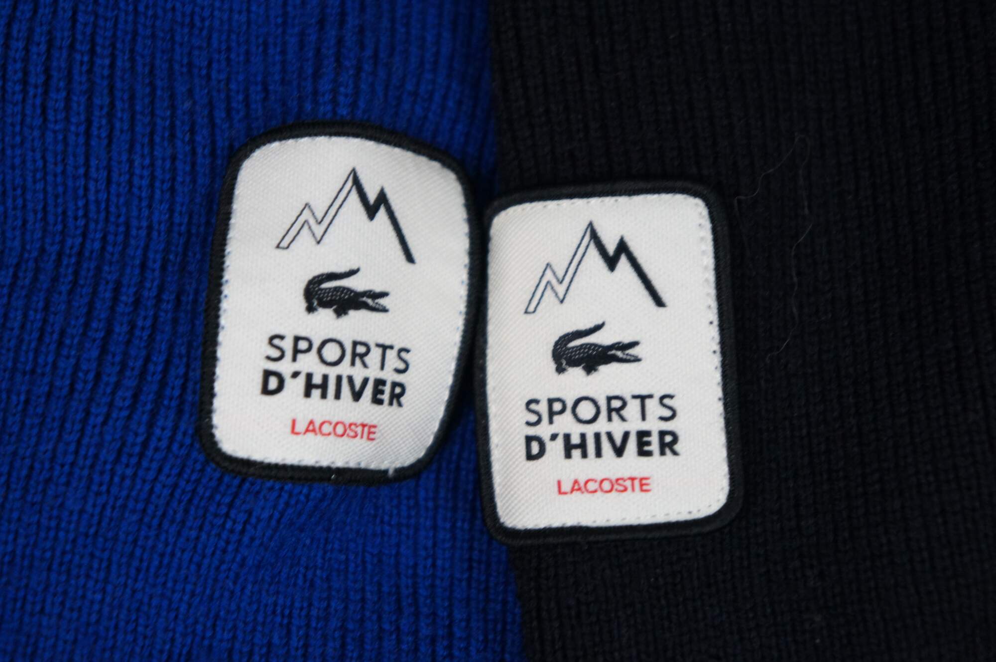 Pair of Lacoste Sports D’Hiver pull over long sleeve sweaters in bright blue and plain black.Very Good – Slight marks to black sweater, should wash out