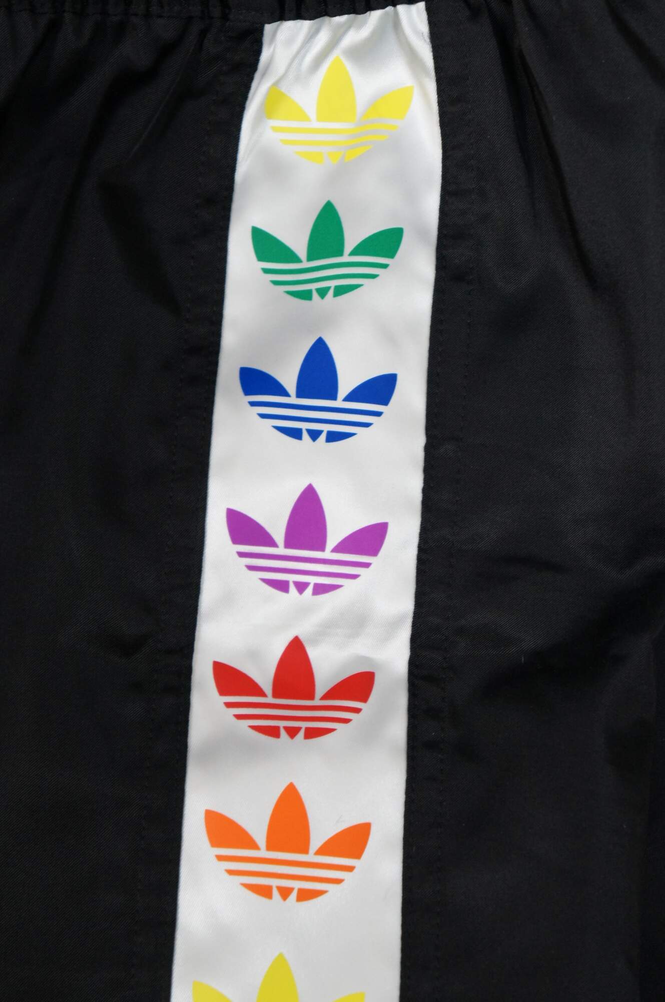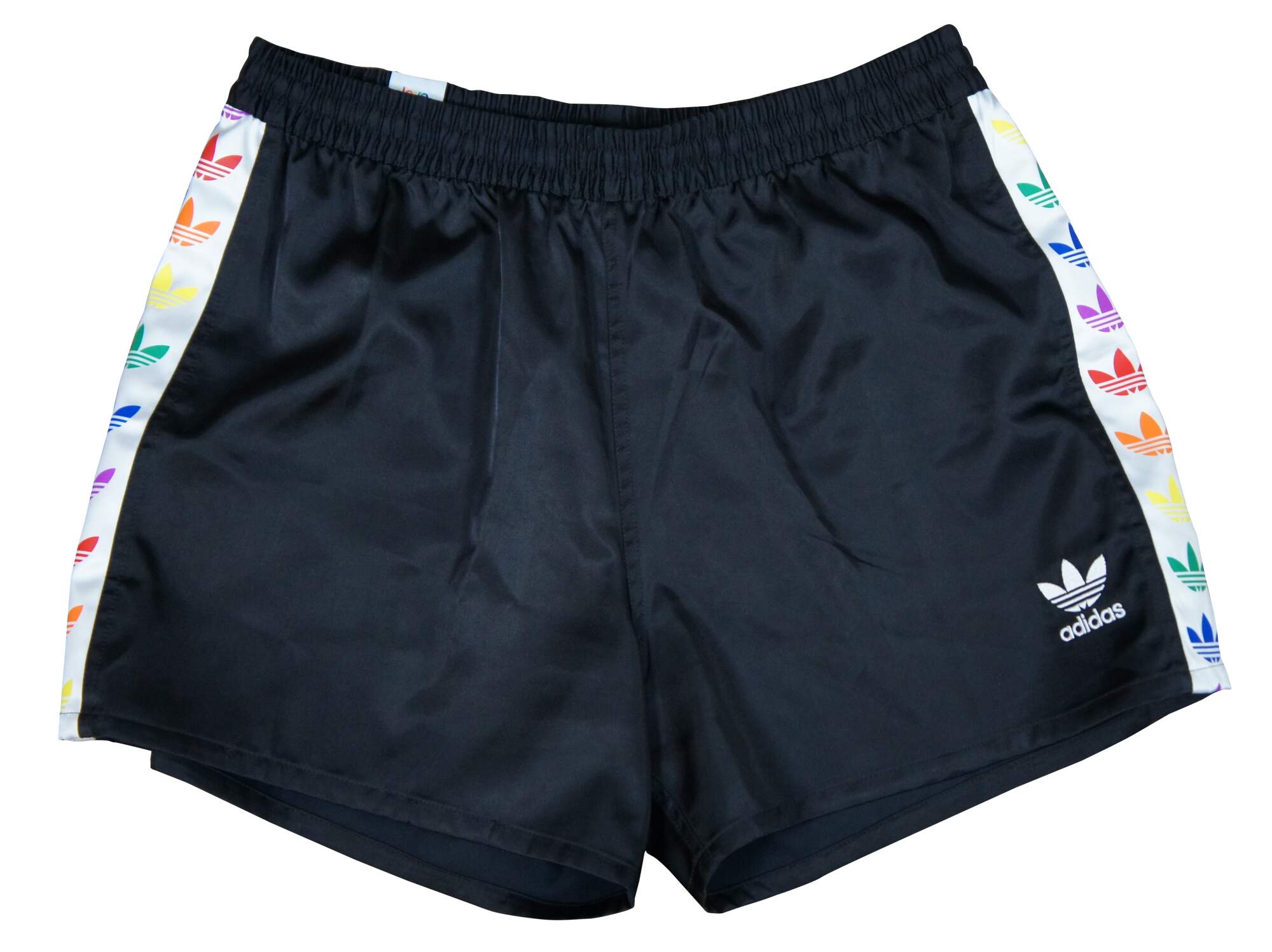 Adidas black and white Pride athletic shorts with rainbow logos and Love Unites tag, two side pockets, one rear pocket and elasticized / drawstring waist.