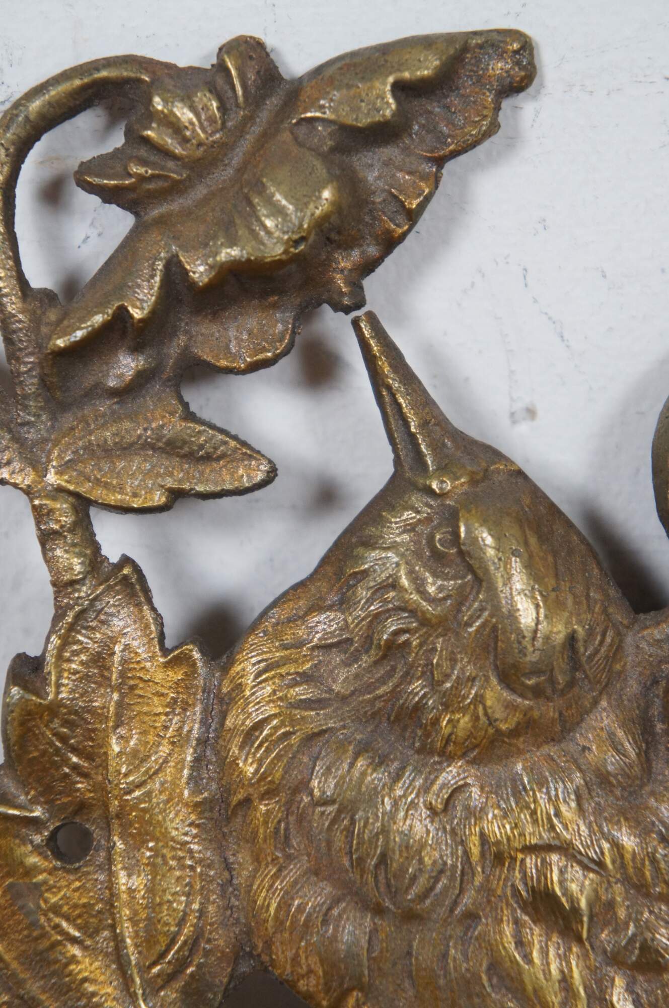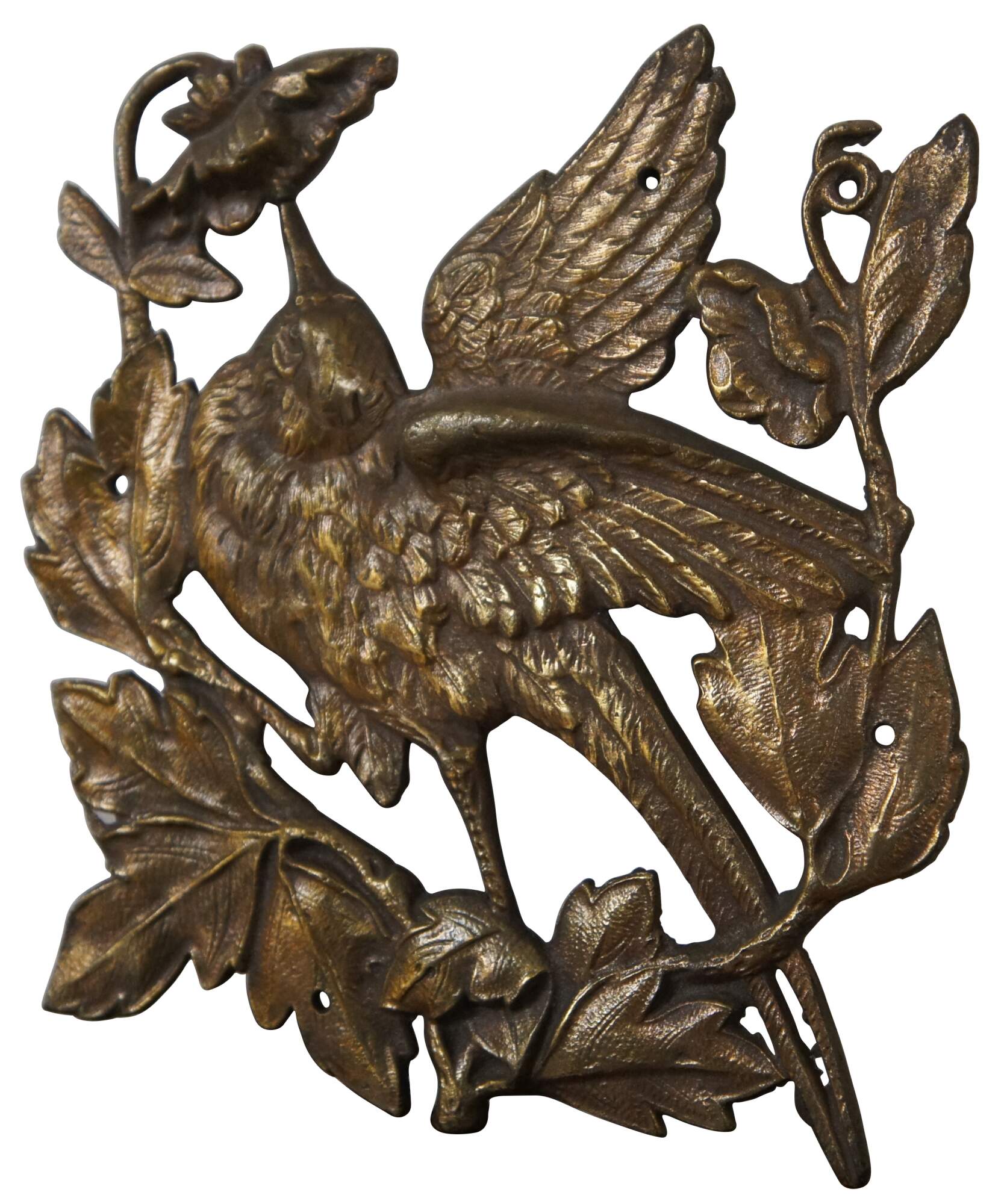 Vintage cast bronze wall plaque in the shape of a bird perched on a leafy branch with two flowers.
