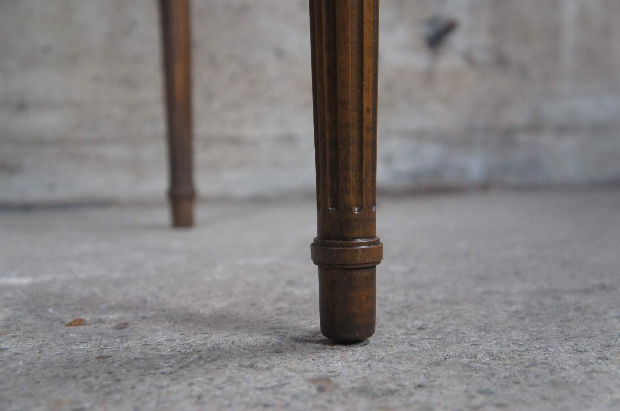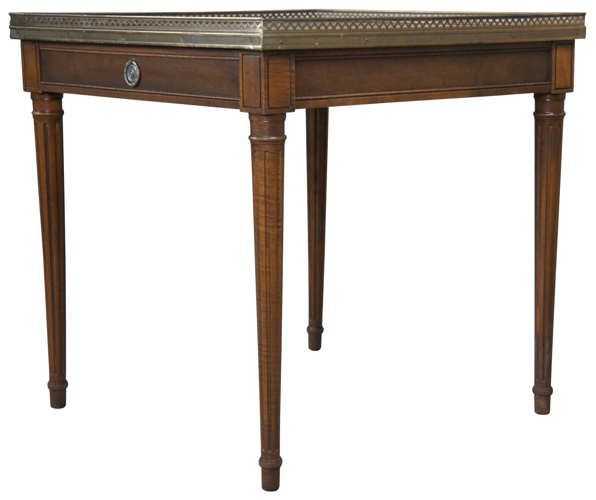 Vintage Baker Furniture French Louis XVI style side table, circa last quarter 20th century. Made from walnut with crotch veneered top inset around a pierced brass gallery. Large central drawer is dovetailed with brass knocker style drawer pull. The table is supported by fluted and tapered legs.