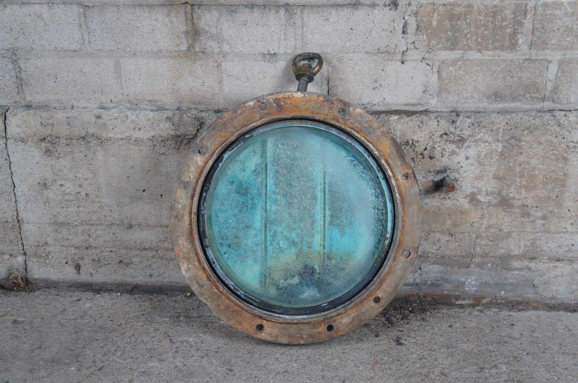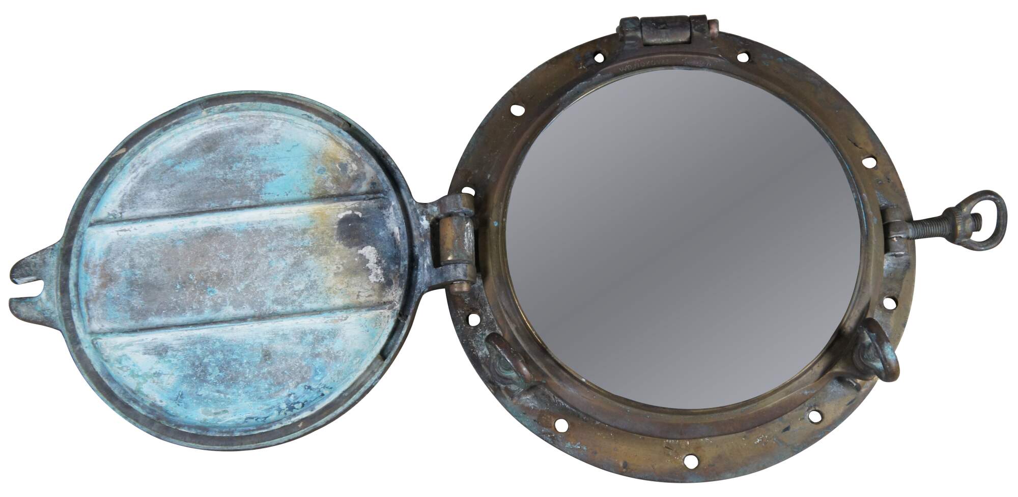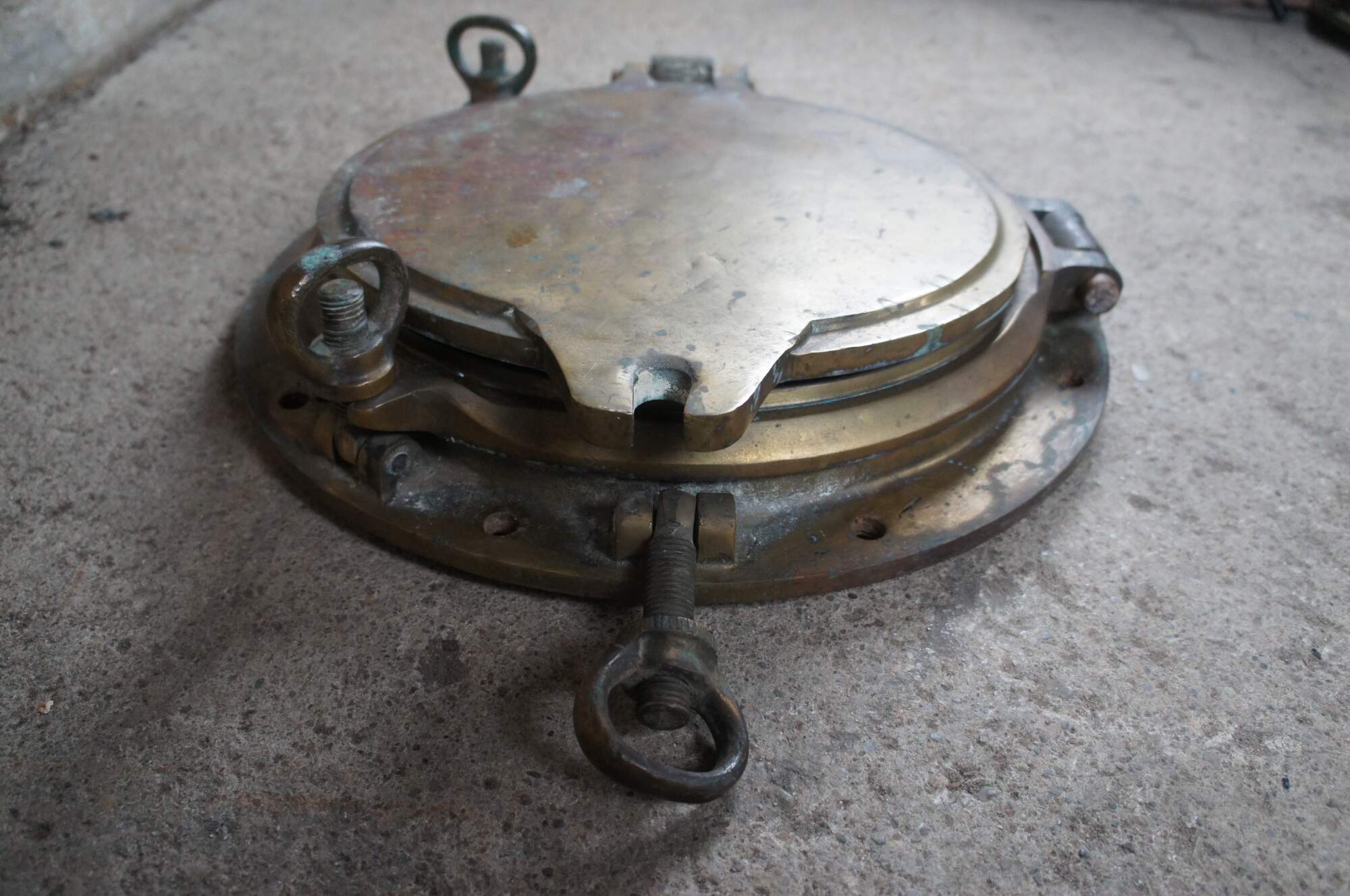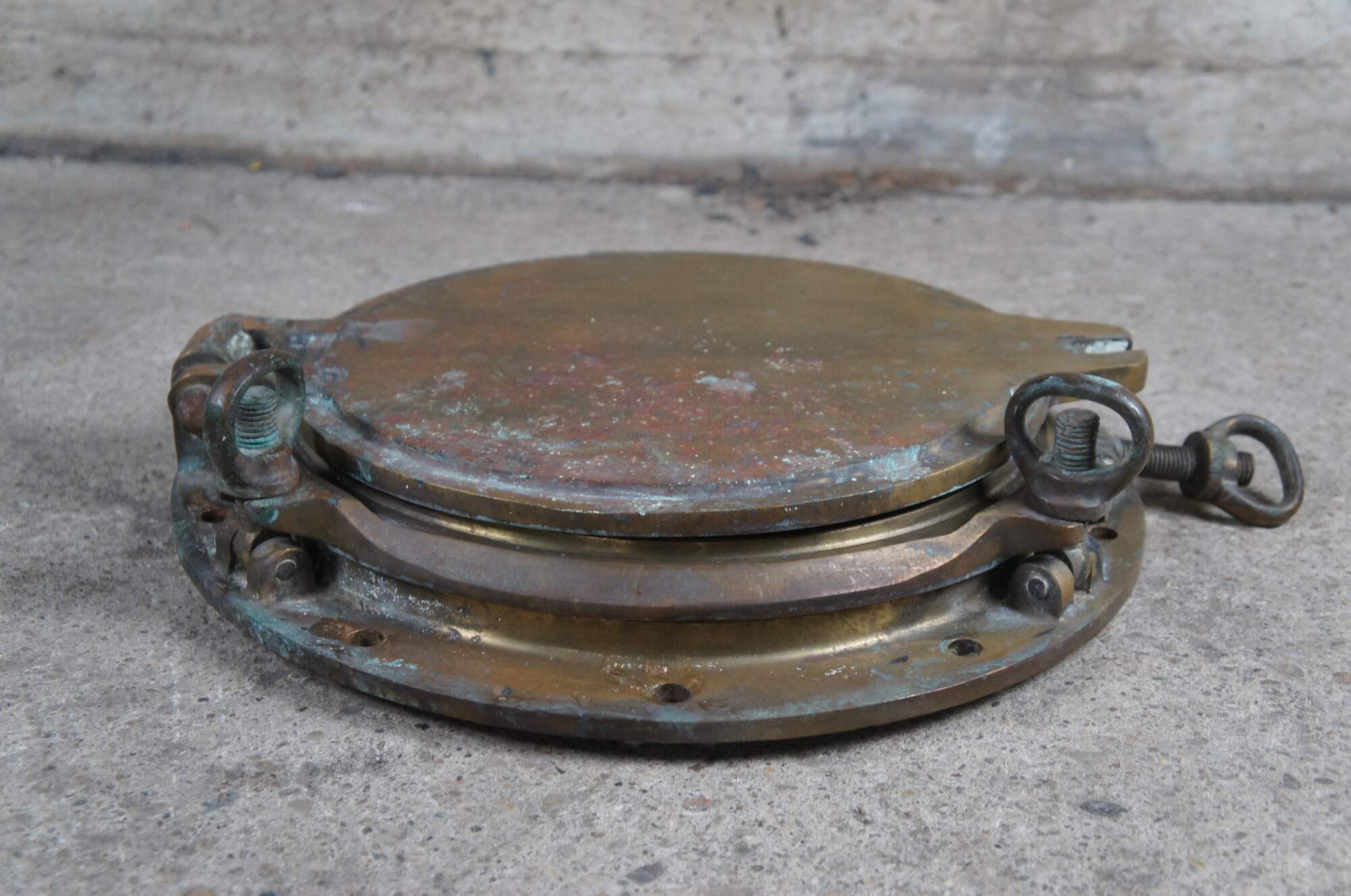 Extremely unique original antique heavy solid brass maritime Ship's Porthole or Hatch. A rare find with storm door, swing plate and barking plate. Its very unusual to find a complete porthole with swing plate. They are most often found as just a barking plate or window with storm door. The majority are rather simple and made from aluminum or nickel plated rather than heavy brass like this unique specimen. The vast majority of portholes on the market today are modern or reproduction's. This aged beauty is complete with original green glass and 3 dogs. Marked Wojidkows Sweden. High quality construction and hefty weight, 65 lbs