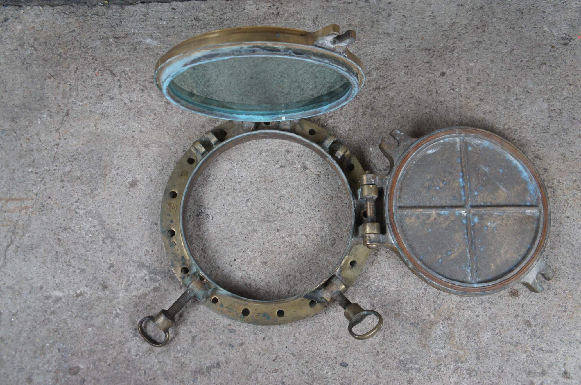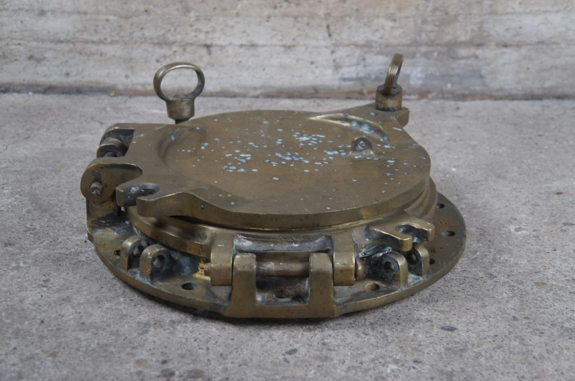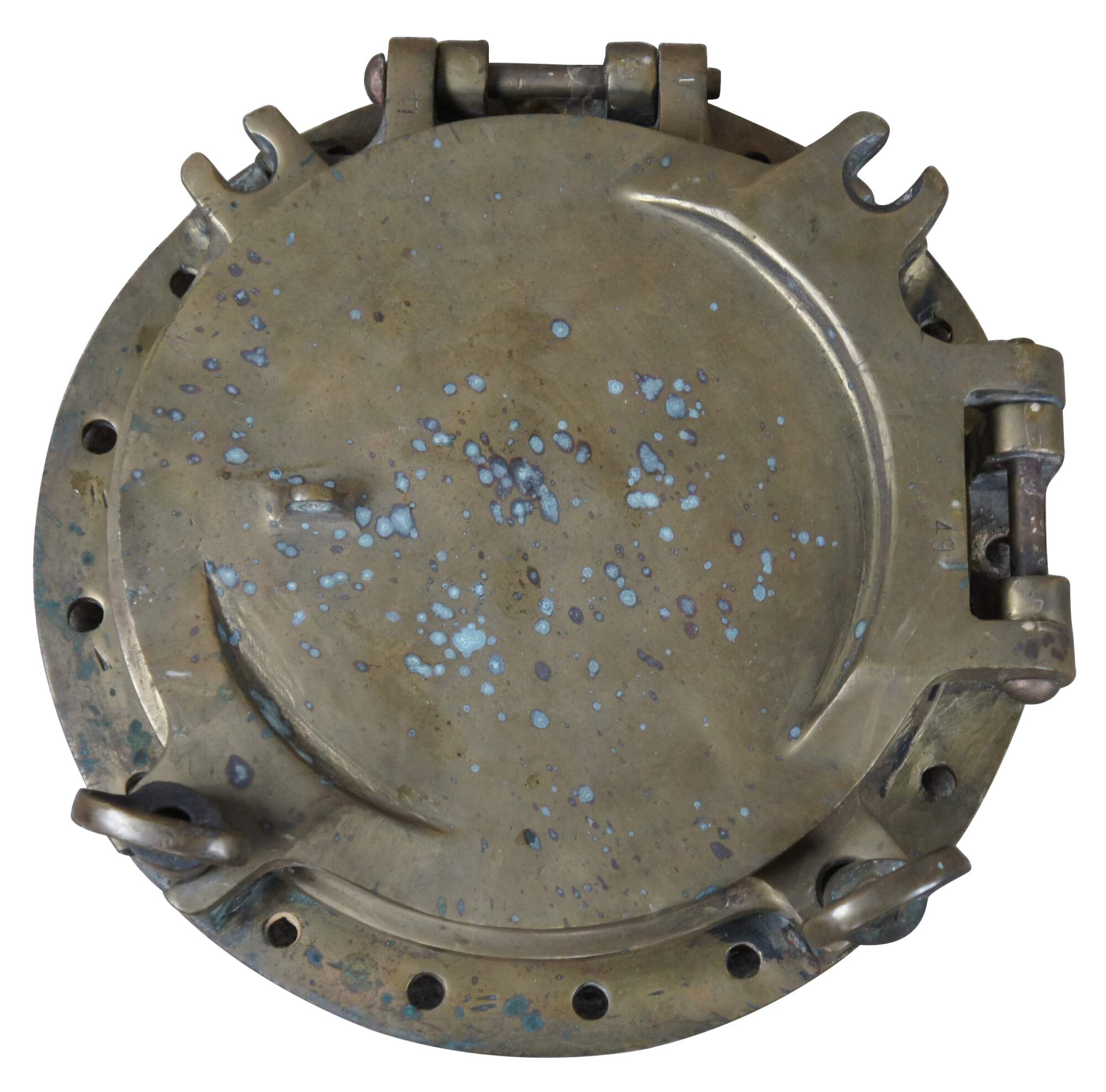 Extremely unique original antique heavy solid brass maritime Ship's Porthole or Hatch. A rare find with storm door, swing plate and barking plate. Its very unusual to find a complete porthole with swing plate. They are most often found as just a barking plate or window with storm door. The majority are rather simple and made from aluminum or nickel plated rather than heavy brass like this unique specimen. The vast majority of portholes on the market today are modern or reproduction's. This aged beauty is complete with original green glass and 4 dogs. High quality construction and hefty weight, 103 lbs. Marked 2260,49