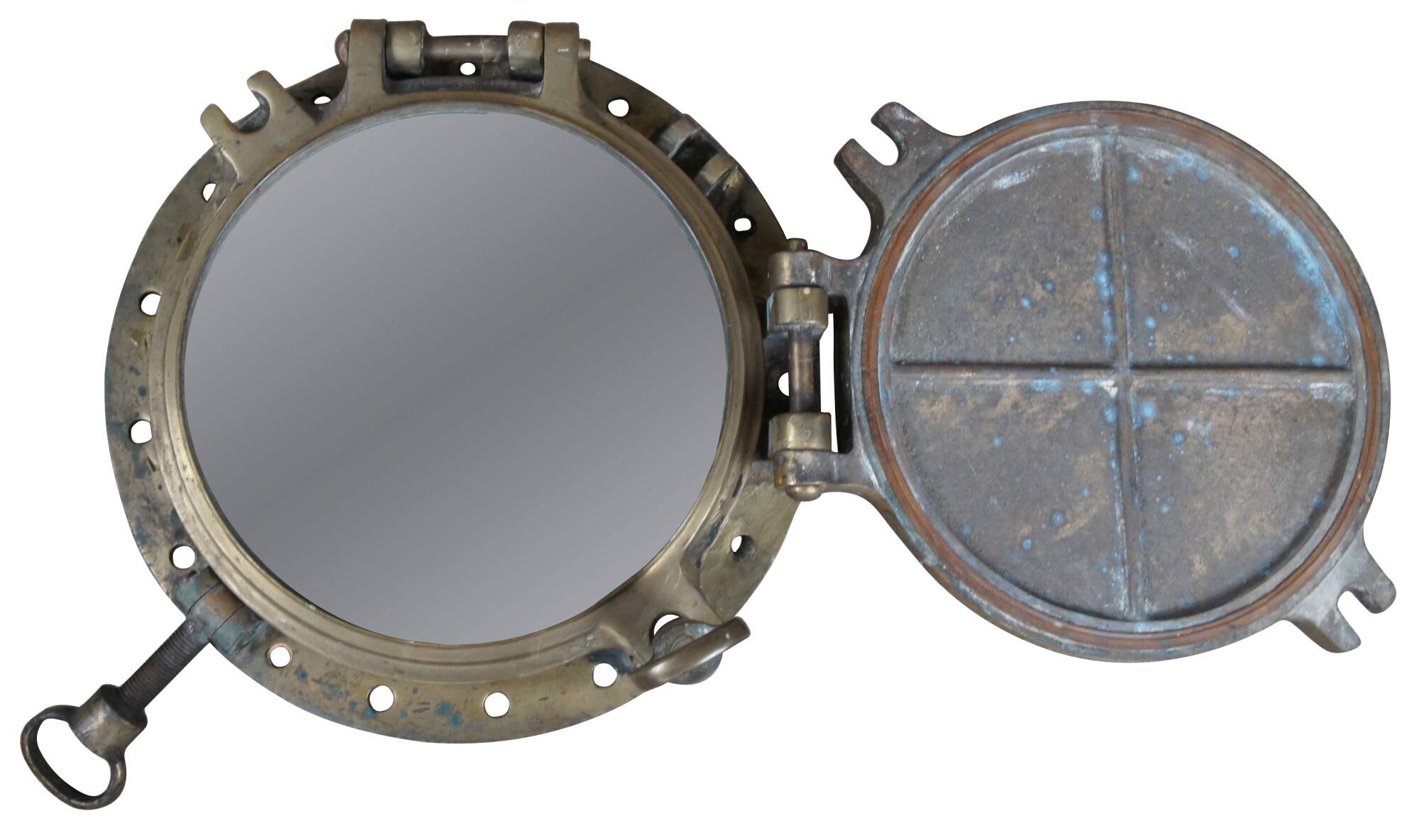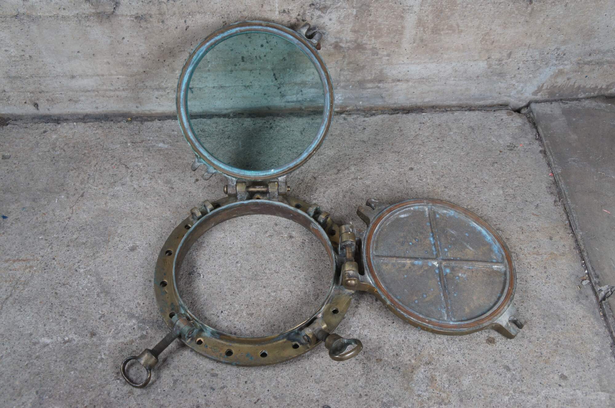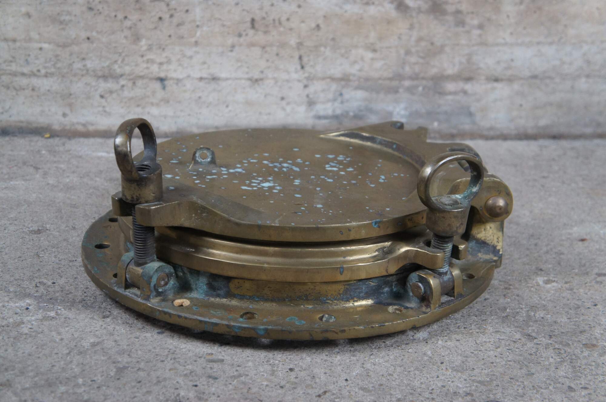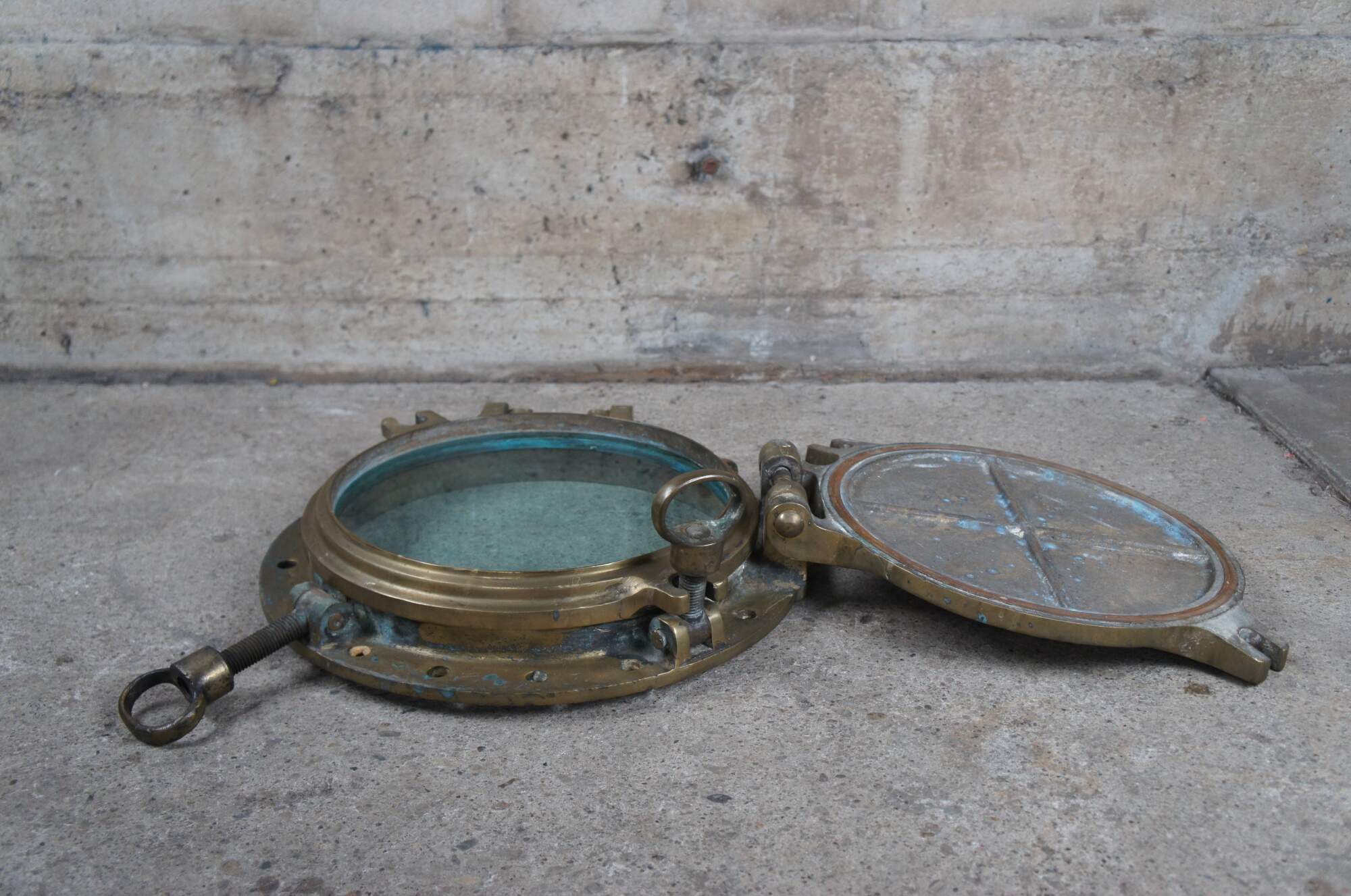 Extremely unique original antique heavy solid brass maritime Ship's Porthole or Hatch. A rare find with storm door, swing plate and barking plate. Its very unusual to find a complete porthole with swing plate. They are most often found as just a barking plate or window with storm door. The majority are rather simple and made from aluminum or nickel plated rather than heavy brass like this unique specimen. The vast majority of portholes on the market today are modern or reproduction's. This aged beauty is complete with original green glass and 4 dogs. High quality construction and hefty weight, 103 lbs. Marked 2260,49