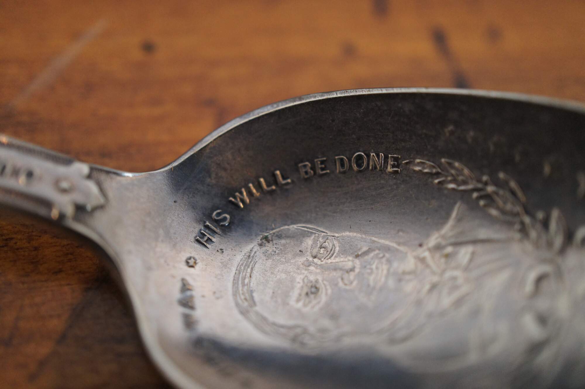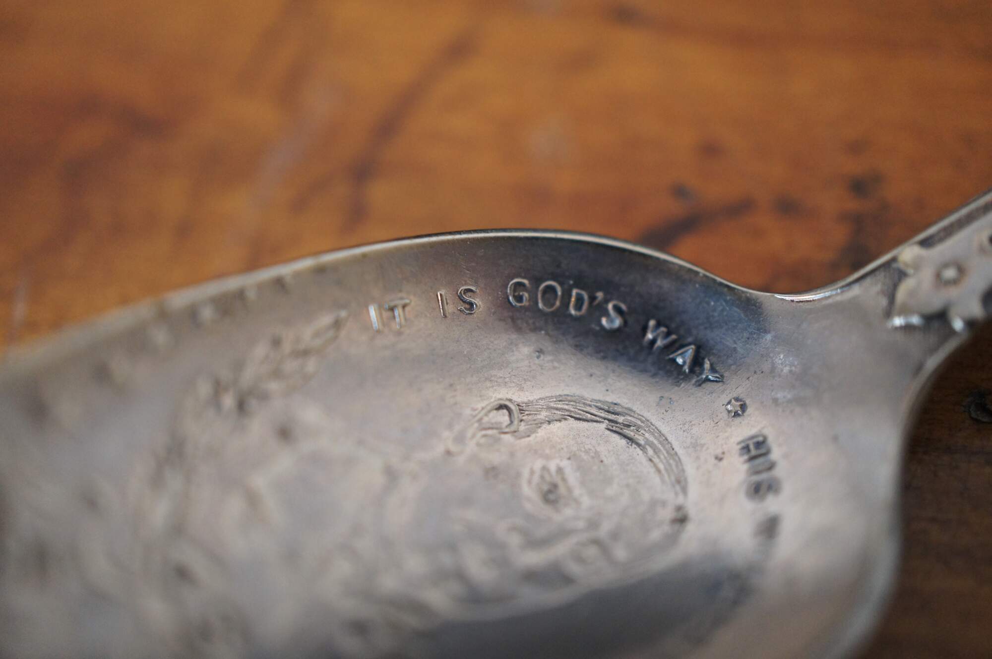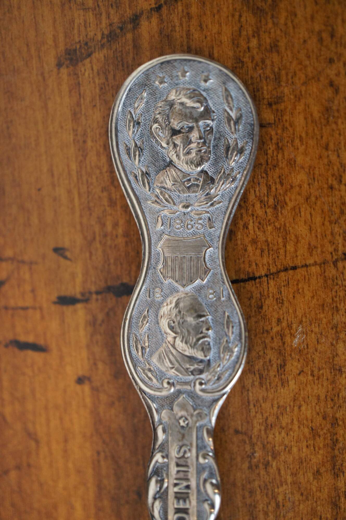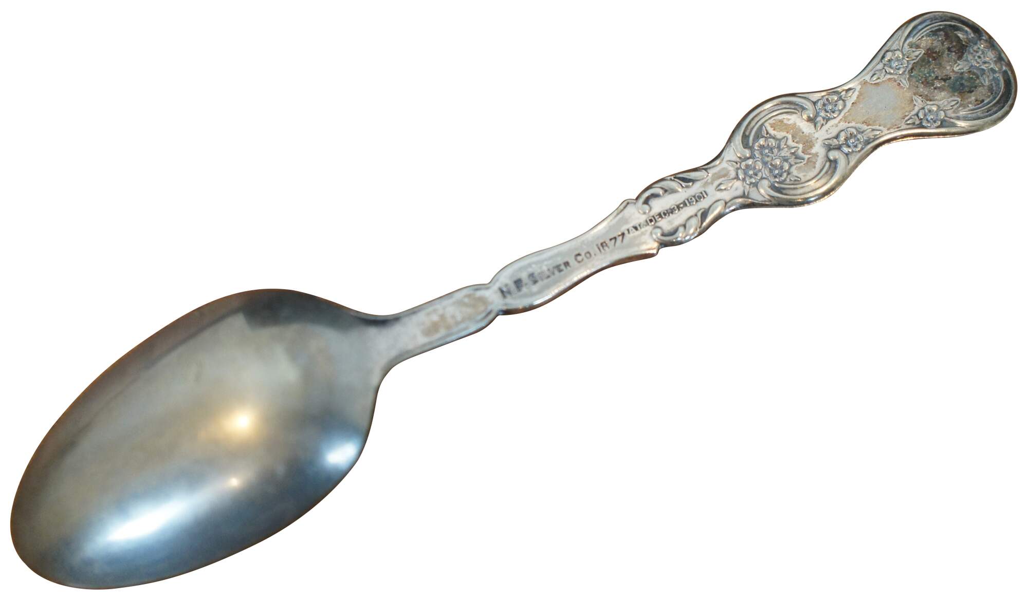 Antique sterling silver souvenir spoon manufactured by N.F. (Niagara Falls) Silver Company. Design patented December 3, 1901 to commemorate the assassination of President William McKinley on September 14th of that year. McKinley’s portrait sits in the bowl of the spoon framed in the words “It Is God’s Way – His Will Be Done” and a laurel wreath, above 1901 and an American eagle. The top of the spoon shows the two other predidents assassinated before McKinley, Abraham Lincoln (1865) and James A. Garfield (1881), separated by a Union shield of stars and stripes. A plaque design on the handle titles the spoon “Our Martyred Presidents.” Reverse of the handle sports the makers mark and a floral flatware pattern.