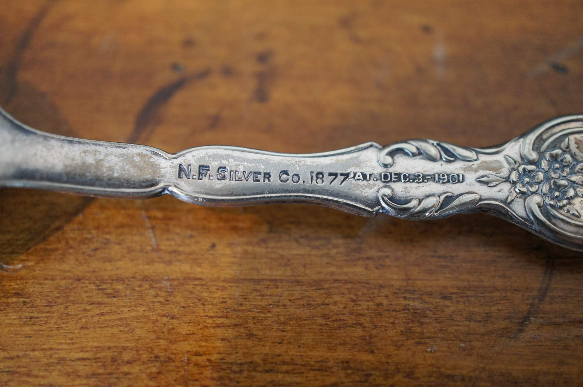 ""Niagara Falls Silver Co 1877 is a trademark of Oneida Silversmiths. Tableware manufacture began in 1877. Incorporated in New York in 1880 under the name Oneida Community Limited. Moved to Niagara Falls in 1880. Moved to Sherrill, NY in 1912-1914. Name changed to Oneida Ltd in 1935.""