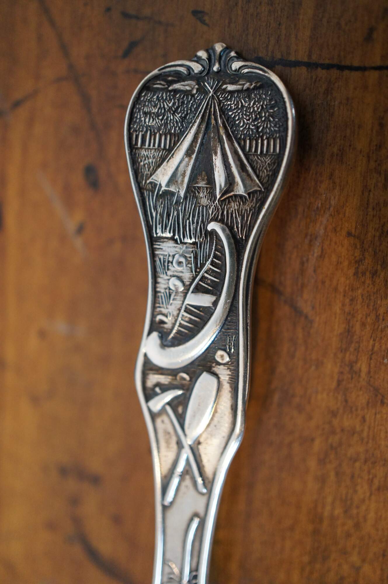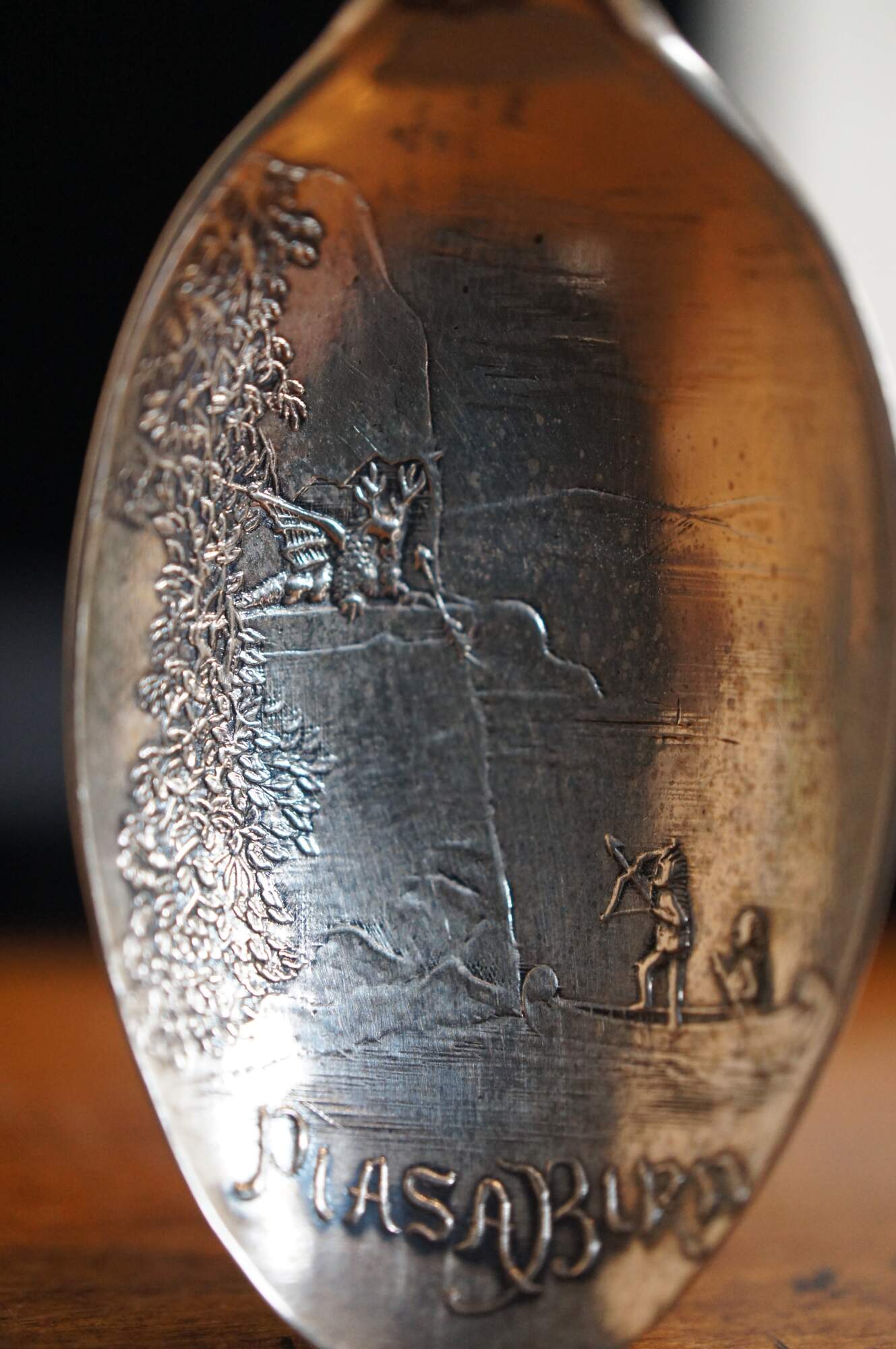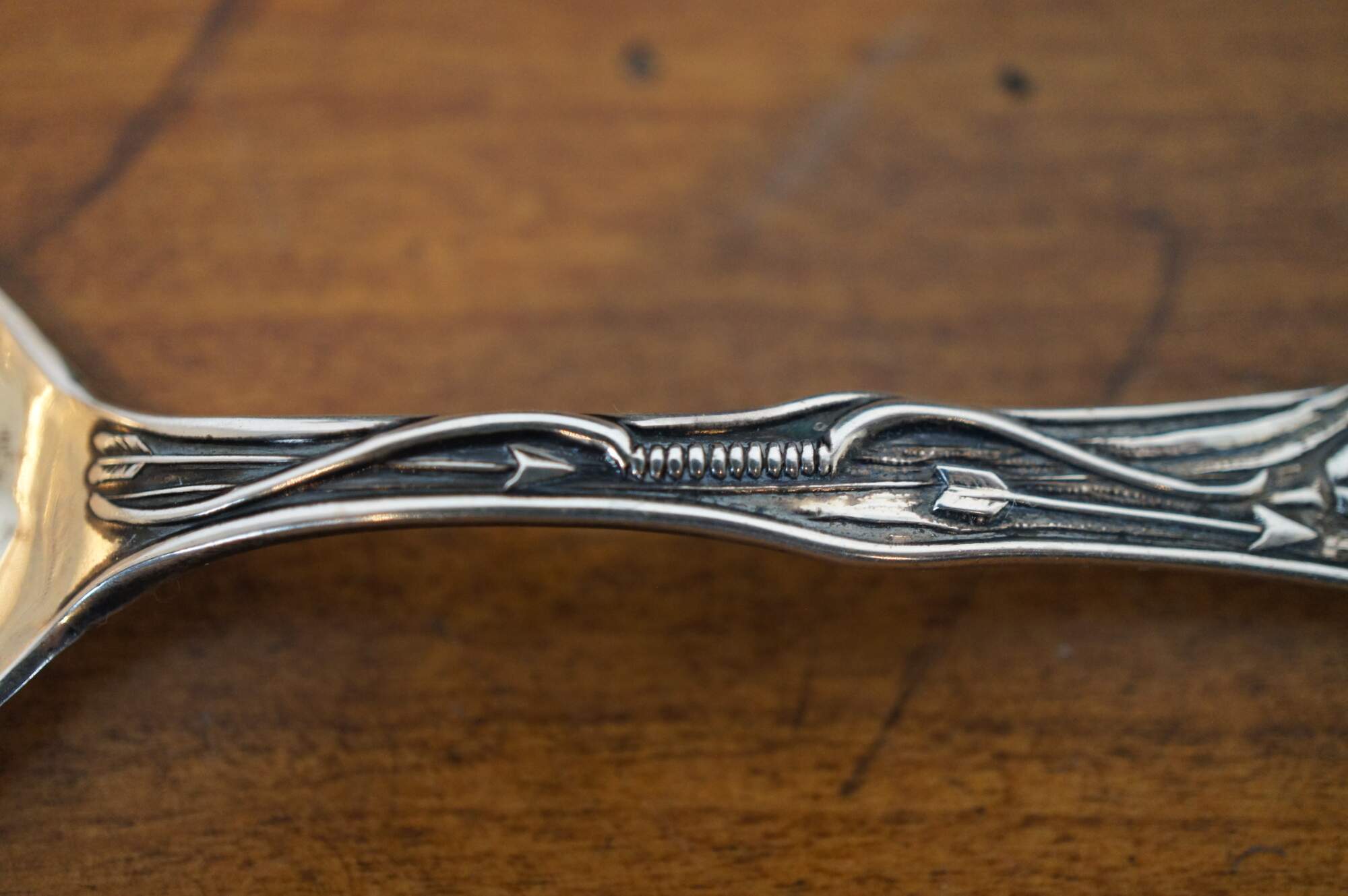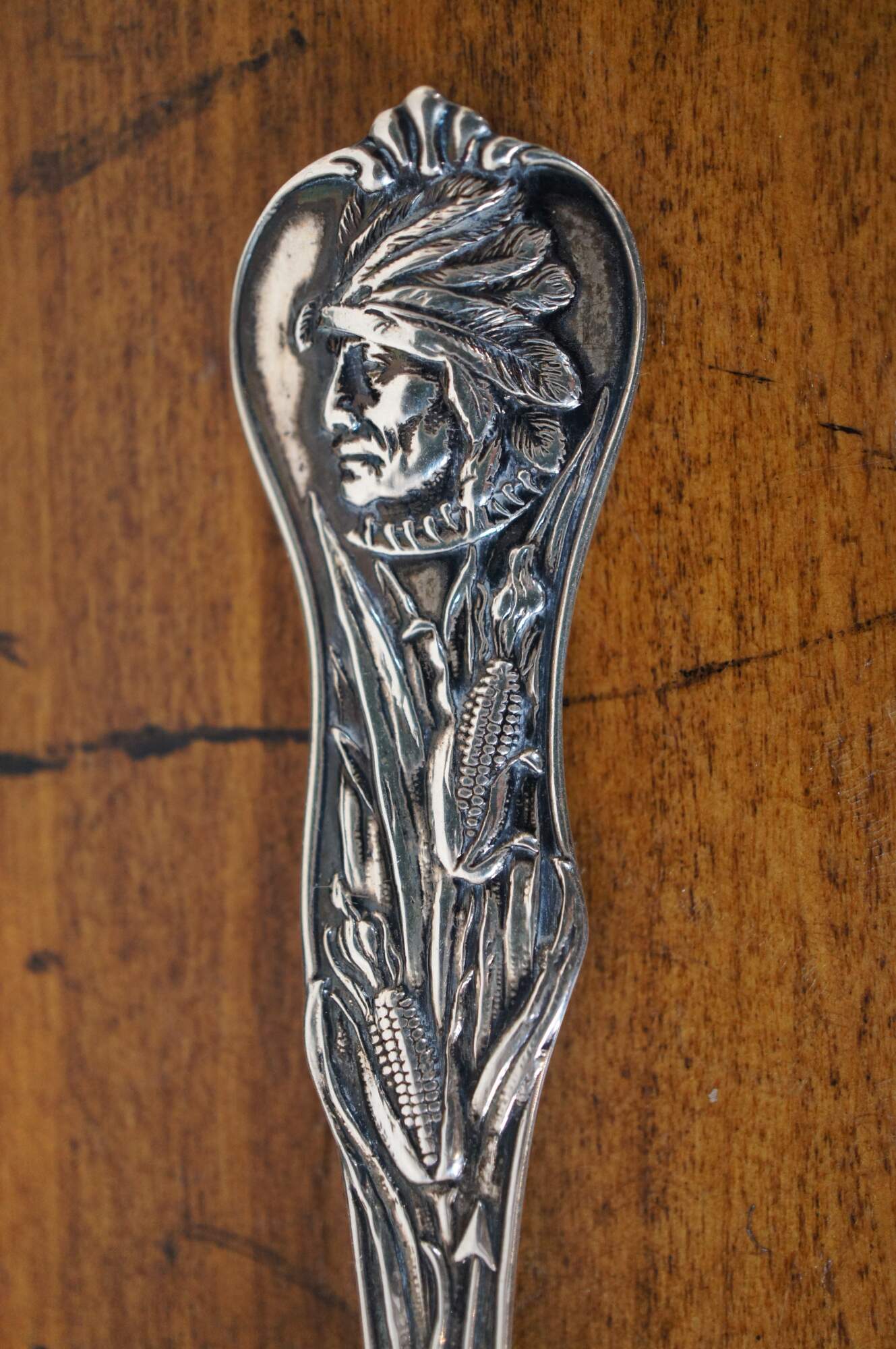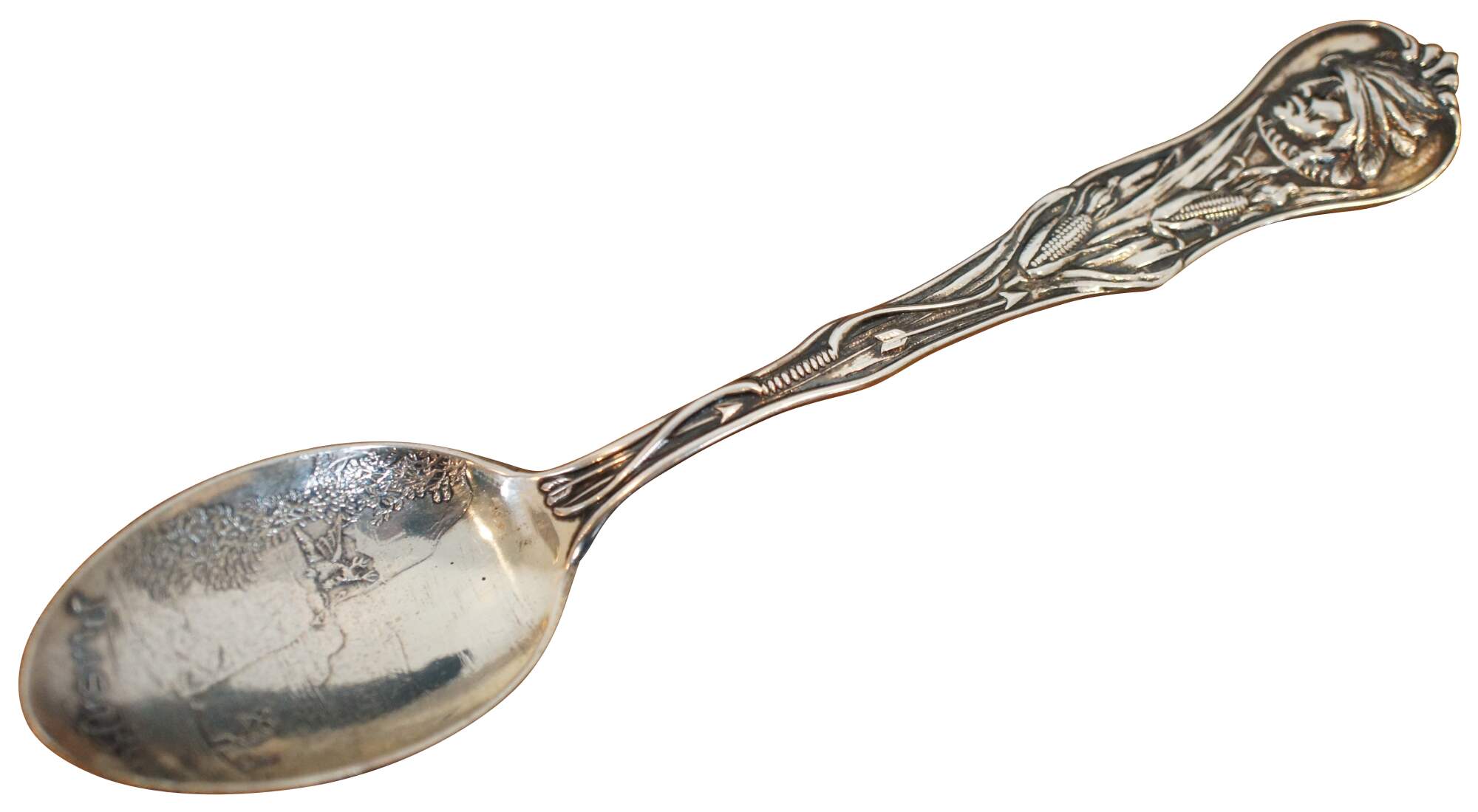 Antique late 19th century sterling silver souvenir spoon by Mechanics Silver Co, with a handle emblazoned with a Native American bust in feathered headdress, corn stalks, bow and arrows. The bowl depicts a scene of two Native American’s encountering Illinois’ mythical Piasa Bird perched on a cliff.