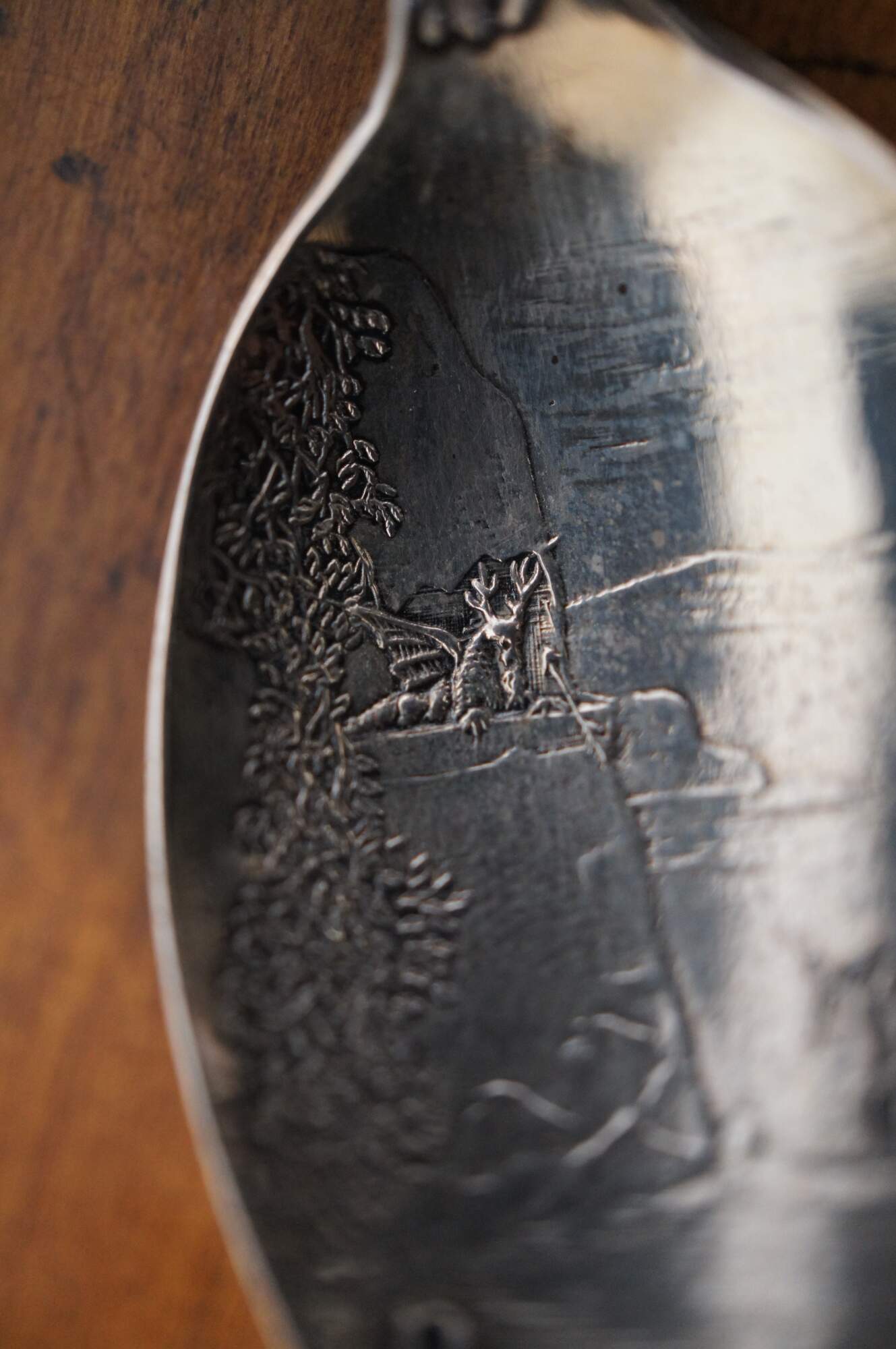 In this period the firm produced hundreds of sterling souvenir spoons depicting a variety of subjects.