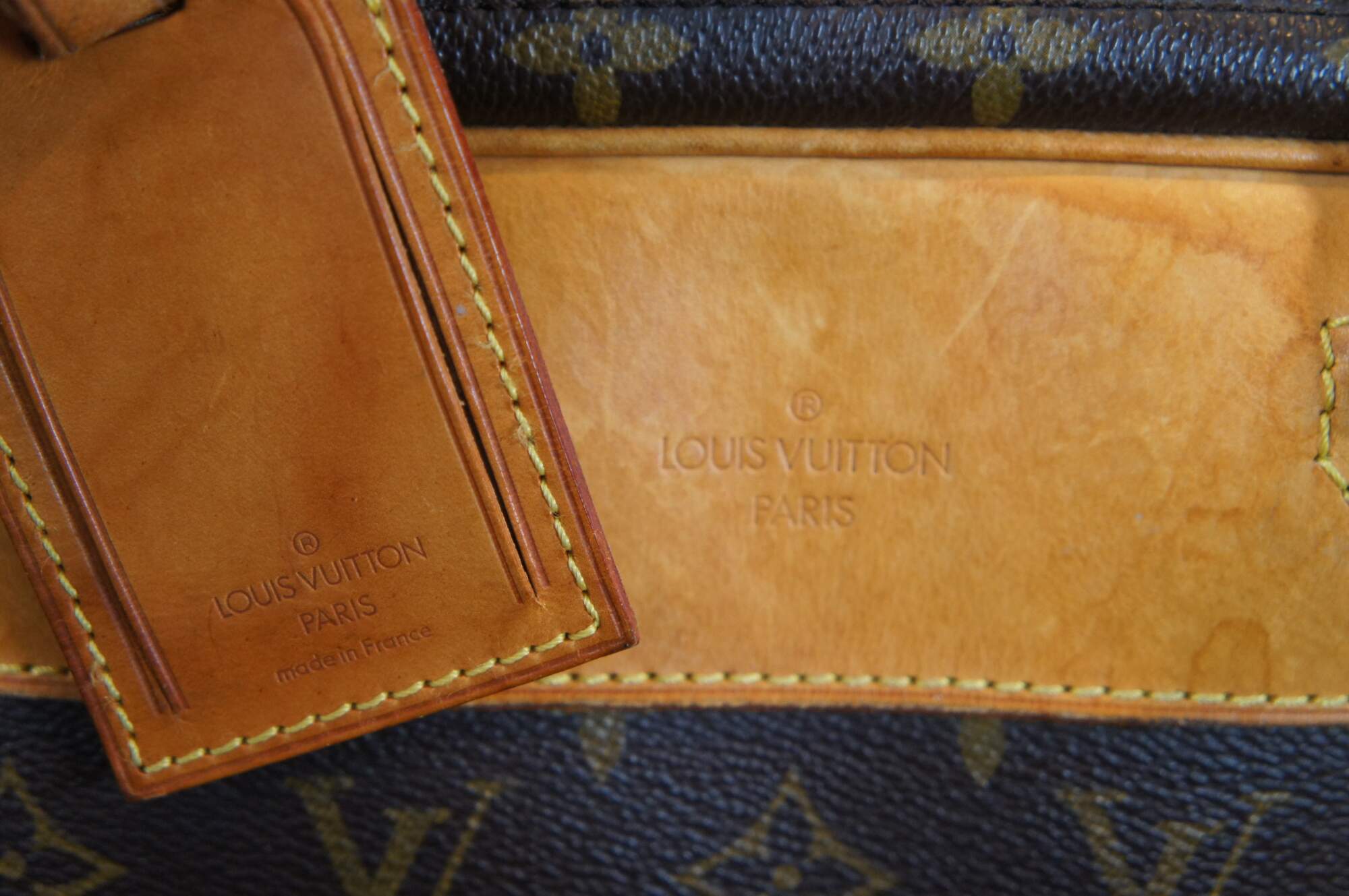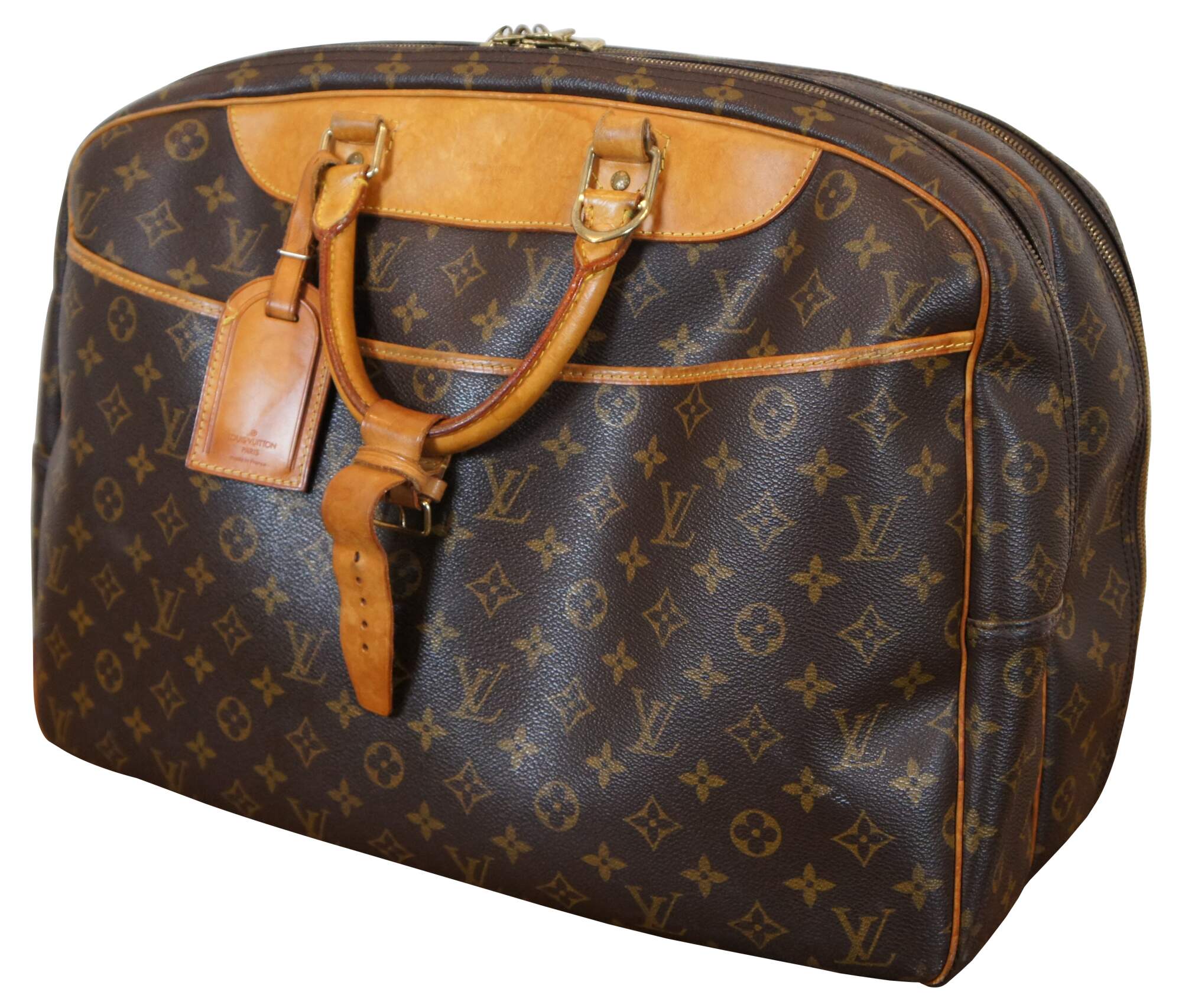 Louis Vuitton Paris Alize 24 Heures Monogram Travel Bag in the classic monogram pattern that features round top handles and gold-toned hardware. It is designed with a convenient front slip compartment. The bag opens up to 2 large compartments, both with 2-way zip fastening, with an internal pocket in each. It comes with a detachable and adjustable shoulder strap. Marked VI 0928. Made in France, February 1998