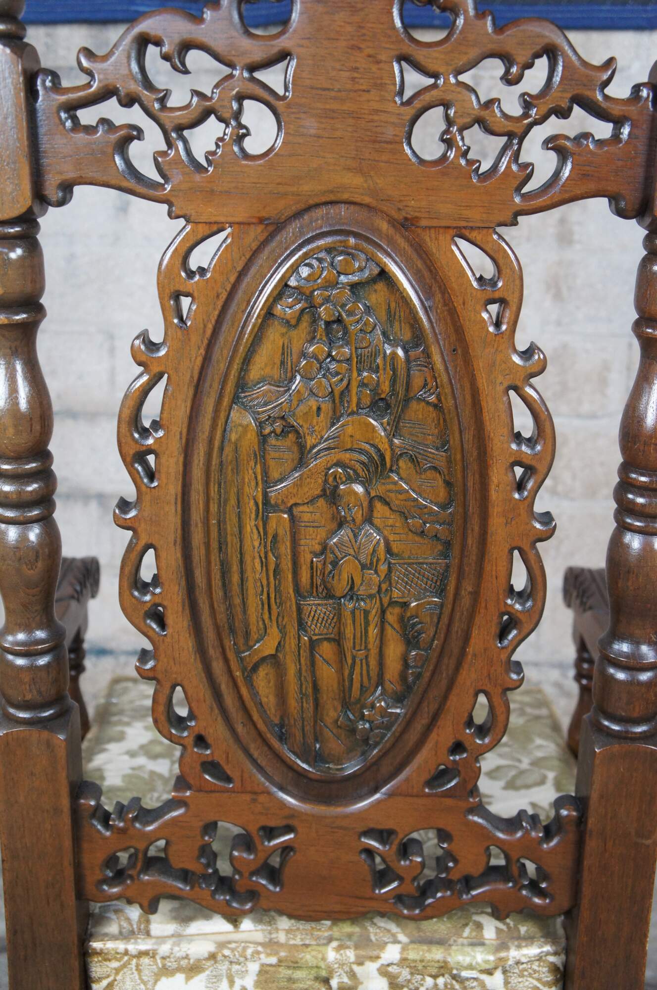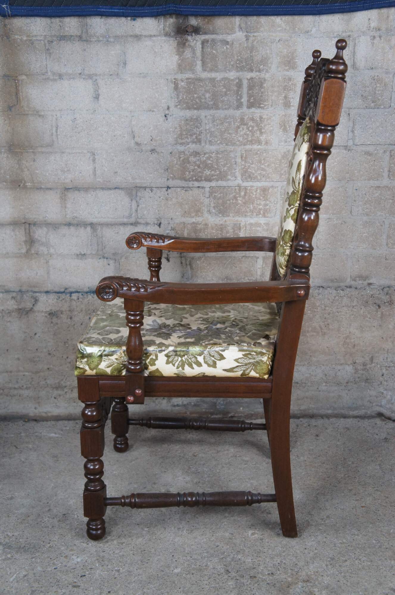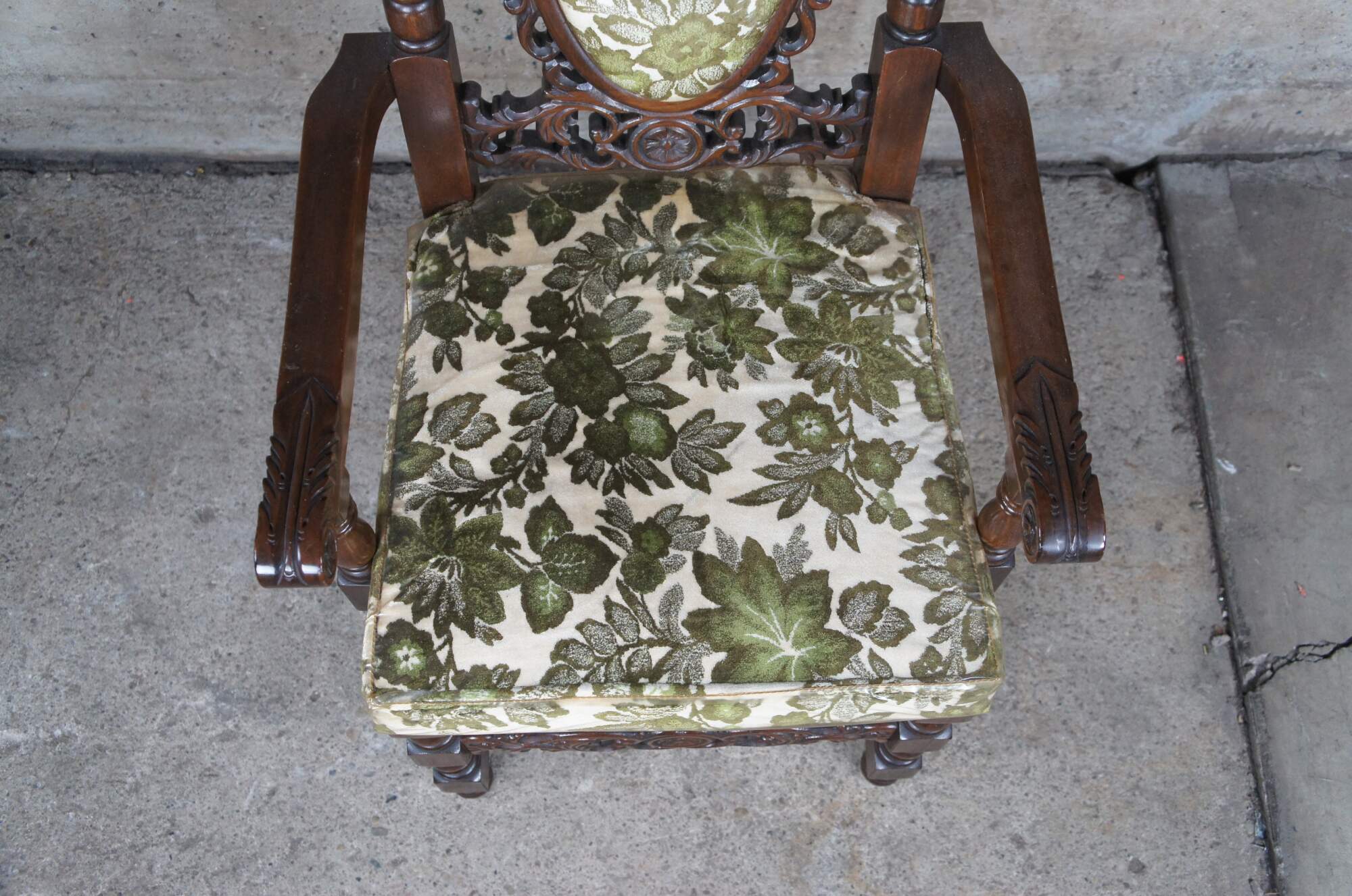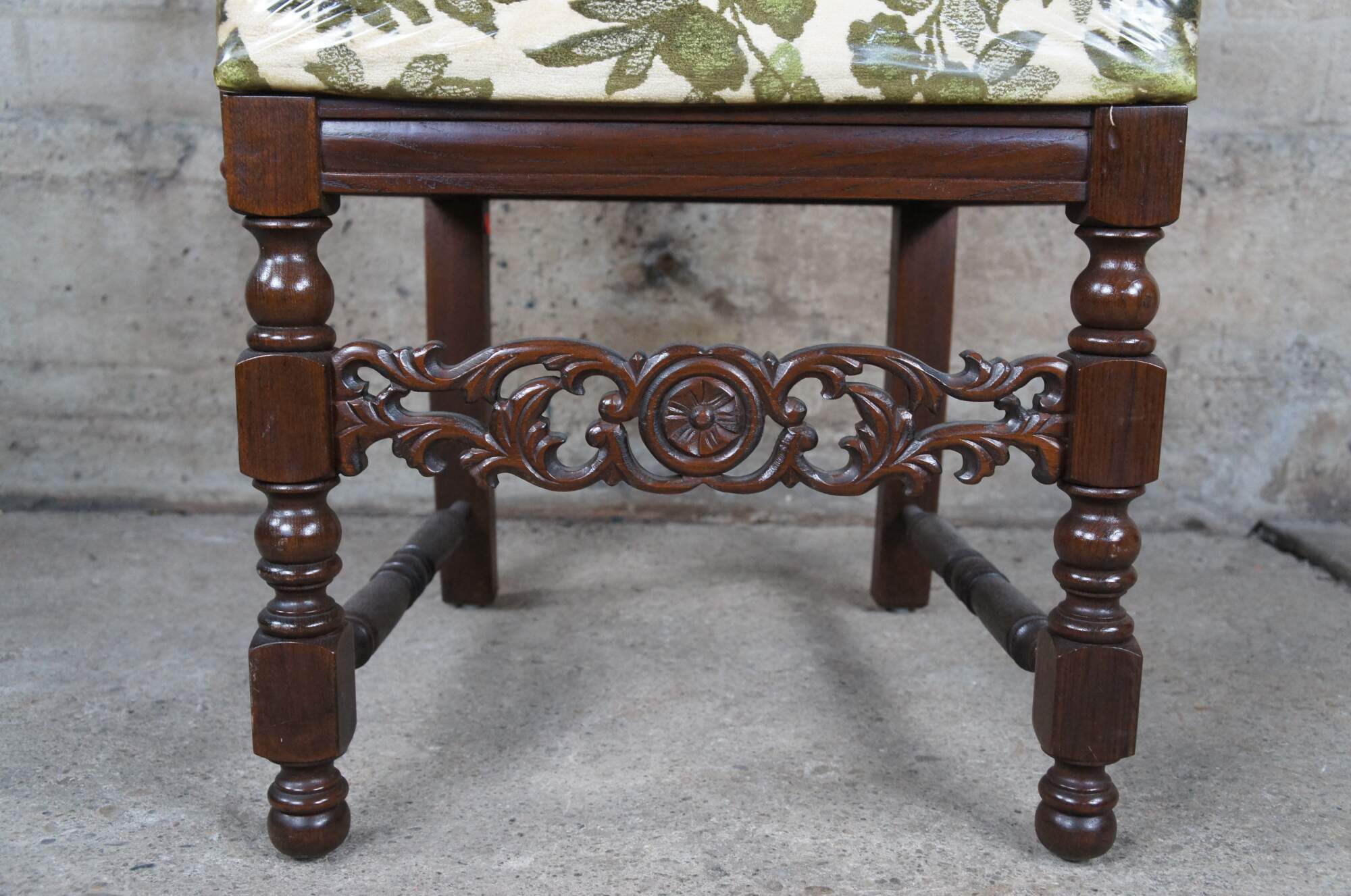An impressive set of 8 Charles II or Carolean style dining chairs made in Okinawa Japan, circa 1970s. Hand crafted from oak with an oval upholstered back centered between turned stiles and surround by beautiful filigree carvings that are matched along the front strecher of each chair. Upholstery is original with a green leafy design. The fabric is still wrapped in the original plastic which could always be removed.