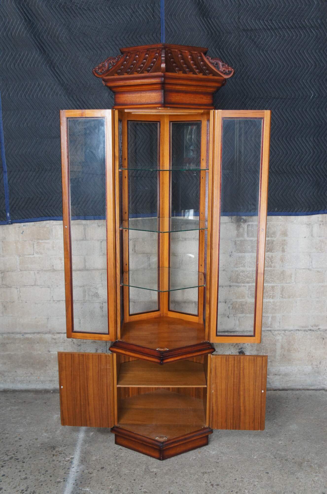 An impressive pair of oriental chinoiserie hexagonal vitrine cabinets made in Okinawa Japan, circa 1970s. Made from red oak with three adjustable glass shelves, a pagoda form dragon carved crown and lower storage cabinet with shelf featuring low relief figural geisha scene carved door panels. Doors open via brass pulls. Interior is illuminated at the top enhancing the display of keepsakes.. Each cabinet dissasembles into three pieces for ease of transport.