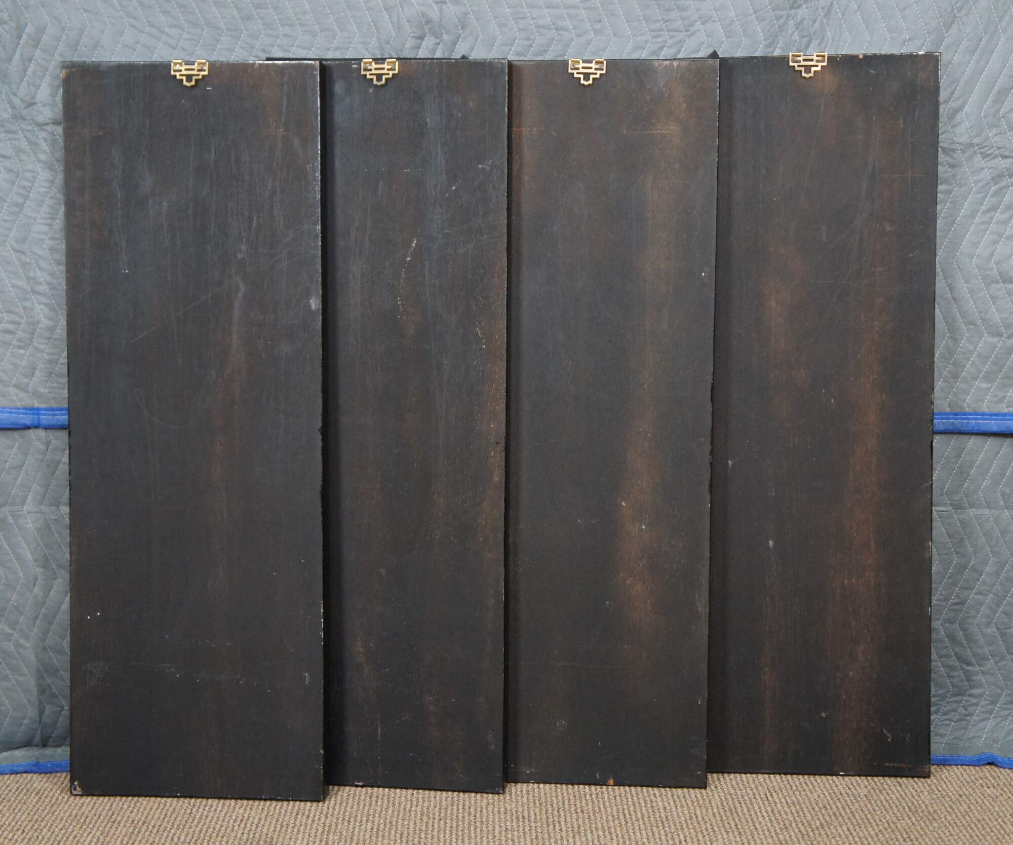 Set of four mid 20th century Japanese Chinoiserie panels in black lacquered wood with gilded backgrounds, featuring pairs of female Geisha figures in traditional attire holding scrolls, tea sets, instruments, fans, under a variety of trees, delicately carved from soapstone, coral, malachite and other semi-precious stones.