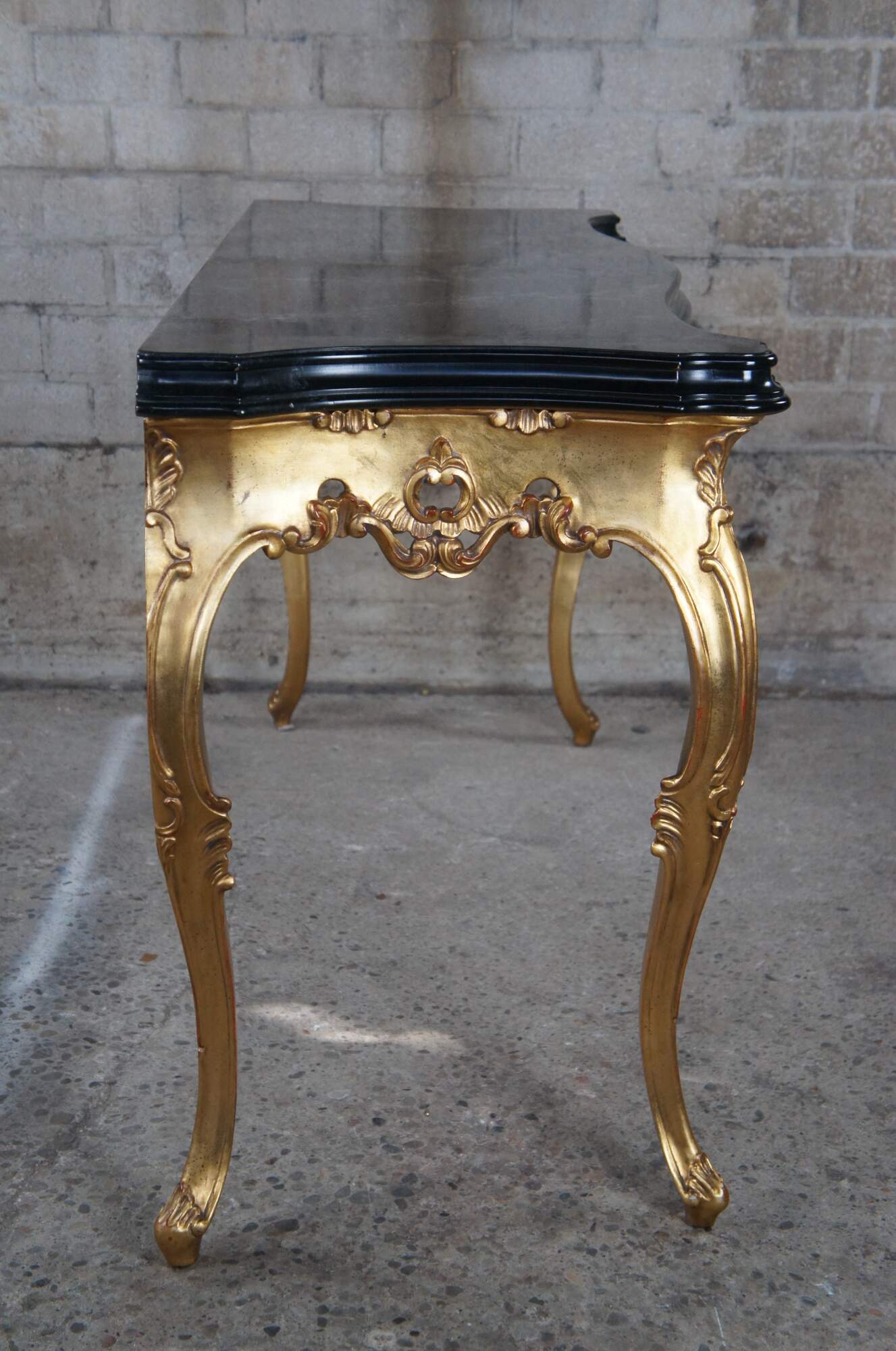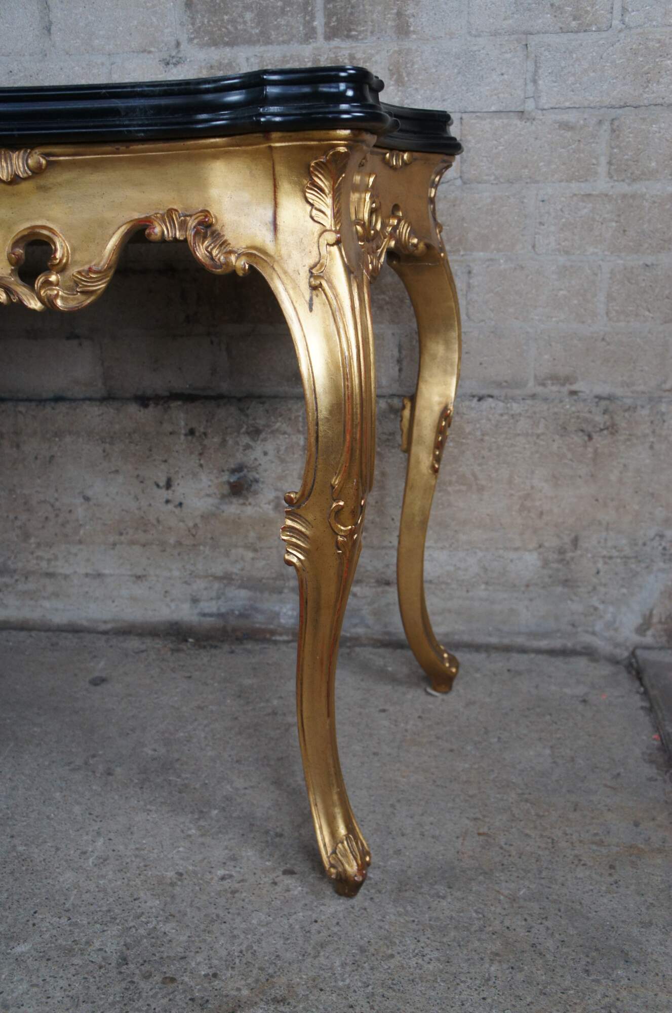 Late 20th century Rococo style console or hall table. Features a serpentine form with faux marble top, a scalloped and pierced giltwood frieze and scalloped legs with acanthus feet. Marked along back side "made in Italy