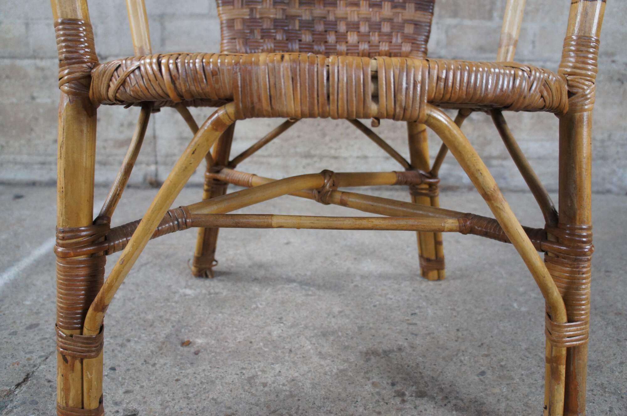 Antique bamboo and woven wicker / rattan armchair featuring rounded bentwood back with geometric woven patterns