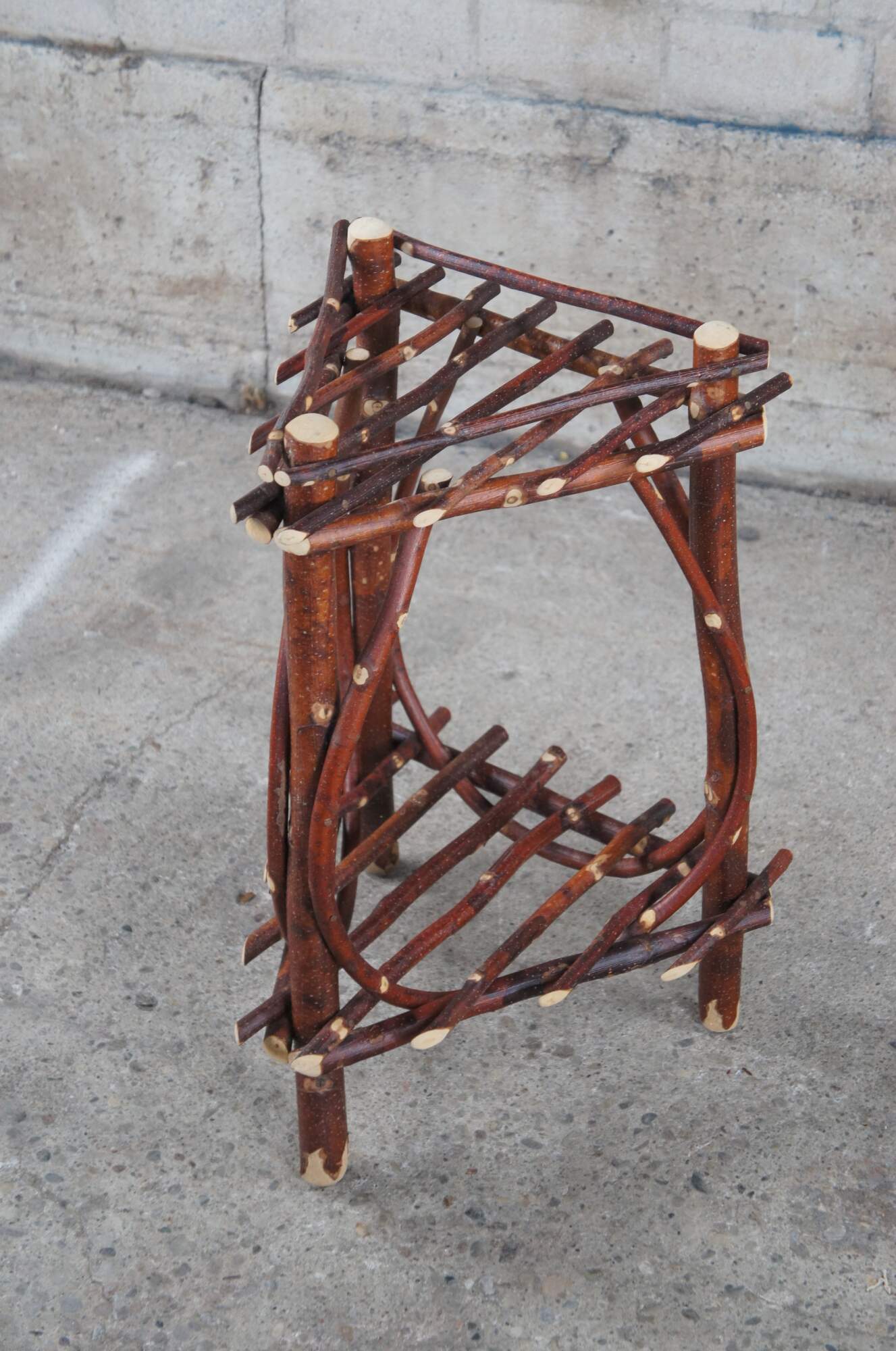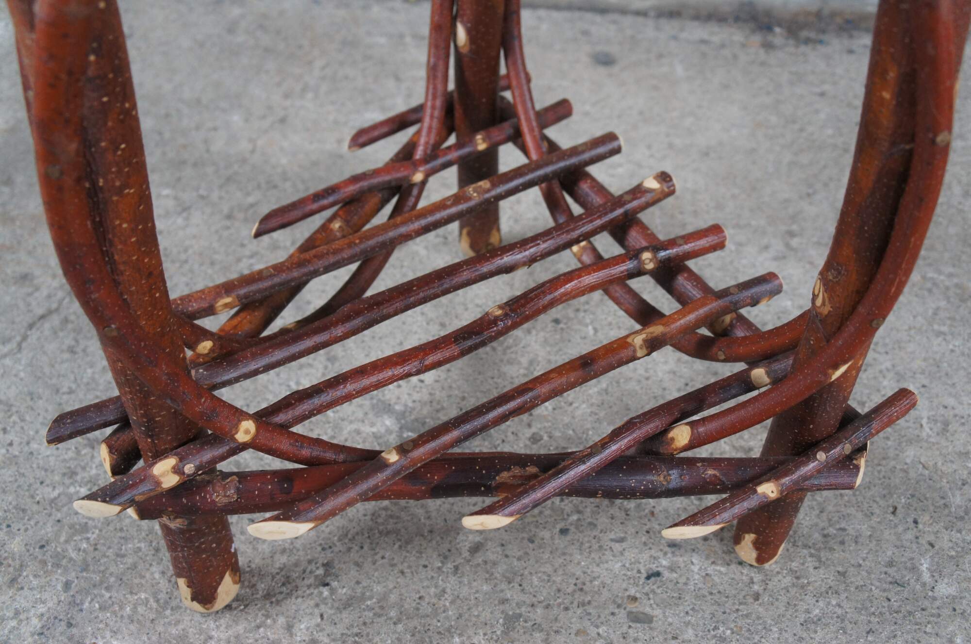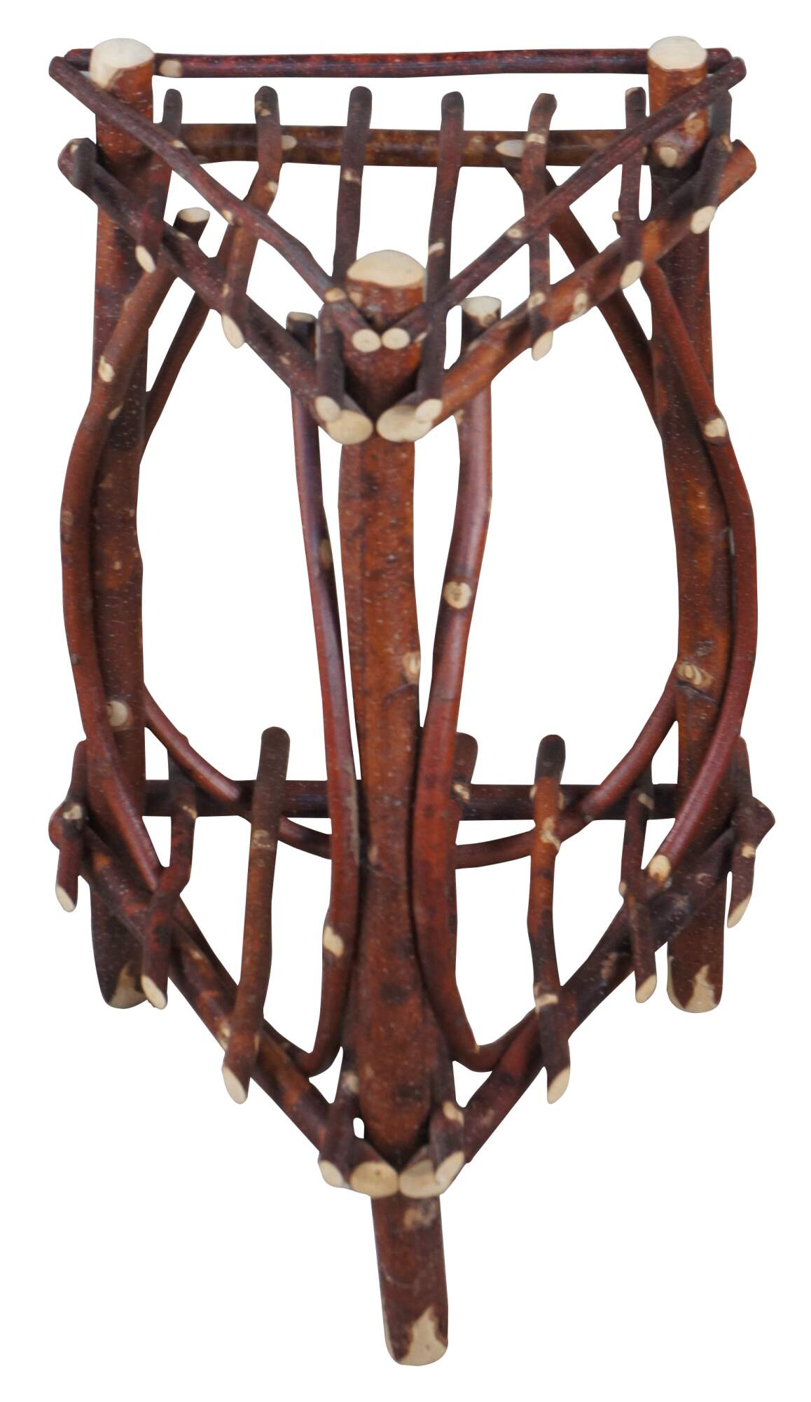 Vintage adirondack stick or twig table featuring triangular form with two tiers, upper gallery, and bentwood accents.